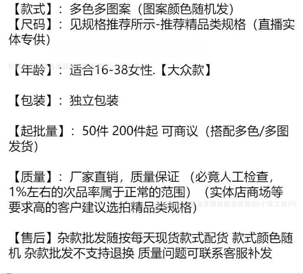 We warmly welcome merchants to come in person to negotiate, inspect the goods, and pick them up! Colors and patterns are constantly updated. Due to the large volume of shipments, it is impossible to keep everything synchronized. Everything is subject to the actual goods. Those who are cautious should be careful when shooting. The pictures on the Internet cannot be used as a reason for returns and exchanges! Thank you for your support! Because the price is low, we do not provide refunds for quality issues. Only those clothes with serious problems can be exchanged or returned. You cannot return for reasons such as not liking, uneven thickness of the fabric, poor sales, not beautiful, not happy, lazy to open the outlet, no longer doing, the logistics is not fast enough, 7 days without any reason to return, etc. Please place your order according to your ability. Those who cannot accept it should be careful when shooting! Contact phone: 18127330087