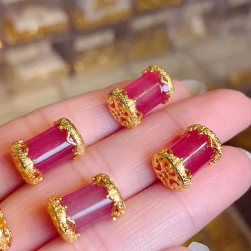 Imitation tourmaline barrel beads with gilded carved flowers, a collision of ancient charm and delicacy. The soft pink and purple tone is both warm and eye-catching. It's perfect for wearing as a bracelet or weaving into a wreath. Wearing it on the wrist, the Chinese romance is directly filled to the brim. Who has moved the DNA of the national style?