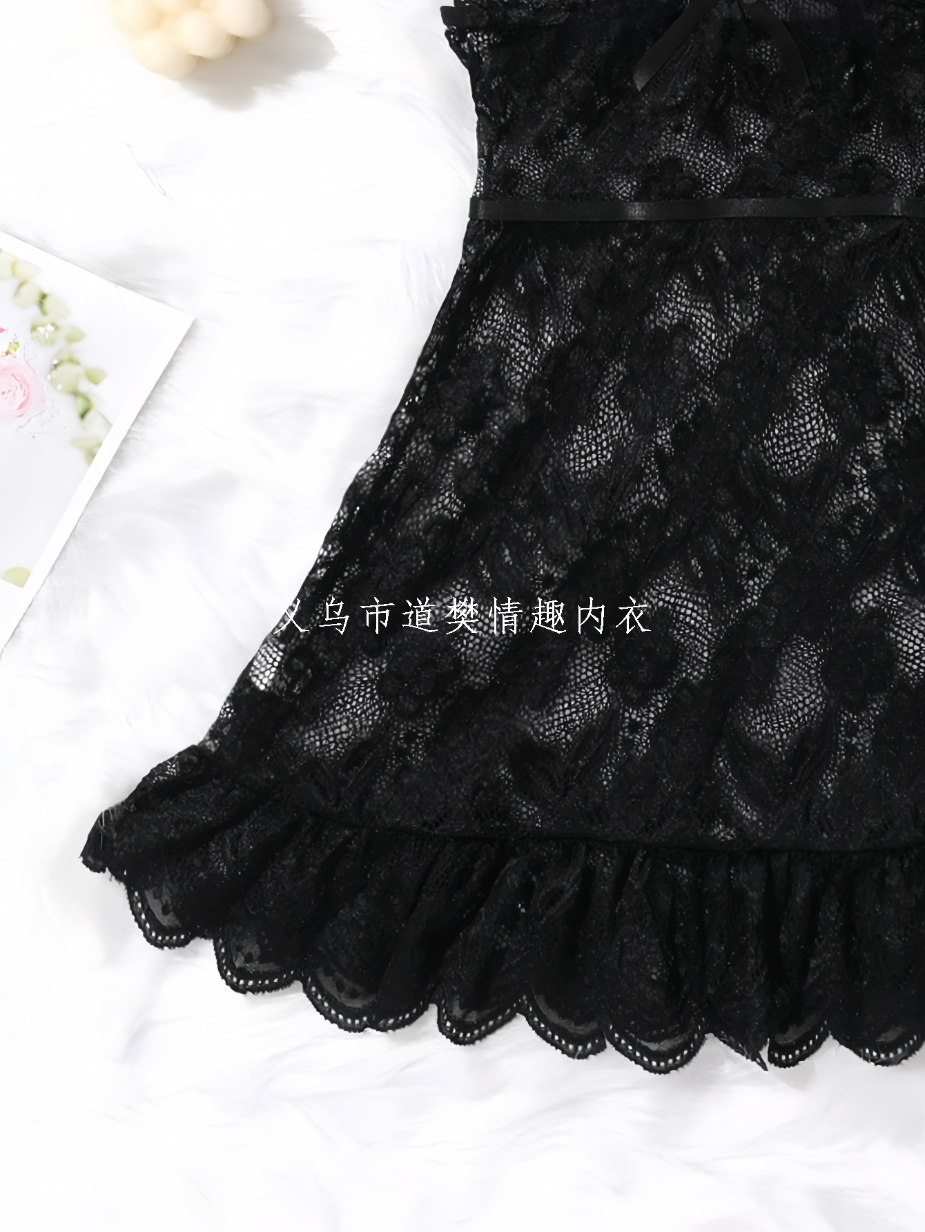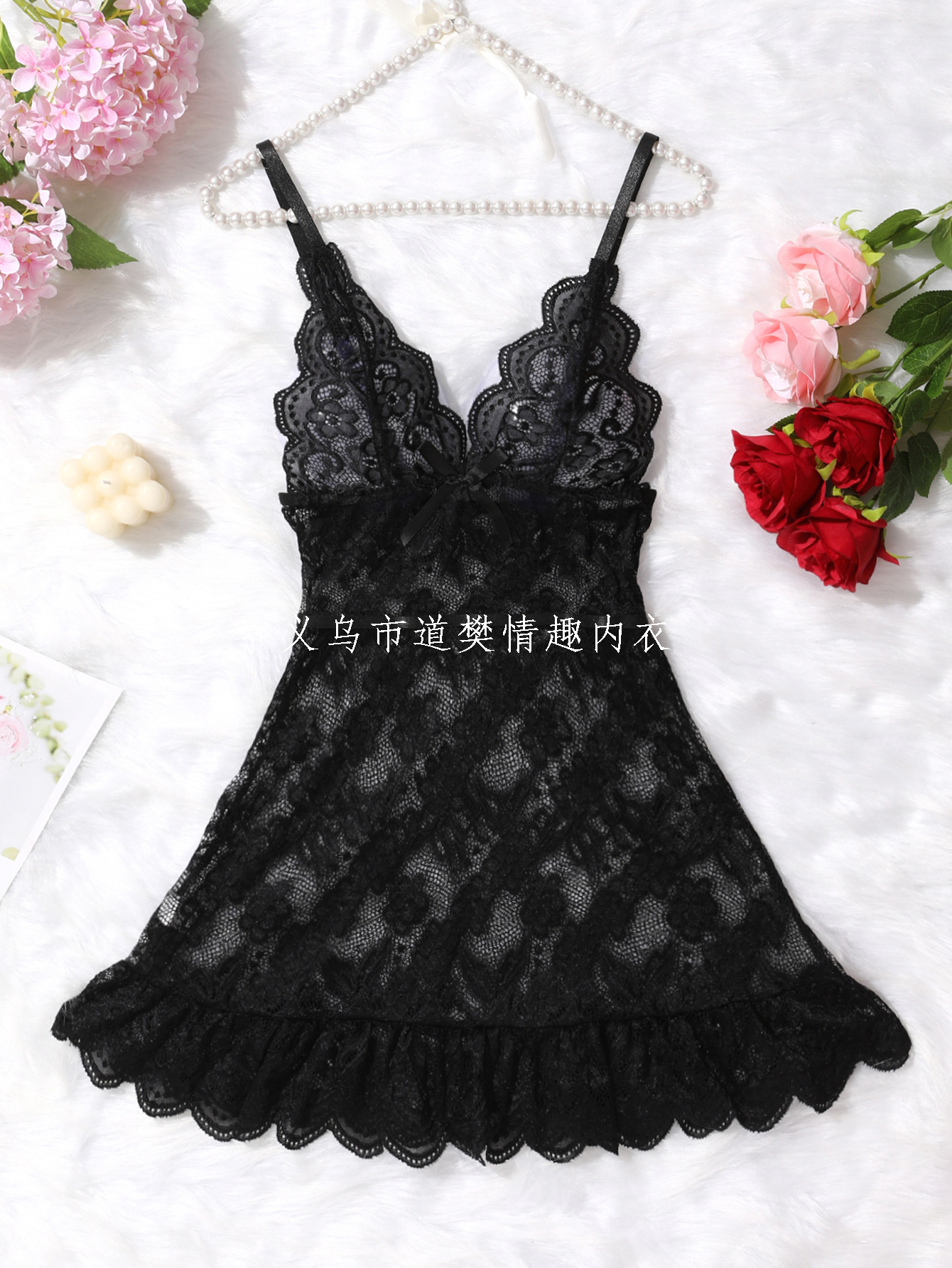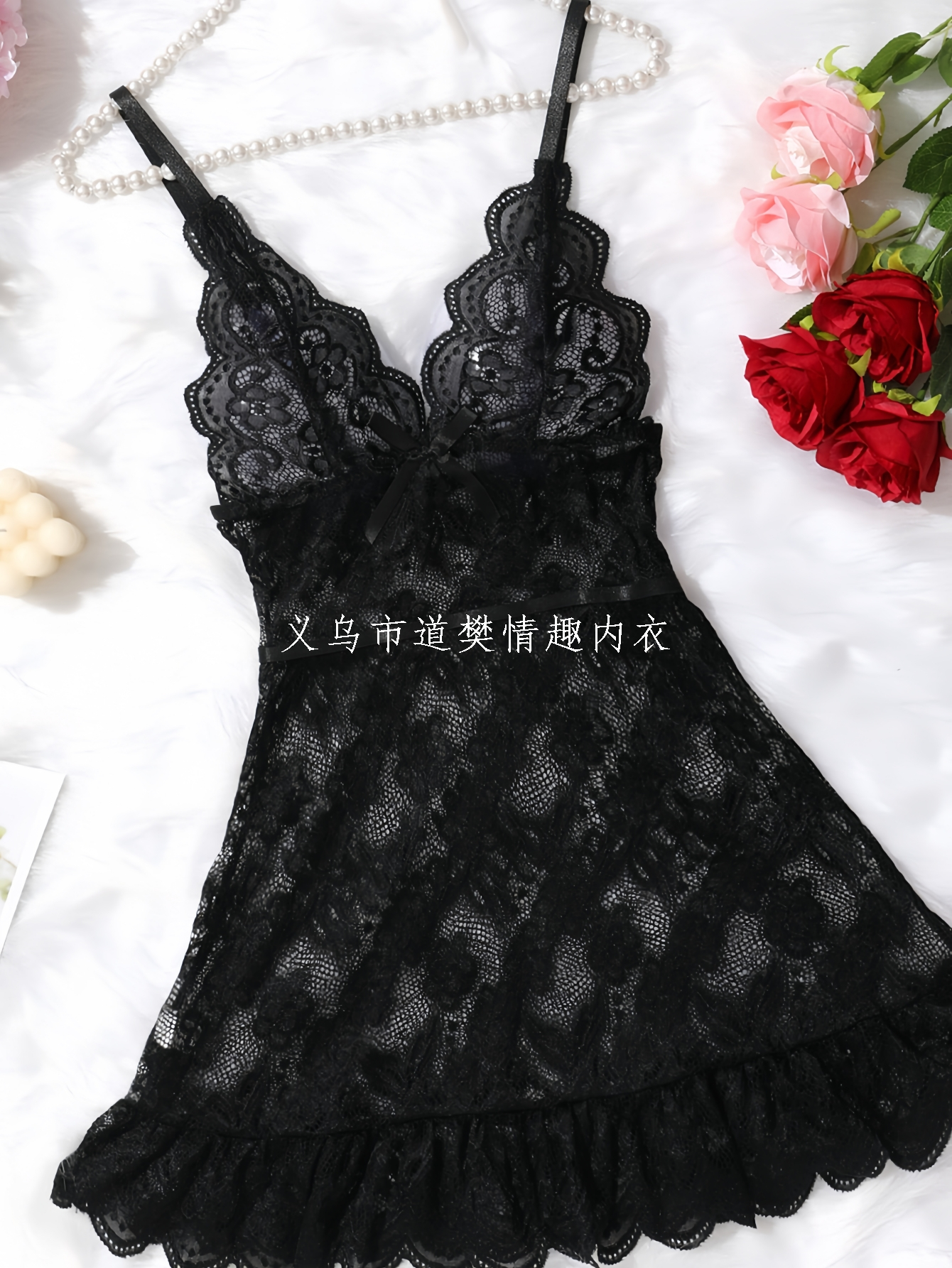 sexy lingerie, black sexy bow printed waist-controlled lace stitching dress nightdress suspender skirt 中文版
