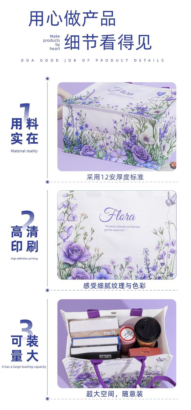 flower room purple custom portable canvas bag three-dimensional canvas bag large capacity canvas tote bag custom large capacity 中文版