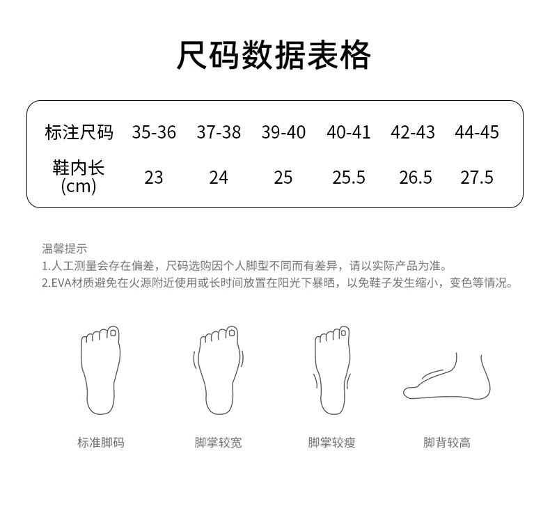 Warm Tip: EVA material slippers should be avoided from high-temperature exposure, as prolonged high-temperature exposure can cause the shoes to deform.