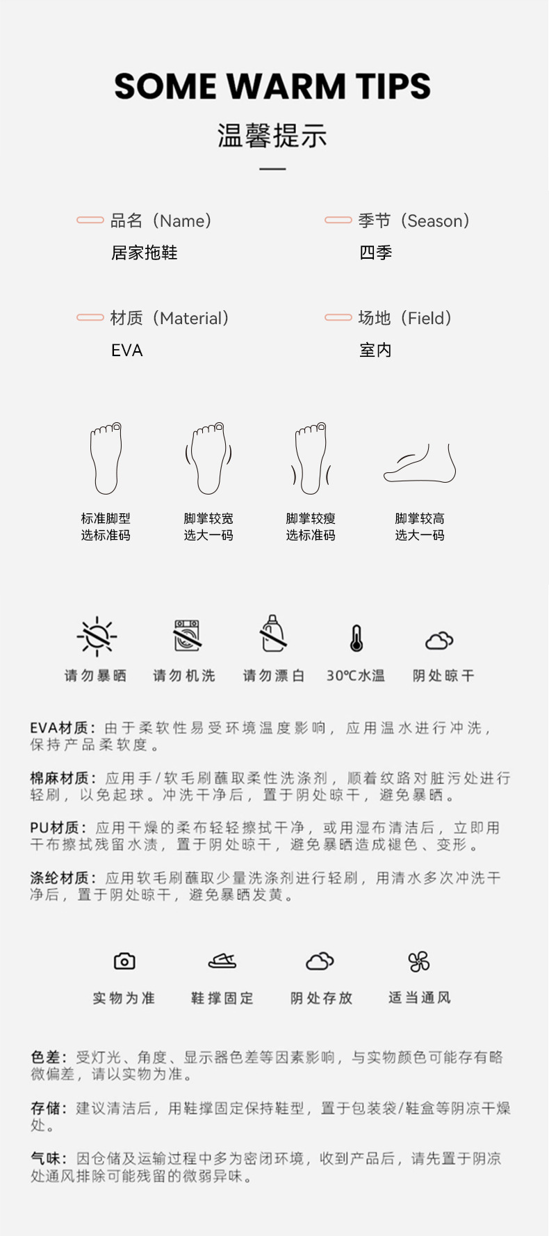 Warm Tip: EVA material slippers should be avoided from high-temperature exposure, as prolonged high-temperature exposure can cause the shoes to deform.