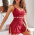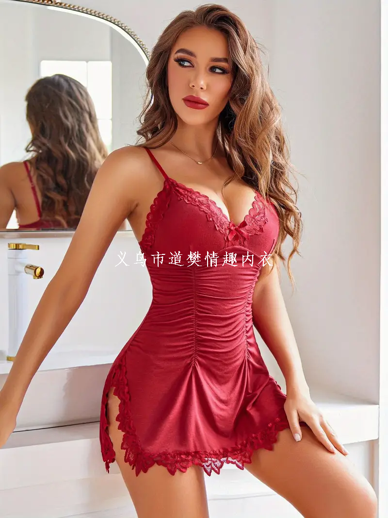 sexy lingerie, wine red pleated lace stitching double slit v-neck dress nightdress suspender skirt 中文版