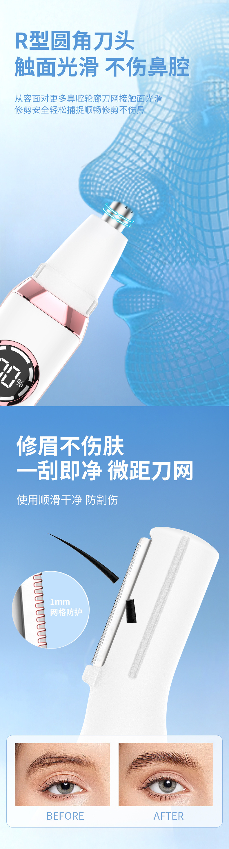packing: host + hair trimmer head + lip shaving cutter head + eye-brow knife head + nasal knife head + cutter head protective cover + usb charging cable + english manual + cleaning brush