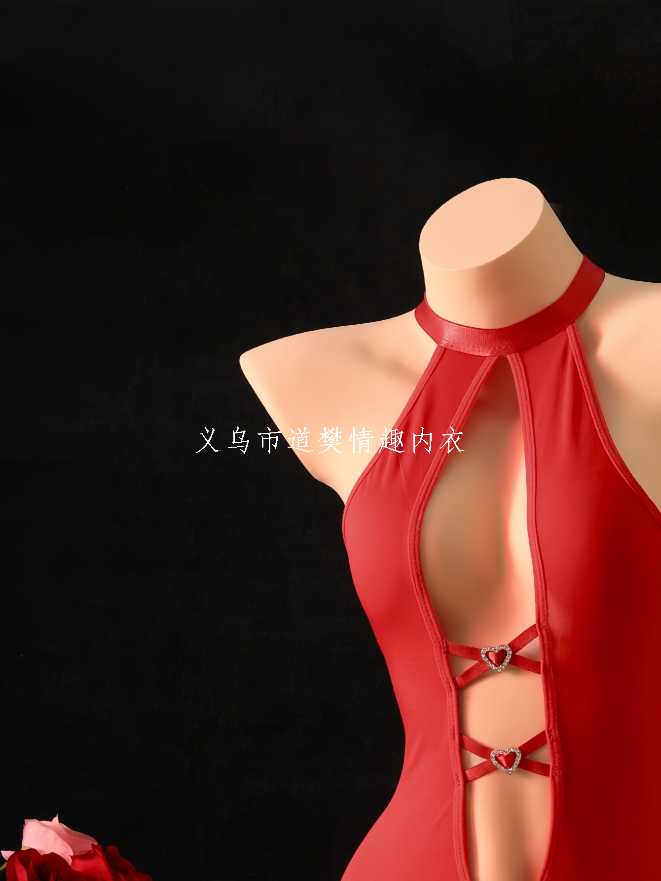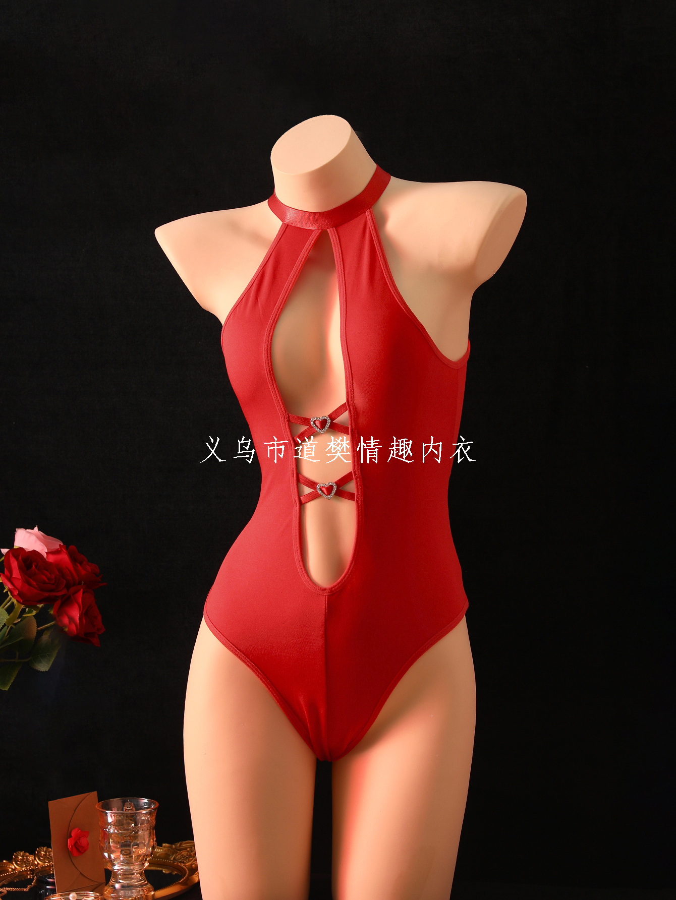 sexy lingerie, front cross with love back hollow-out halter red jumpsuit tights 中文版