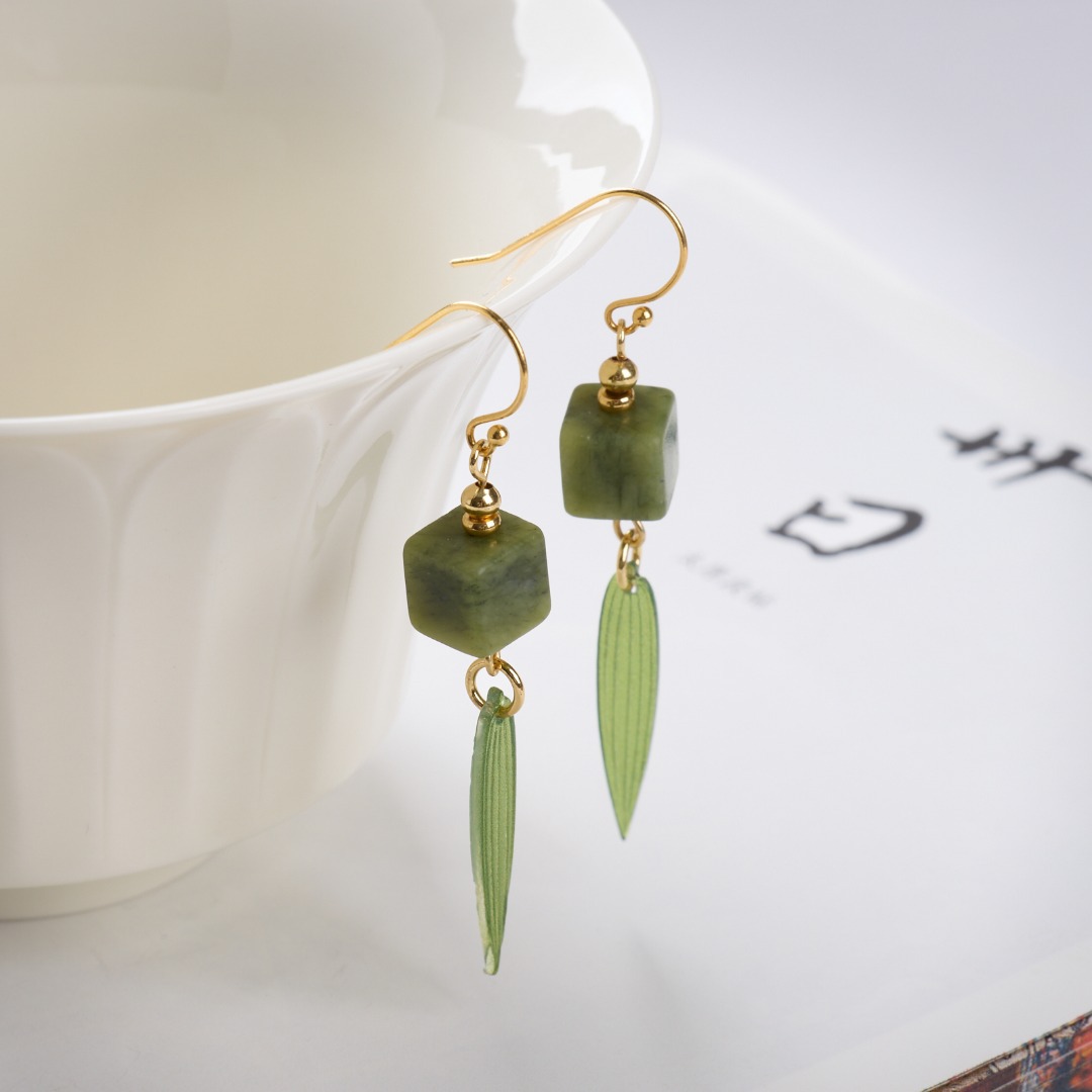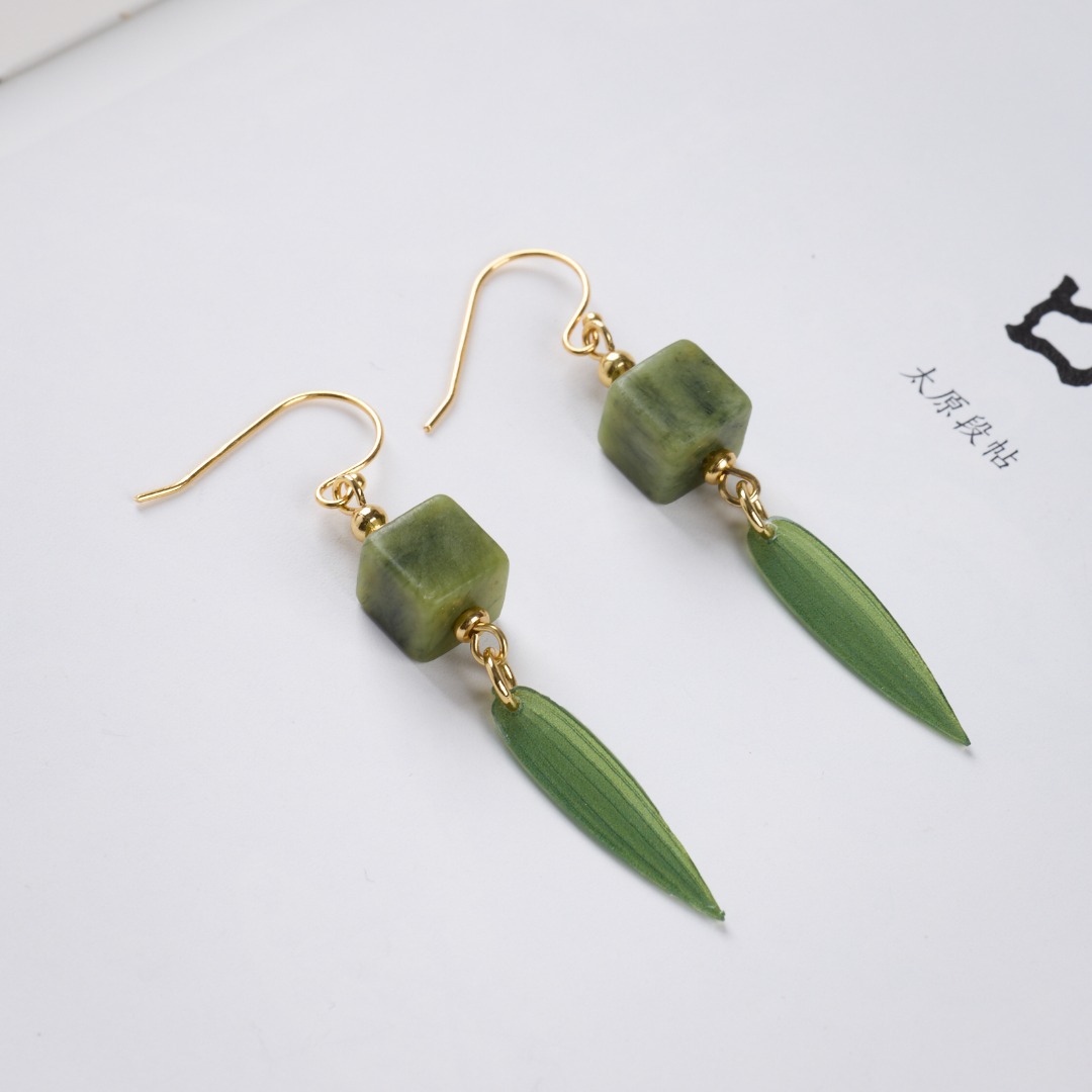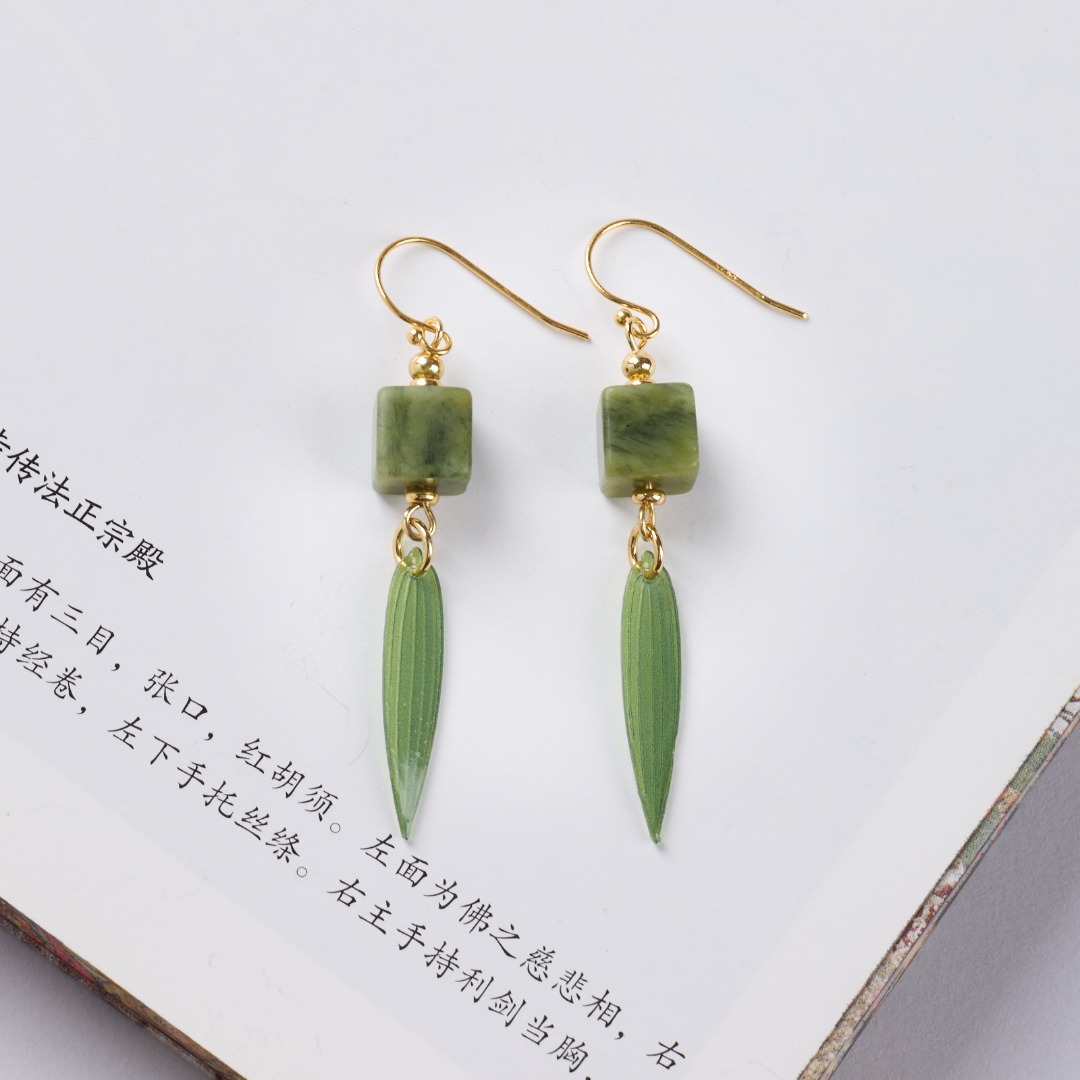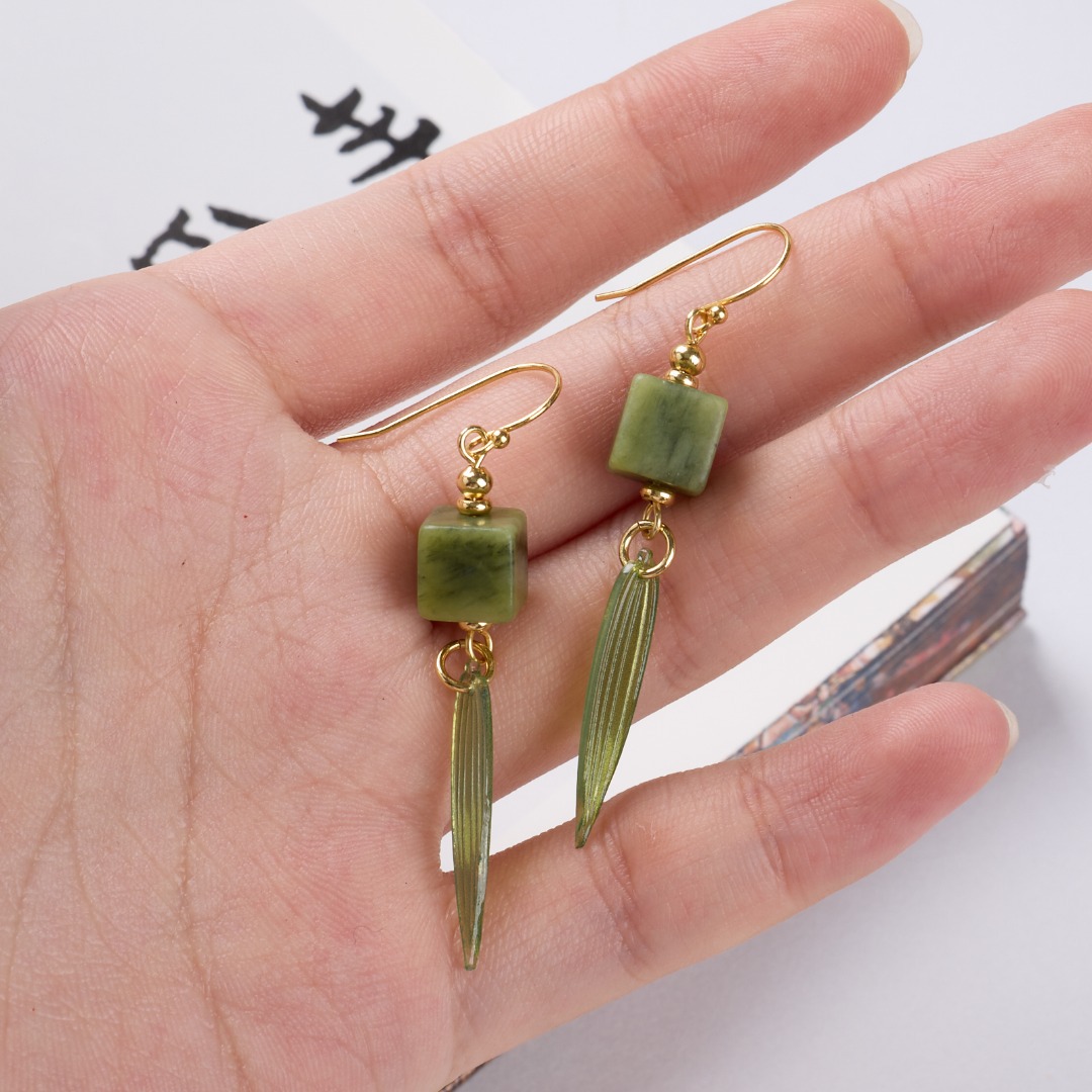 Name925 Silver Plated Gold Ear Hook, Southern Jade Square, New Chinese Style Bamboo Leaf Earrings"【Olive Jade】New Chinese Style Bamboo Leaf Earrings