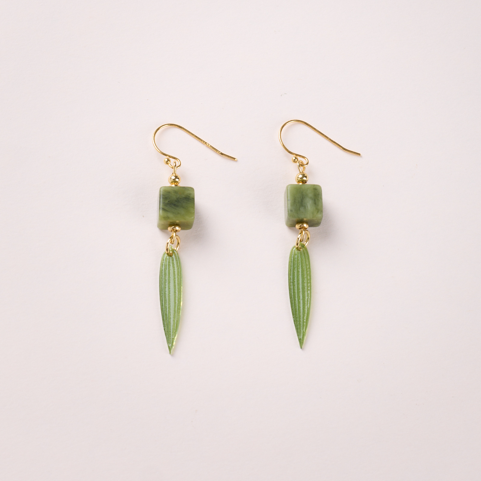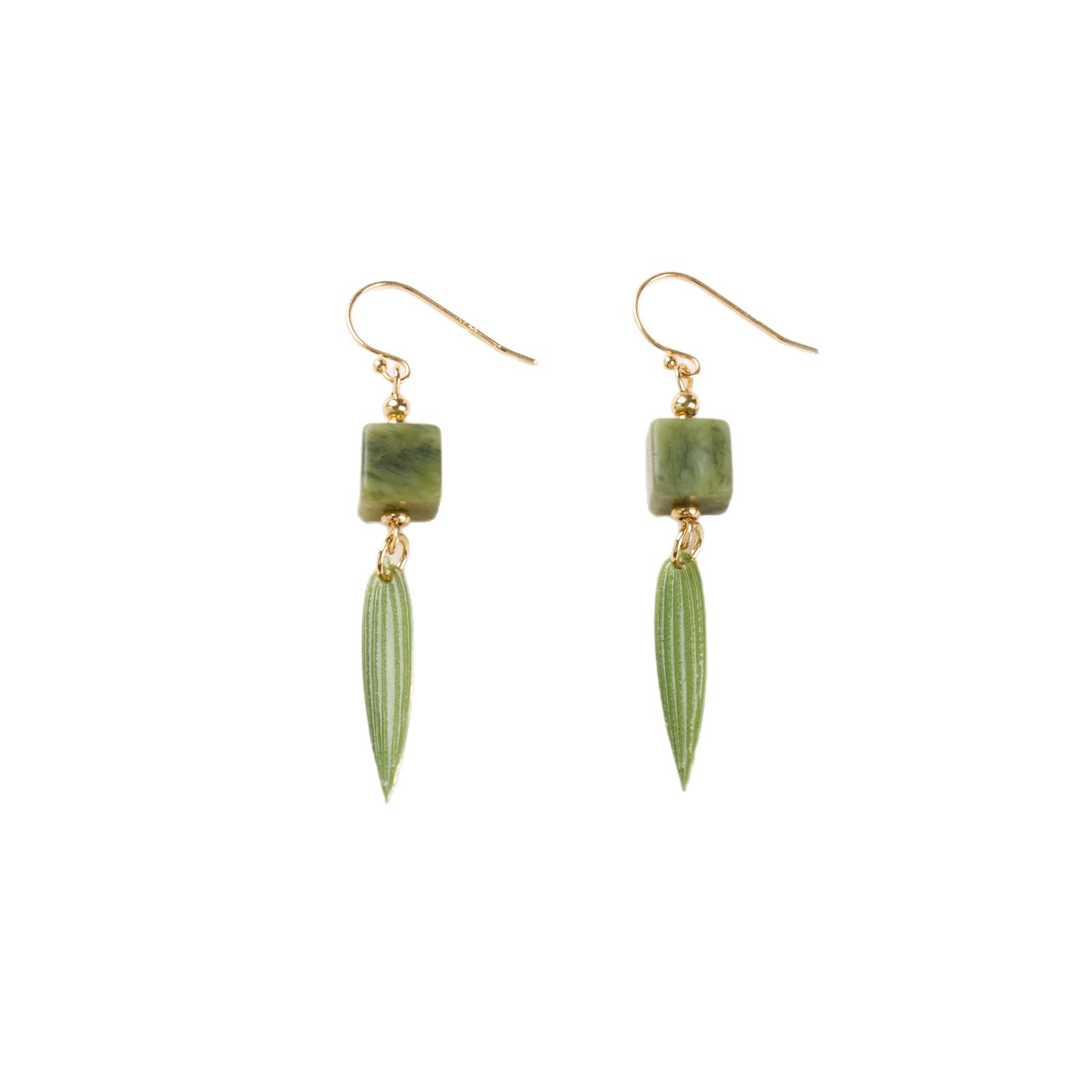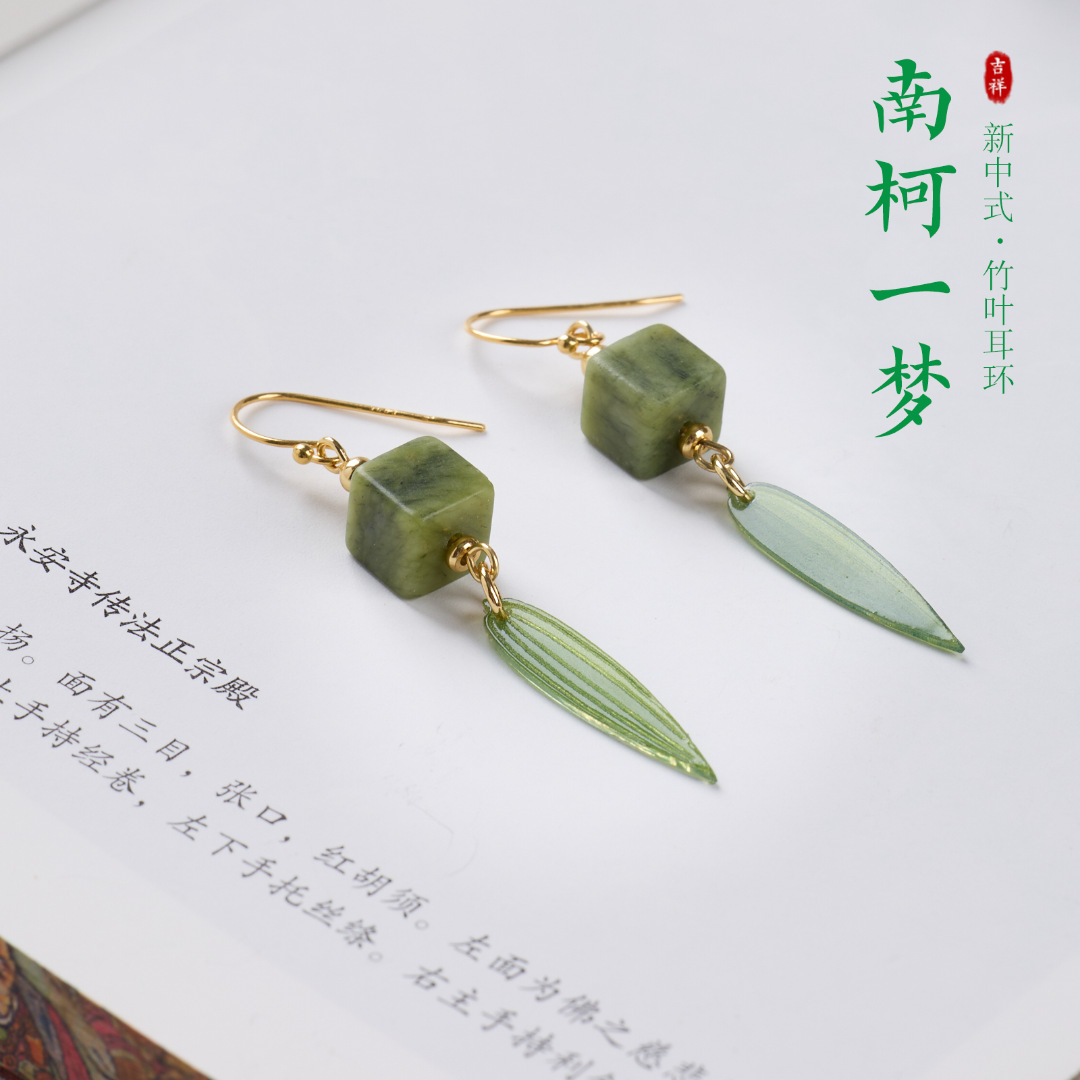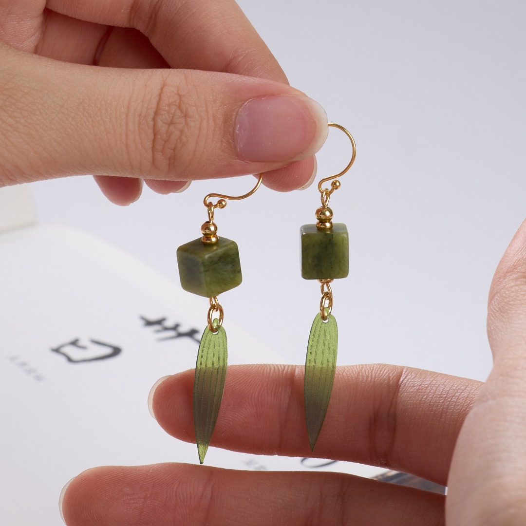 Name925 Silver Plated Gold Ear Hook, Southern Jade Square, New Chinese Style Bamboo Leaf Earrings"【Olive Jade】New Chinese Style Bamboo Leaf Earrings