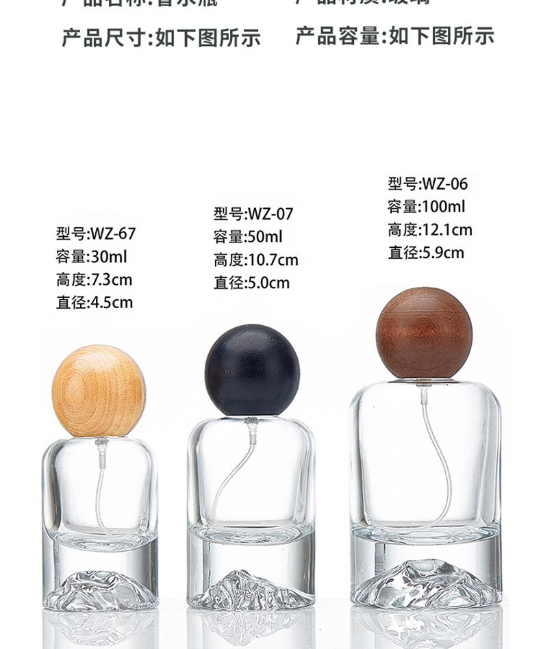 50ml; primary color wood ball cover + bottle + nozzle; glass