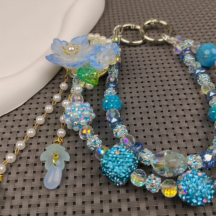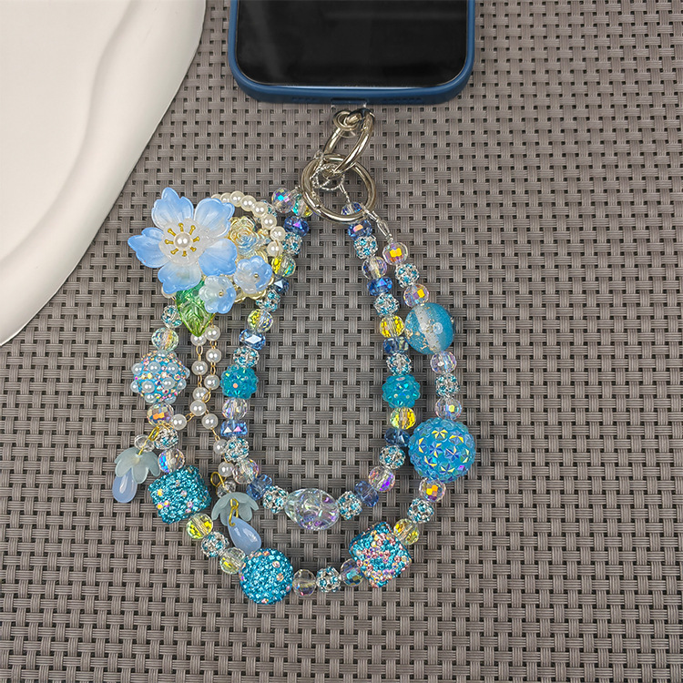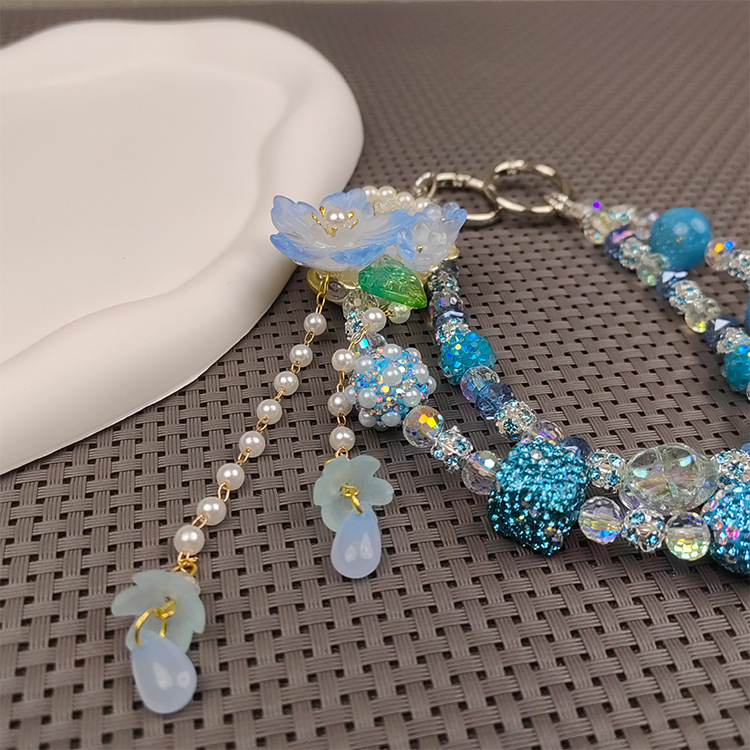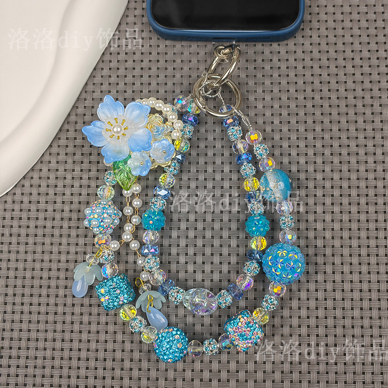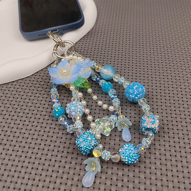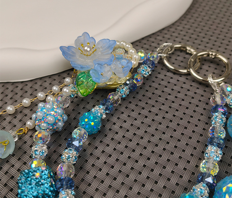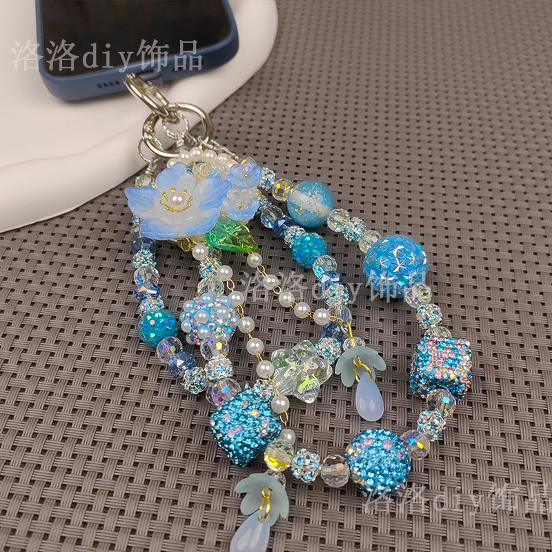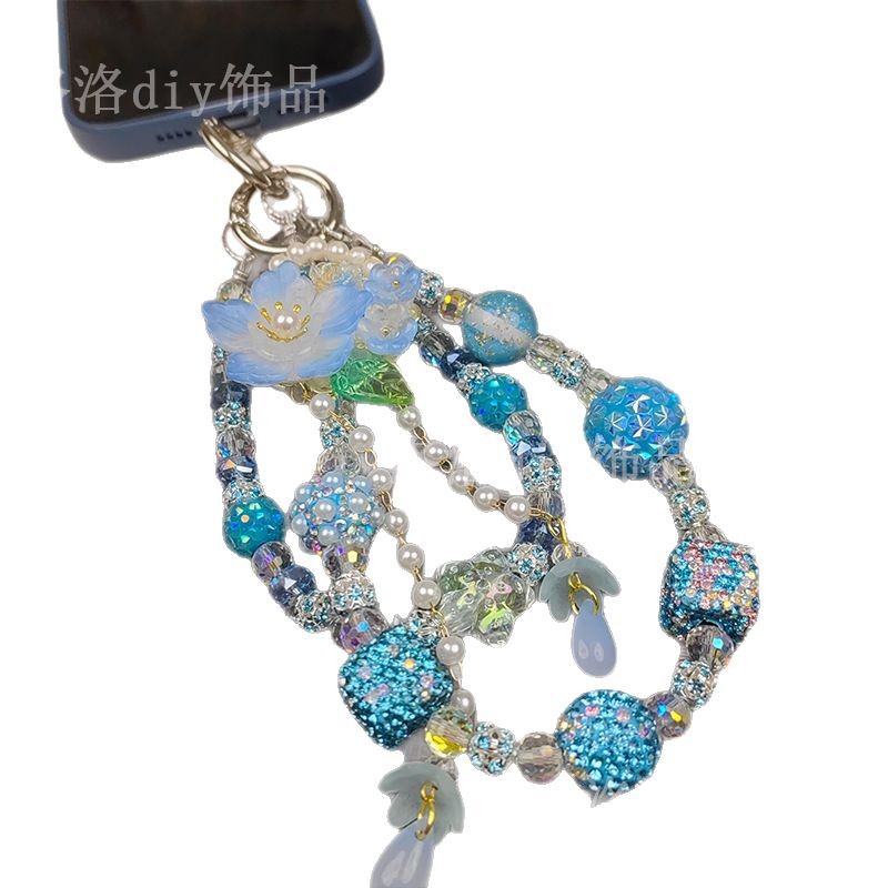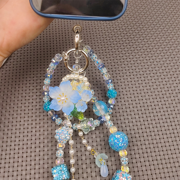 double chain rhinestone ball mobile phone charm beautiful ins live blind box fashion mobile phone charm blue color flower tassel mobile phone charm 中文版