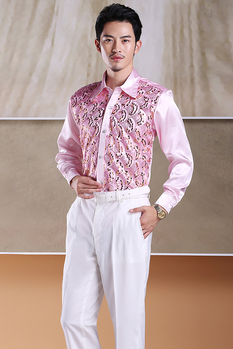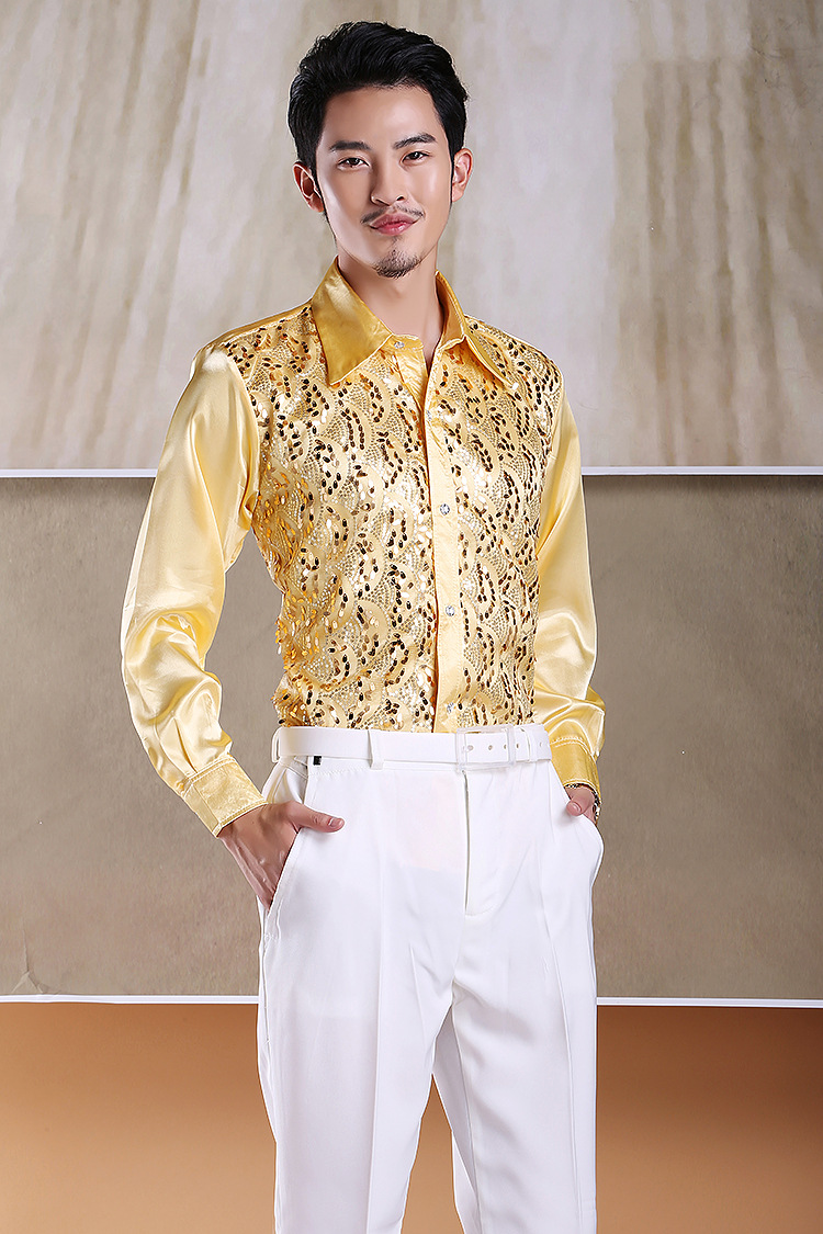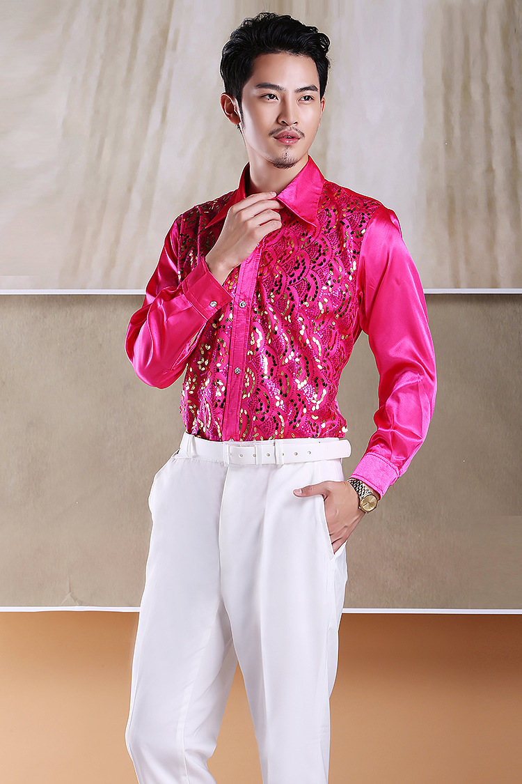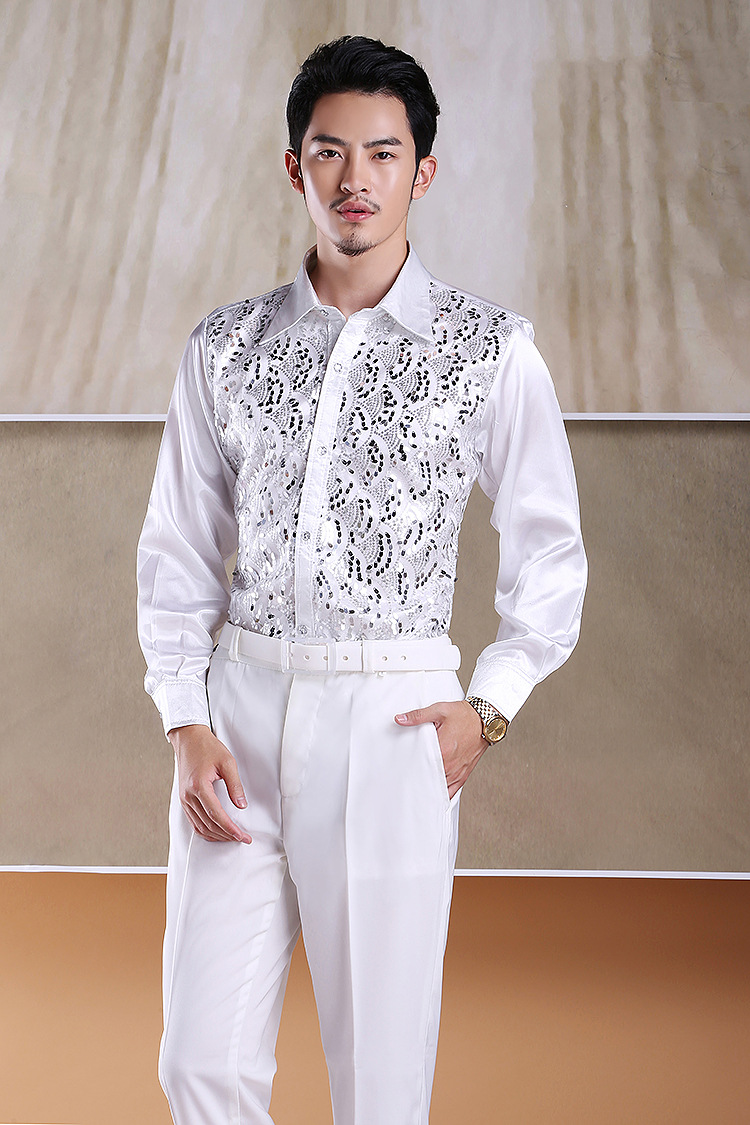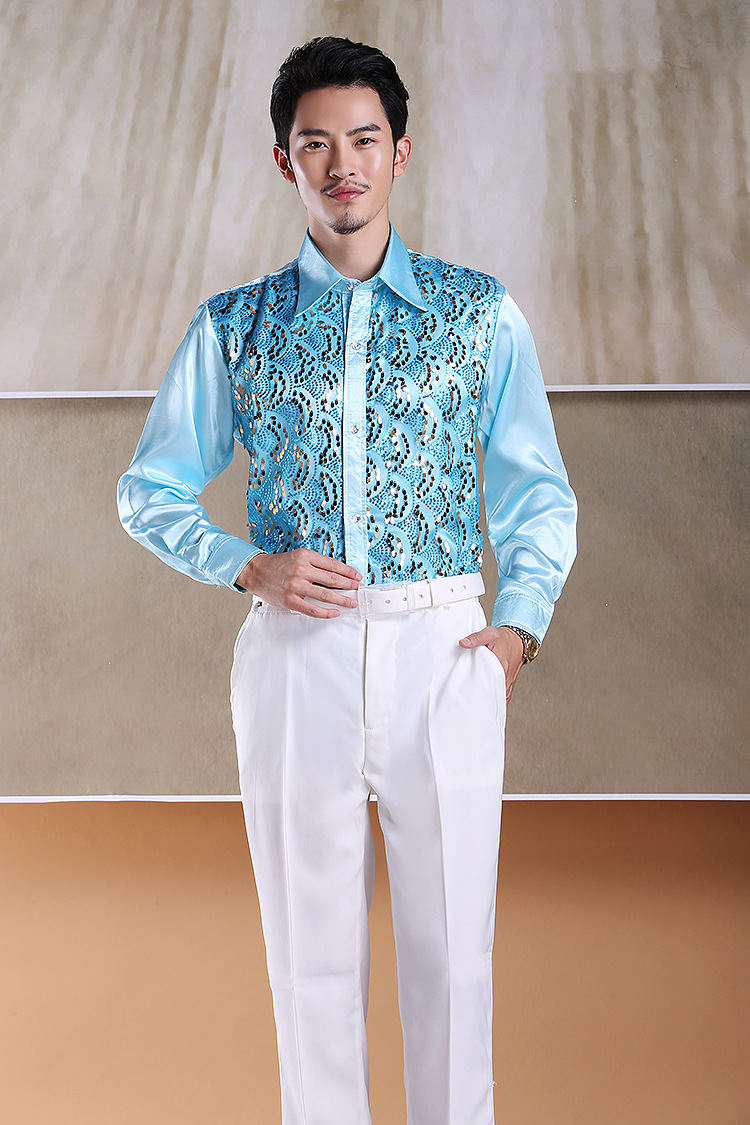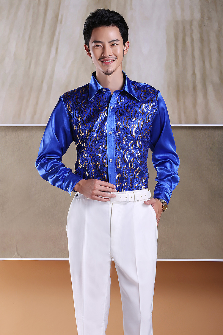 Shimmering Full-Body Patchwork Shirt for Male Adult Chorus Stage Costume, Dance Performance, Long-Sleeved Shirt with Loose Fit