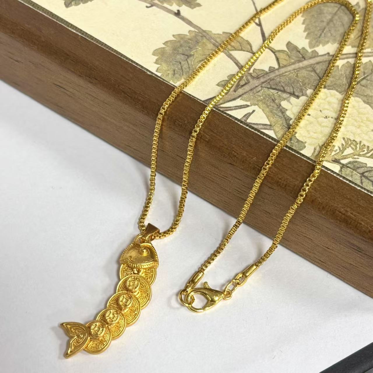 qing dynasty five emperors' coins koi pendant + box chain