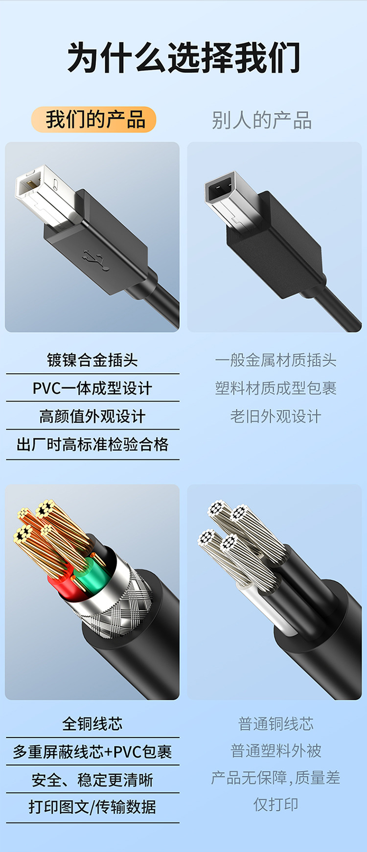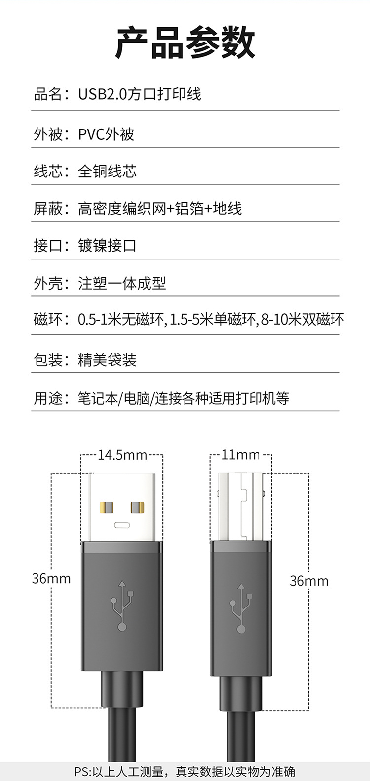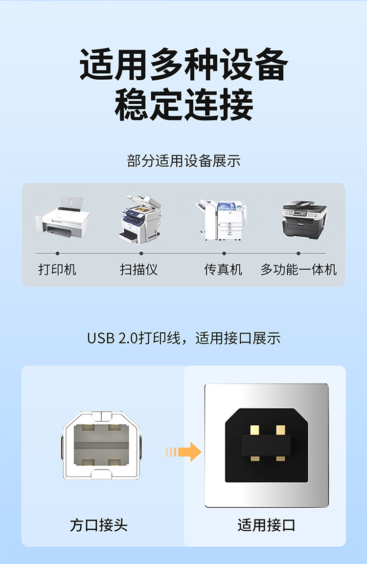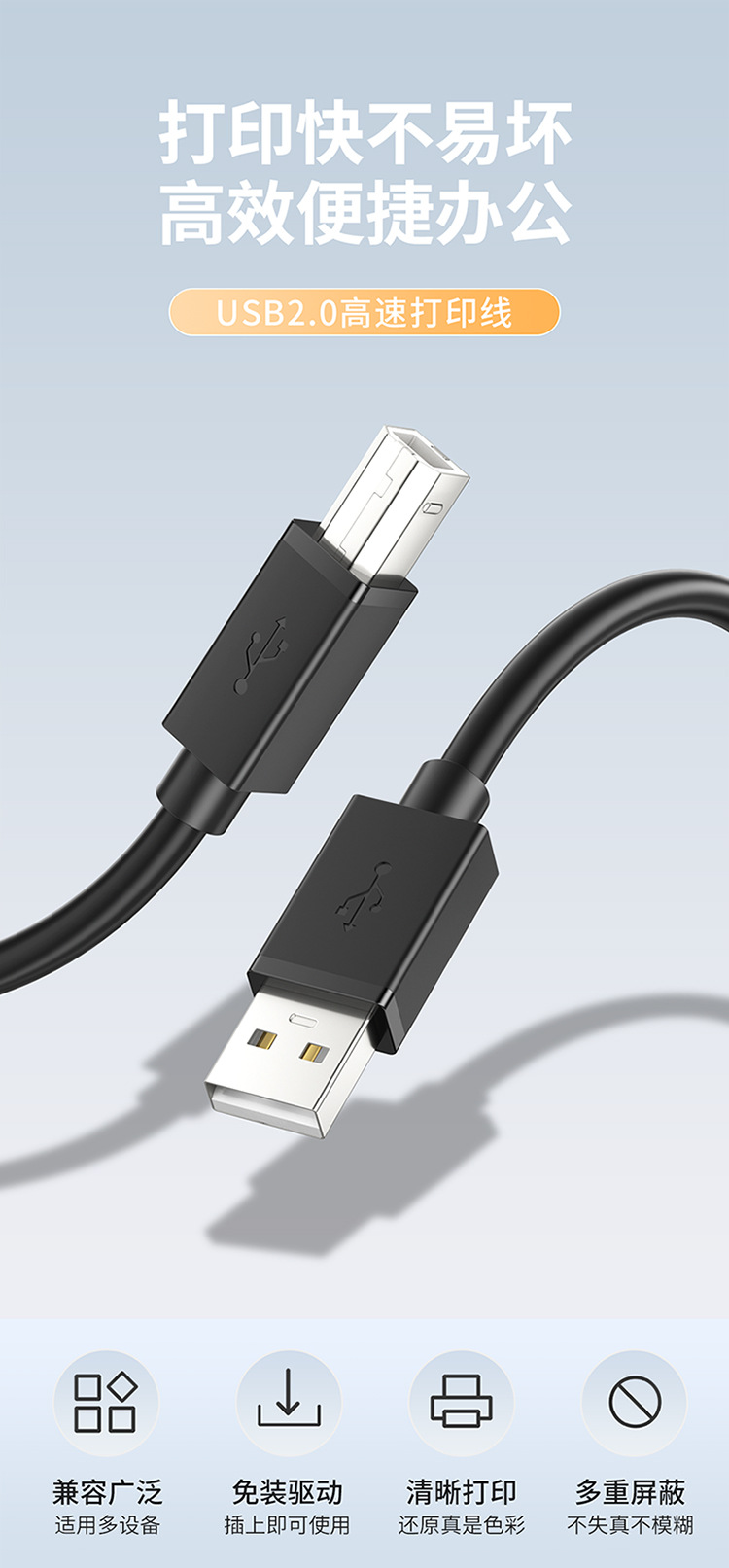 USB 2.0 printer cable with full copper square connector, printer data cable with A male to B female, computer connection cable for USB printing