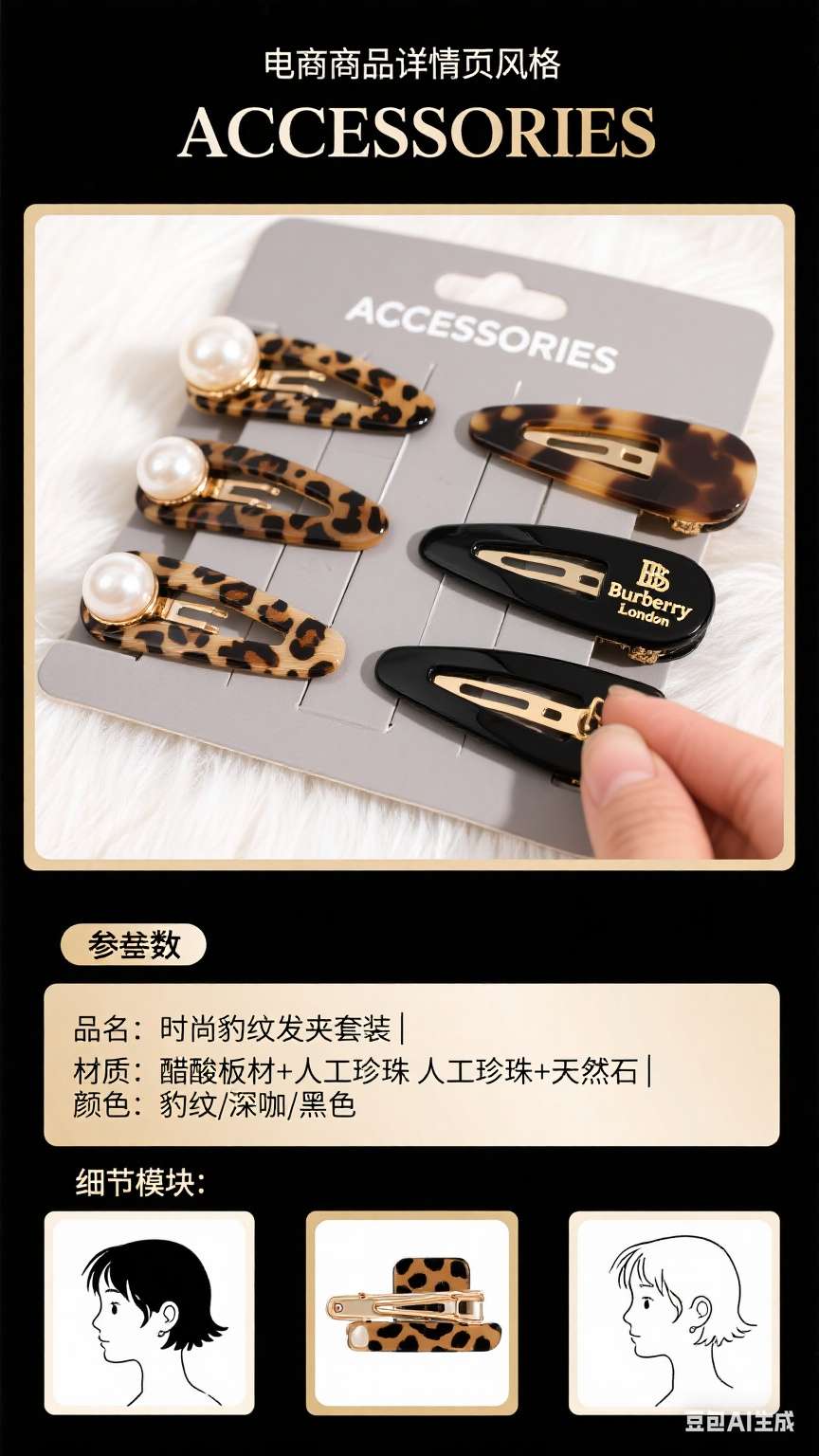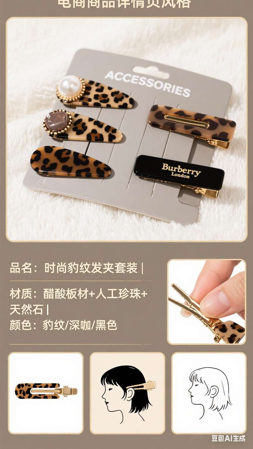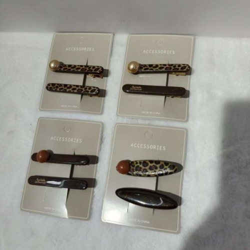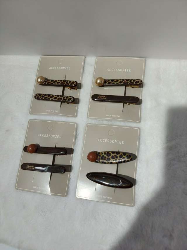 1. Set includes: Each card has 2 hair clips, with a total of 4 different styles. It covers the leopard print pearl double clip style (one large and one small to meet different hair clipping needs), leopard print pearl + solid color simple style, natural stone embellishment + solid color simple style, and natural stone embellishment leopard print style. Rich styles can be adapted to various hairstyles and fashion styles.