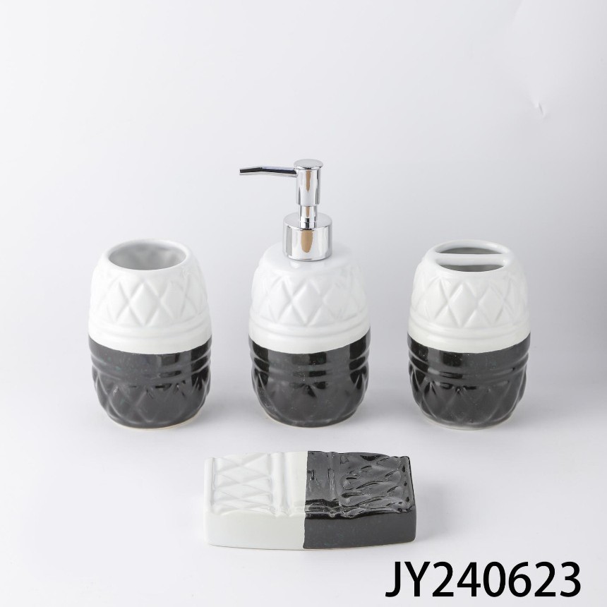 ceramic bath accessory kit four-piece bathroom lotion bottle press sannitizer replacement bottle gargle cup toothbrush holder soap dish 中文版