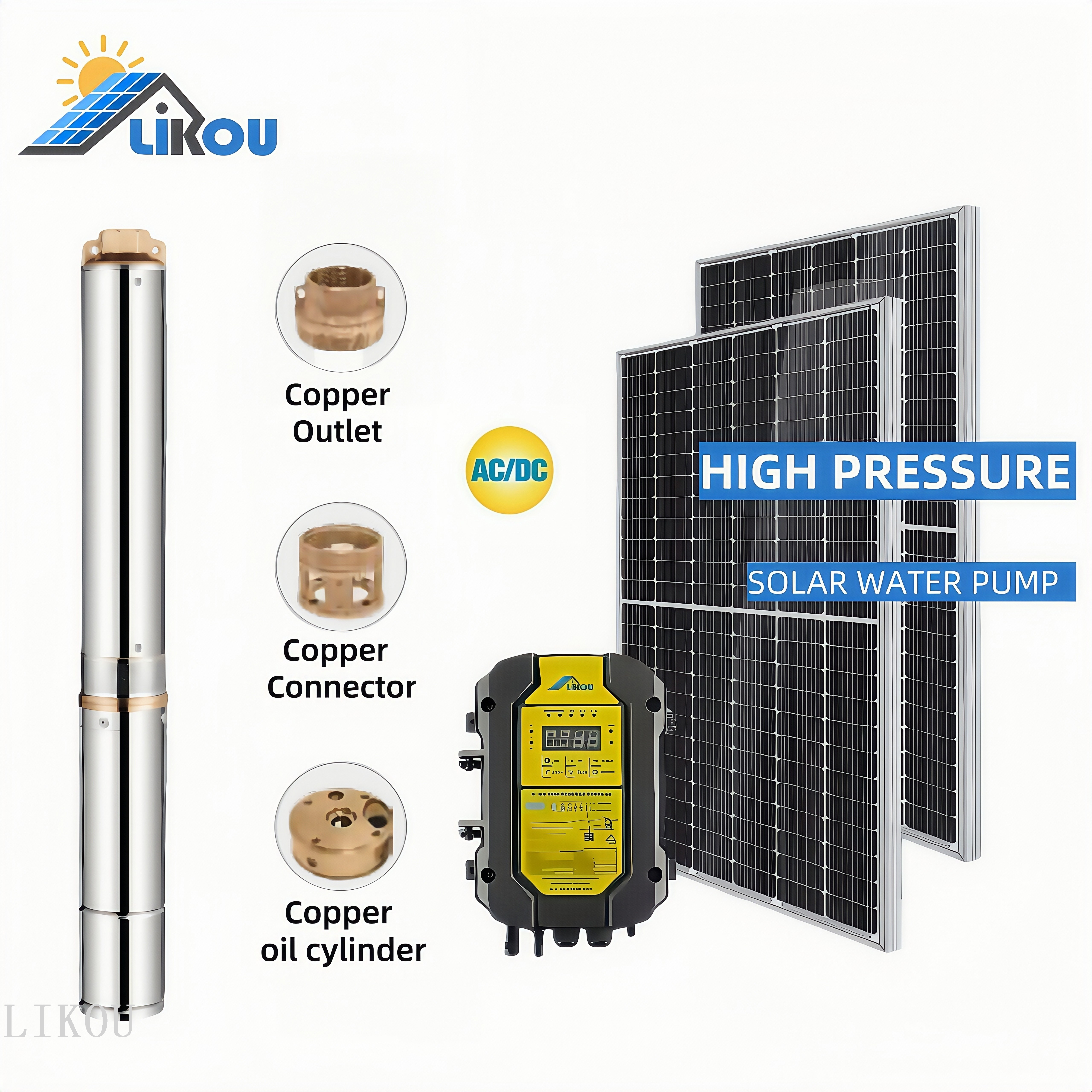 LIKOU Solar Water Pump with Copper Pump Head and Plastic Impeller, AC/DC Universal, equipped with a Gray Stainless Steel Controller. This 4-inch water pump has a maximum flow rate of 3.5m³ and a maximum lift of 110m, with a power of 1100w (1.5HP). Contact the sales representative for more styles and models, contact information: 15958446226 (WeChat and phone number).