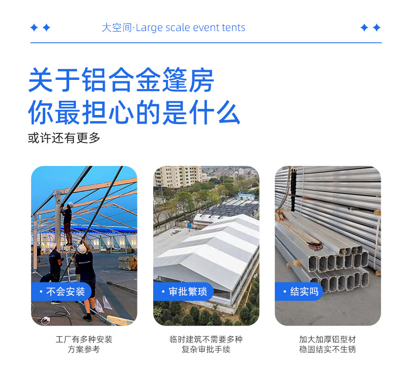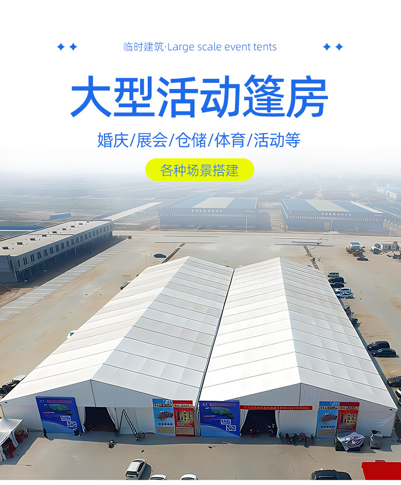 1. Quick assembly and disassembly: Marquees can be set up and taken down quickly, making it easy to solve the problem of space expansion.