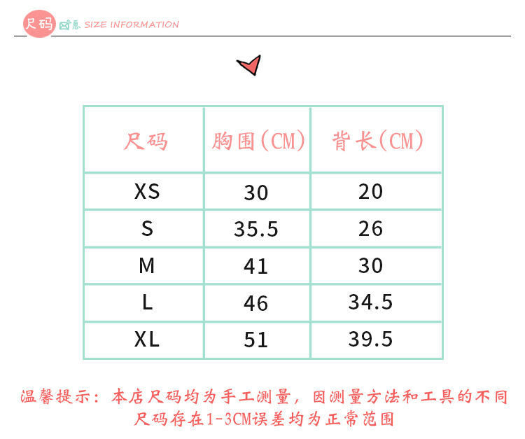 | size xs :( back length 20cm) about 1.00kg | ¥25.61 | 19 piece available |