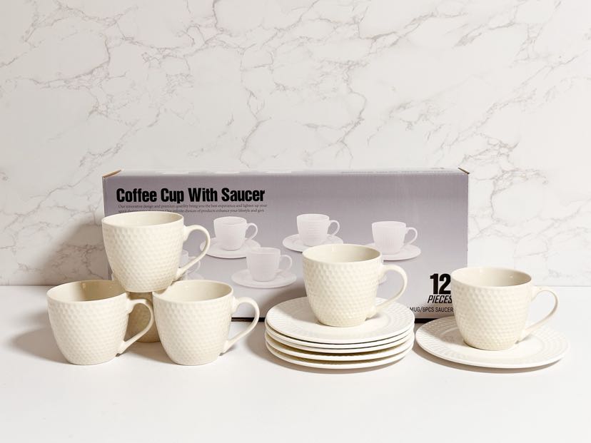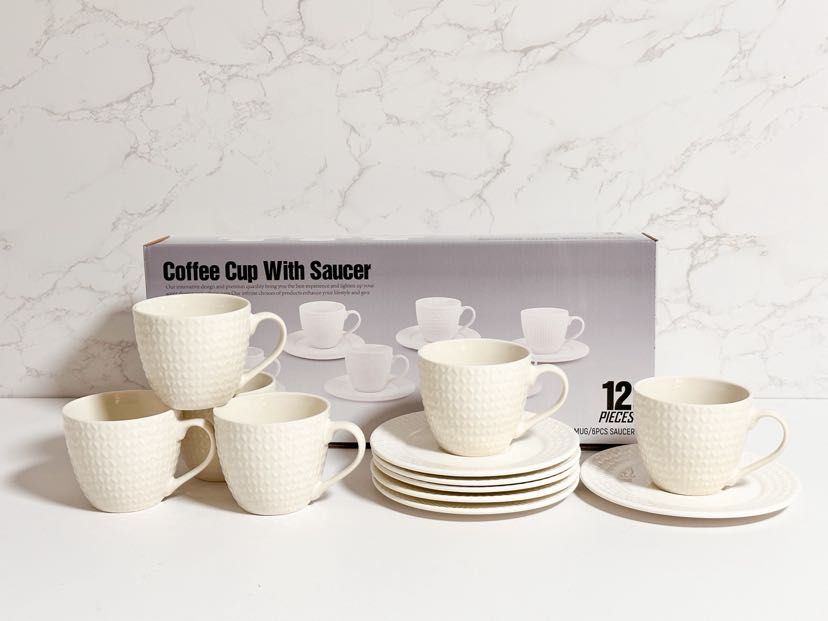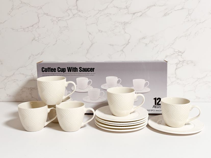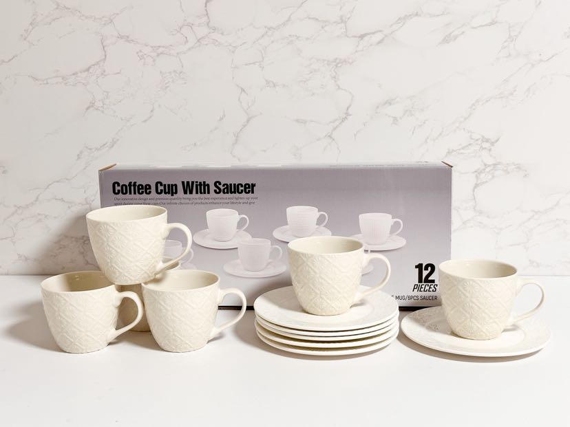 square round ceramic white embossed cup and saucer 6 cups 6 dish set 中文版