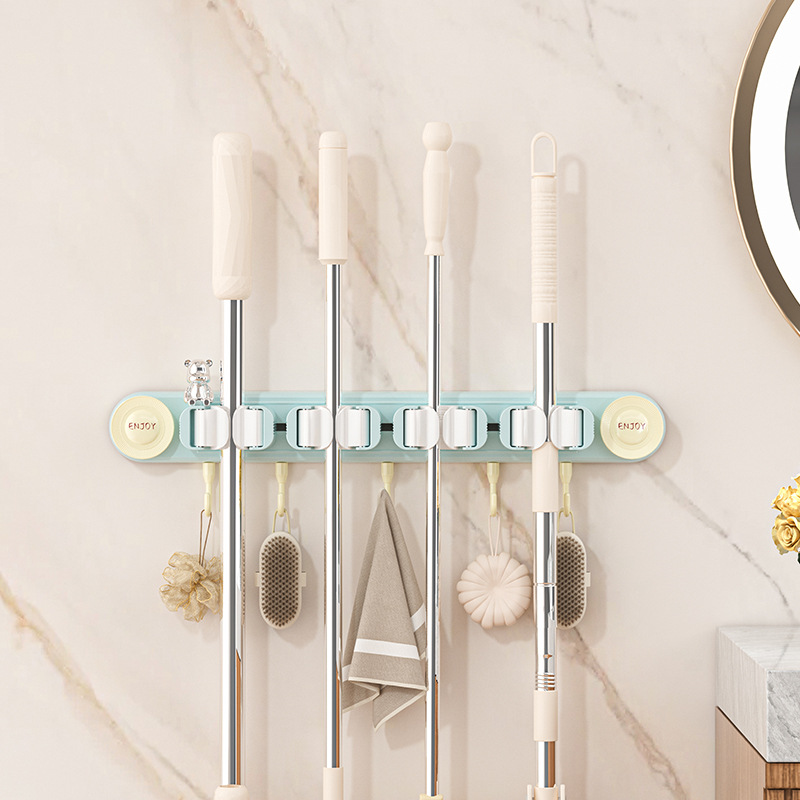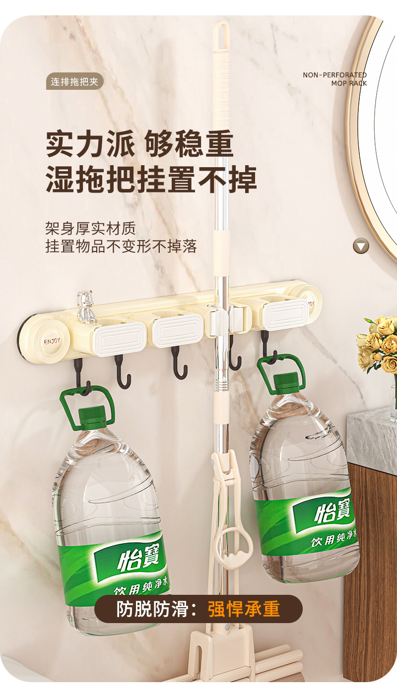 Suction mop holder with wall-mounting clamp for no drilling required.