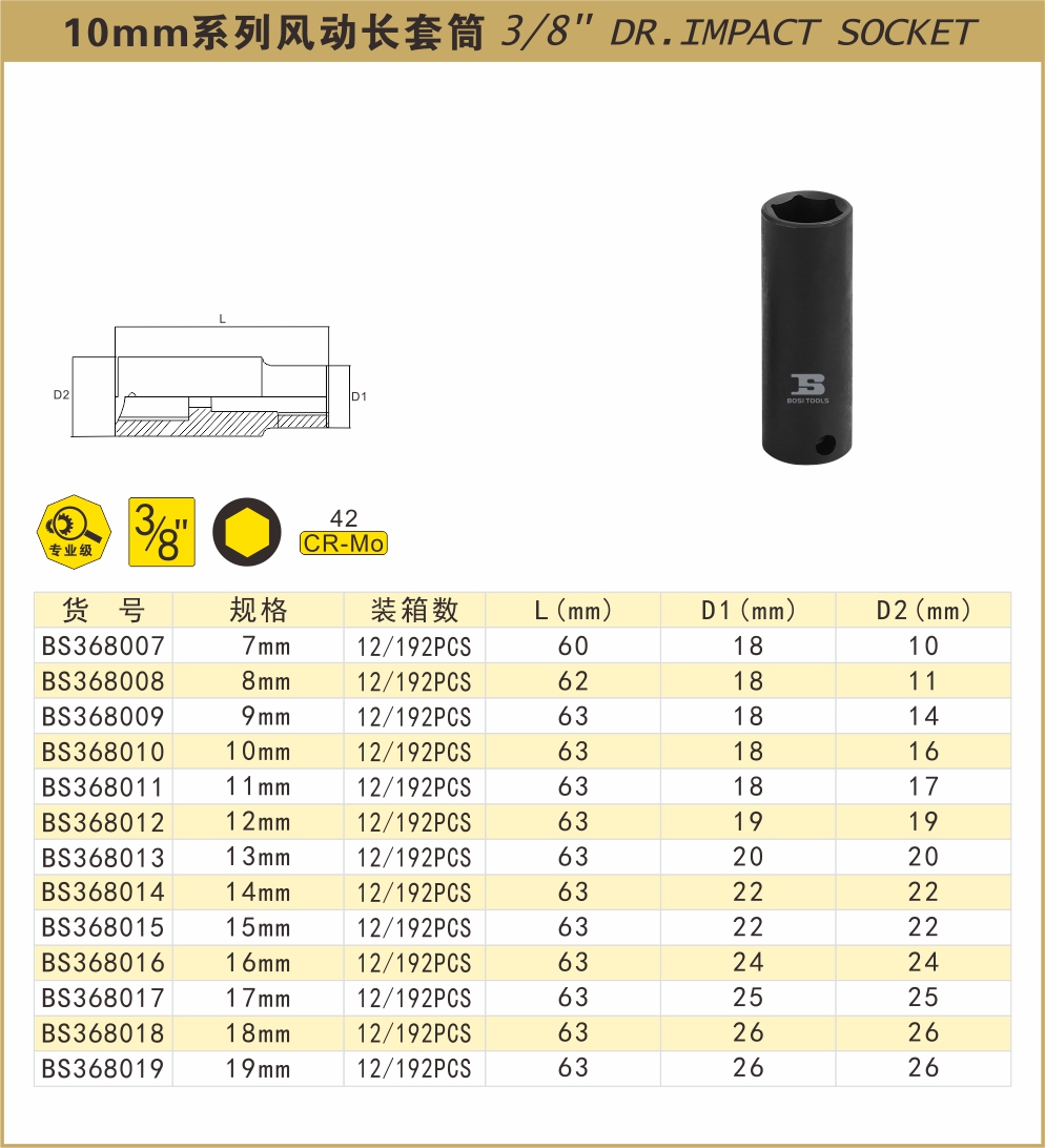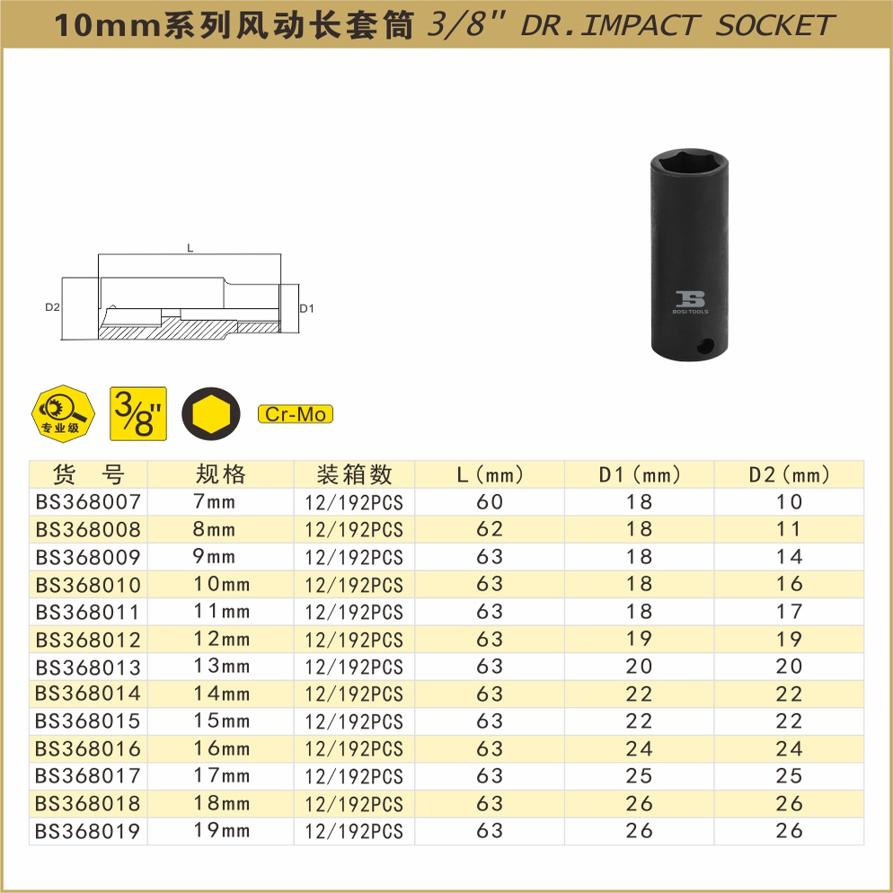 | 3/8-inch hexagonal pneumatic long sleeve 12mm | ¥8.85 | 60 piece available |