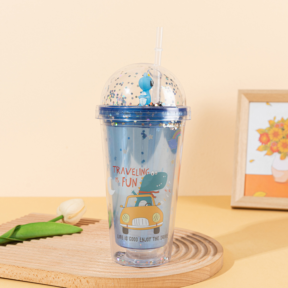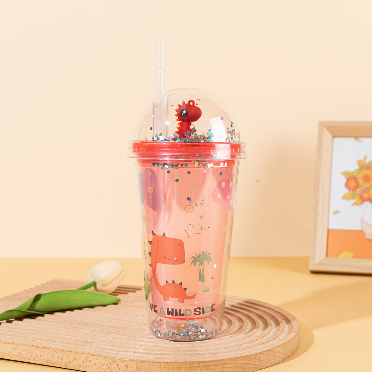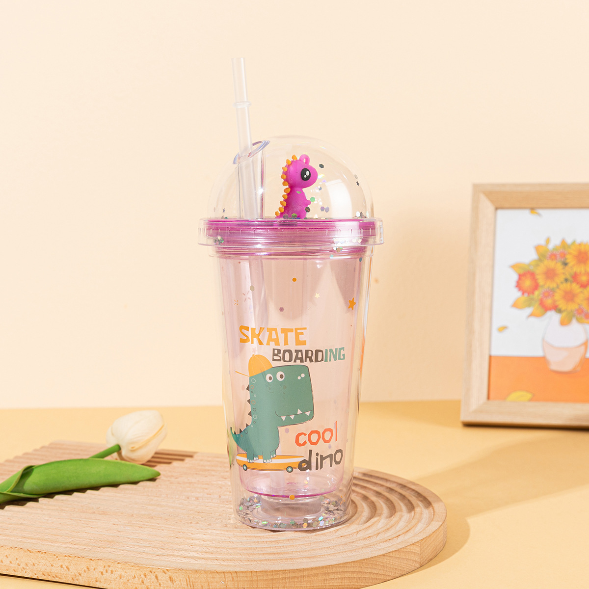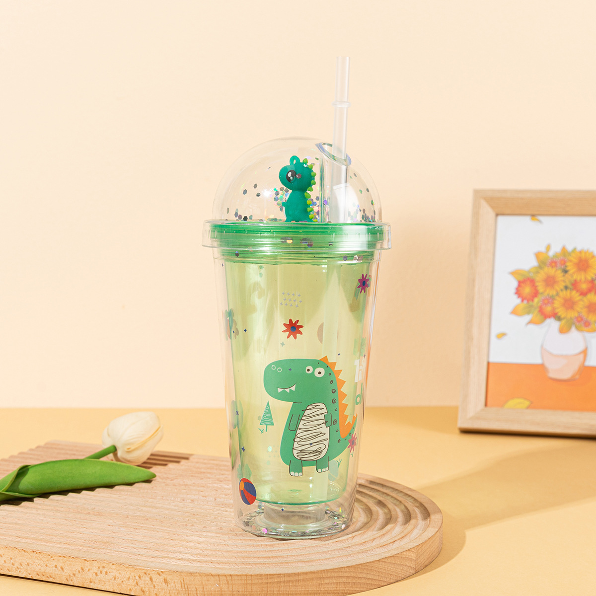 new creative double-layer summer dinosaur ice cup portable male and female student straw plastic water cup gift cup wholesale