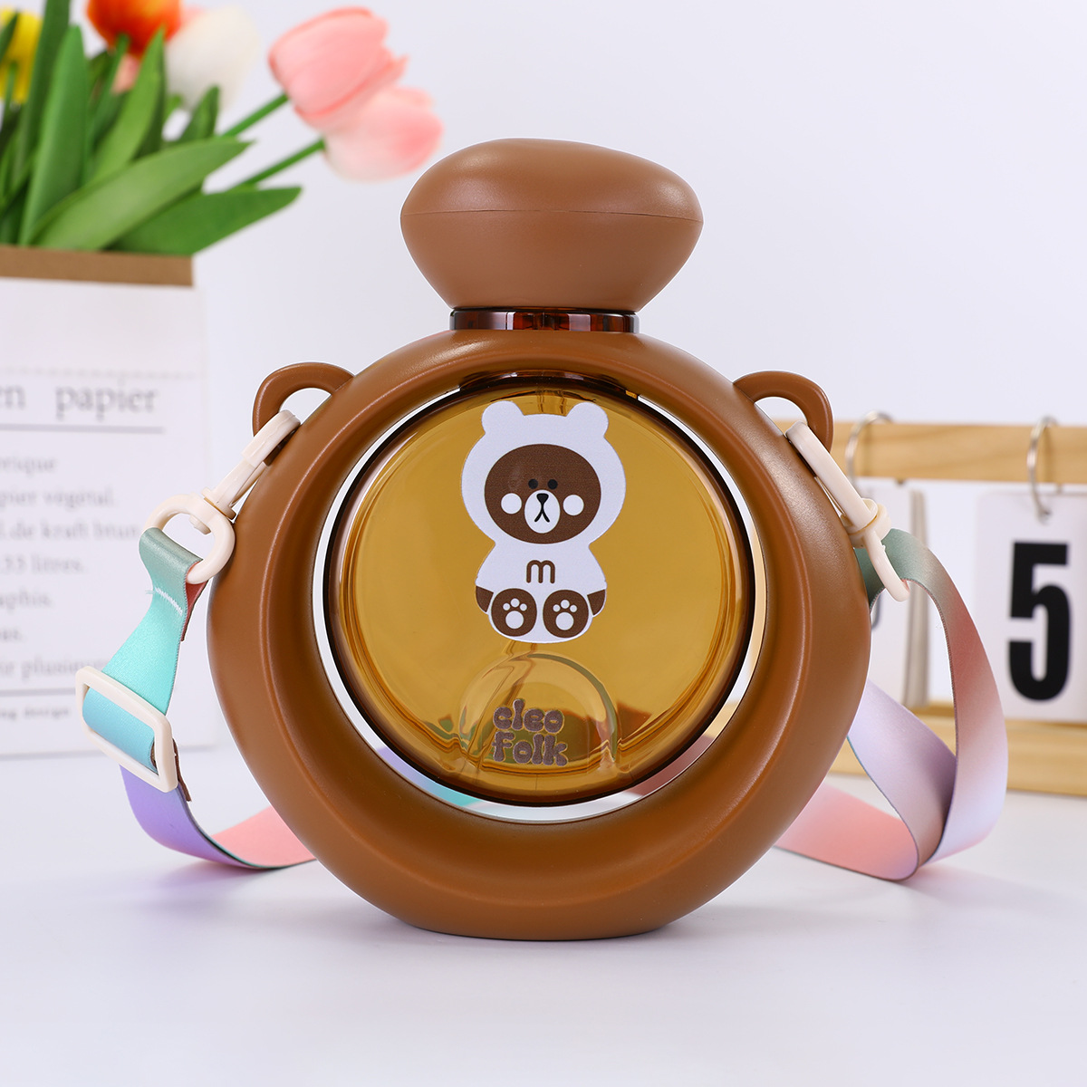 good-looking cartoon bear plastic round belly cup food grade double drink straw cup portable lanyard strap portable cup wholesale