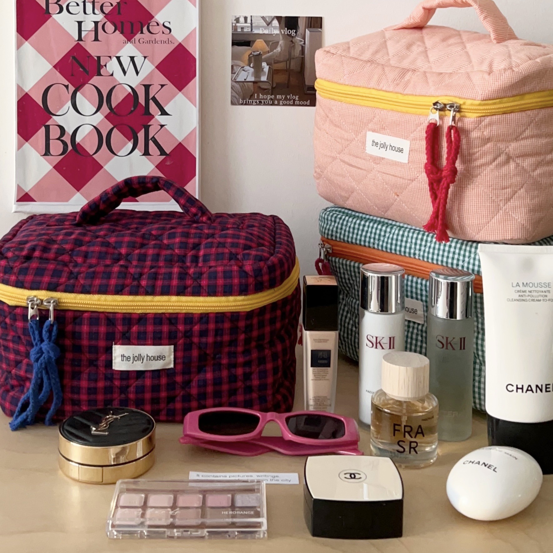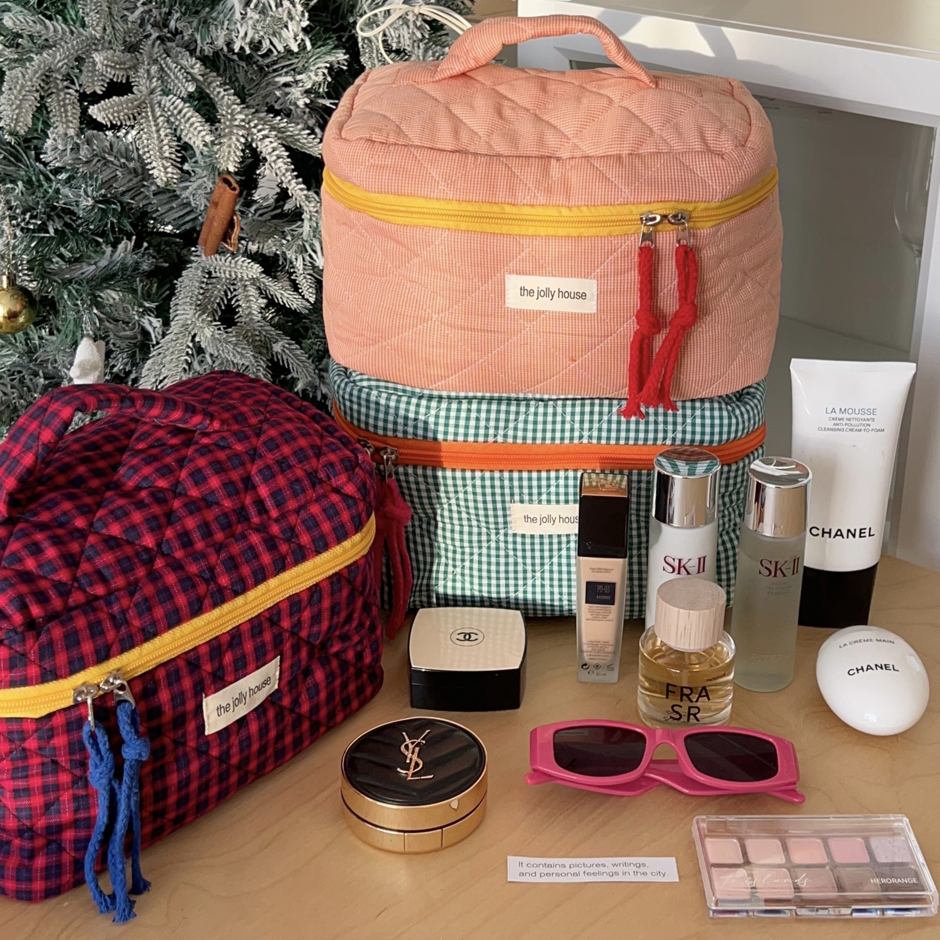 red and blue plaid storage bag