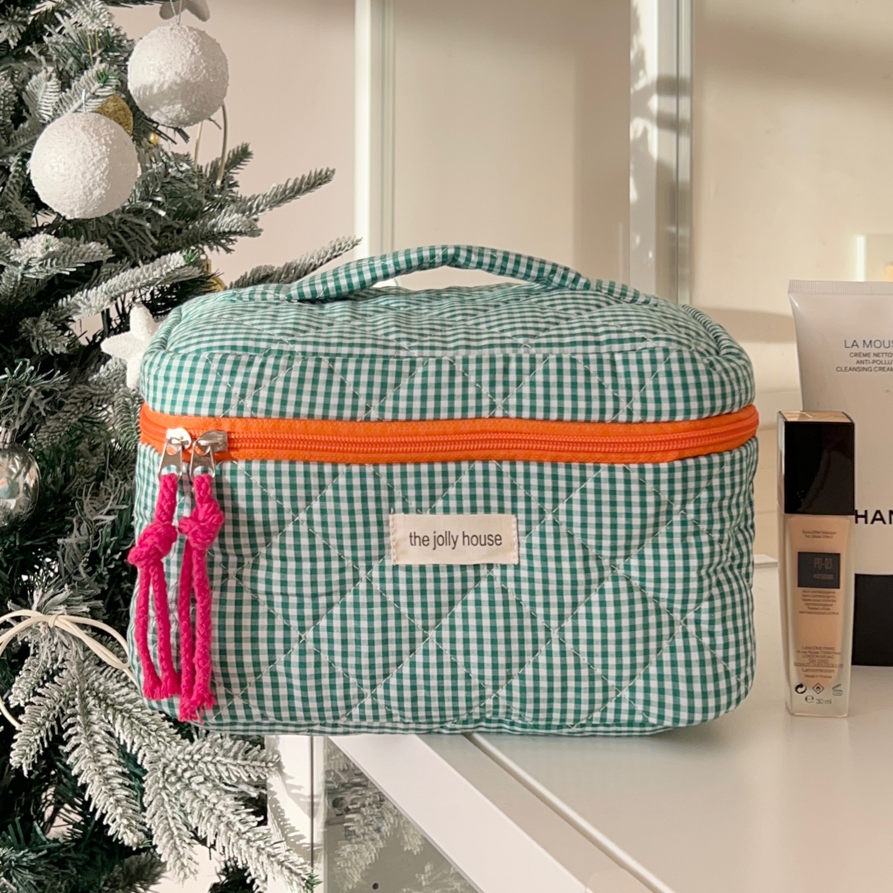 green plaid storage bag