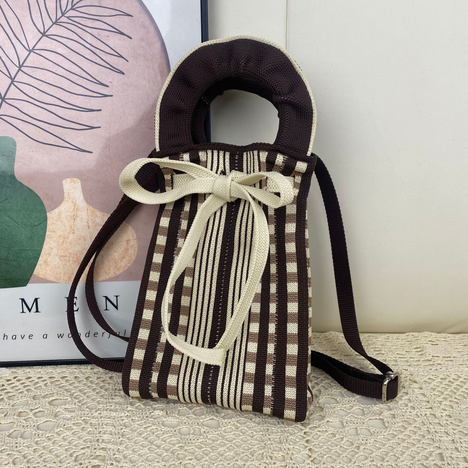beige plaid bow phone bag