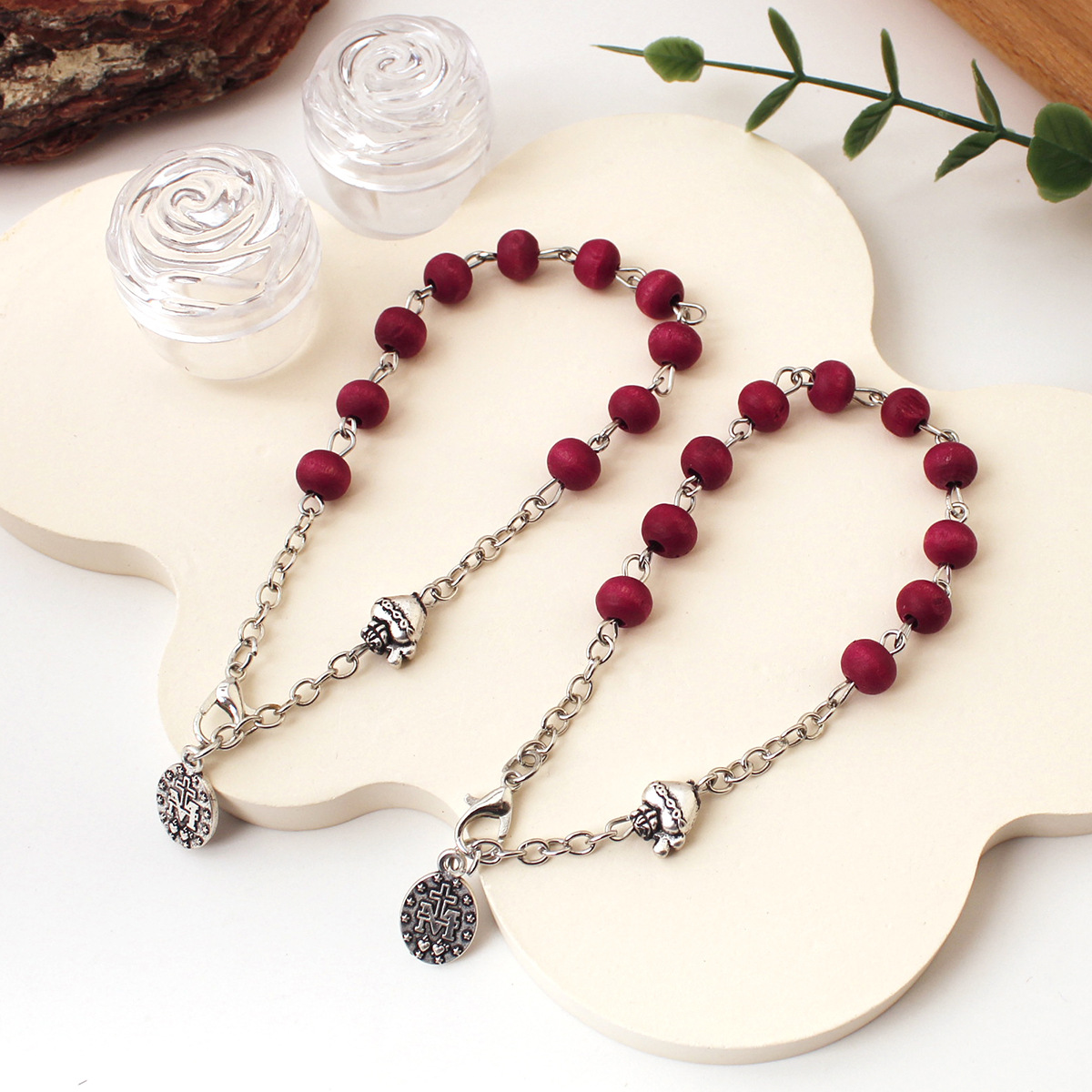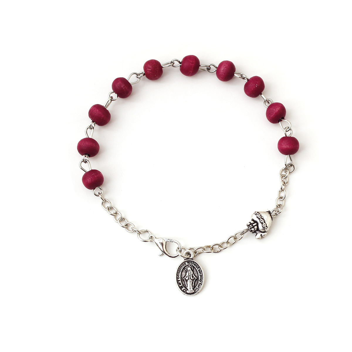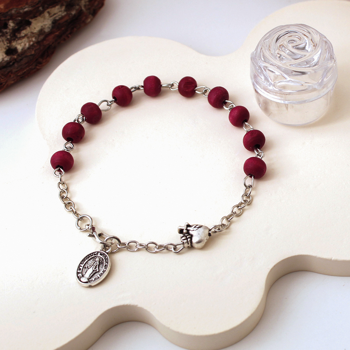 foreign trade cross-border italy retro antique silver holy heart virgin dark red fragrance wooden bead prayer rosary bracelet 中文版