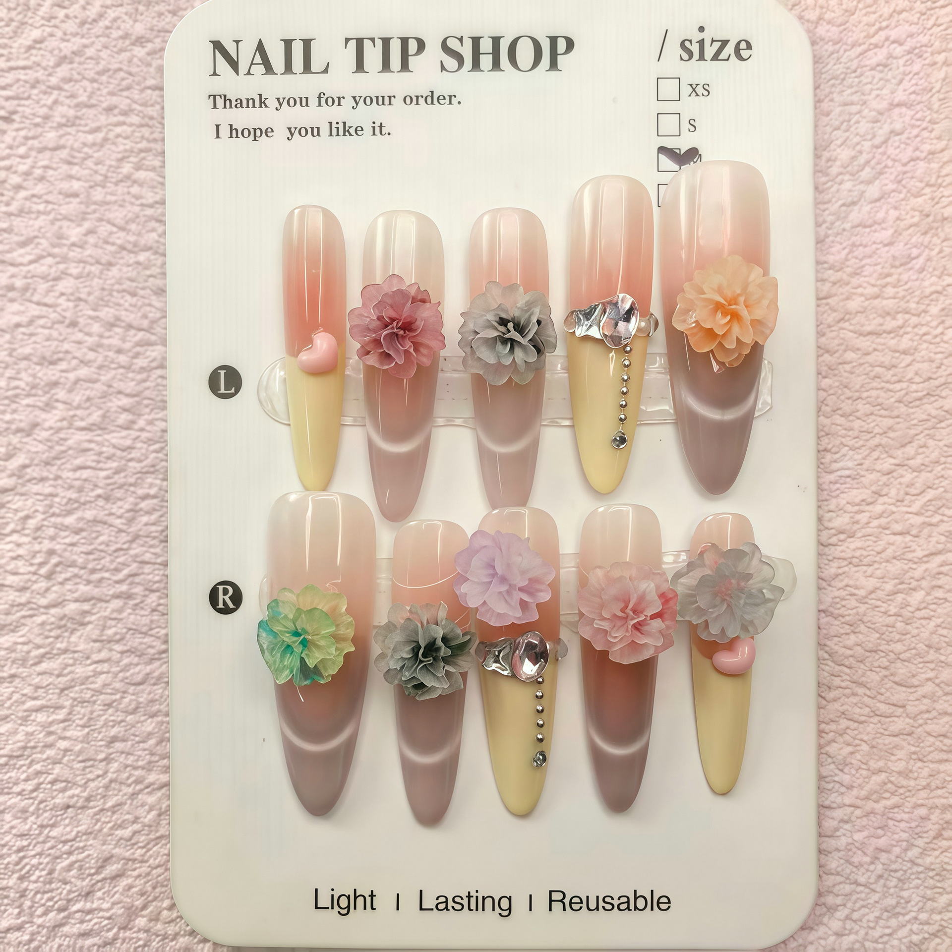 Use UV glue or strong nail polish to fix it, ensure that the edge of the flower is completely adhered to the nail surface, and avoid catching hair.