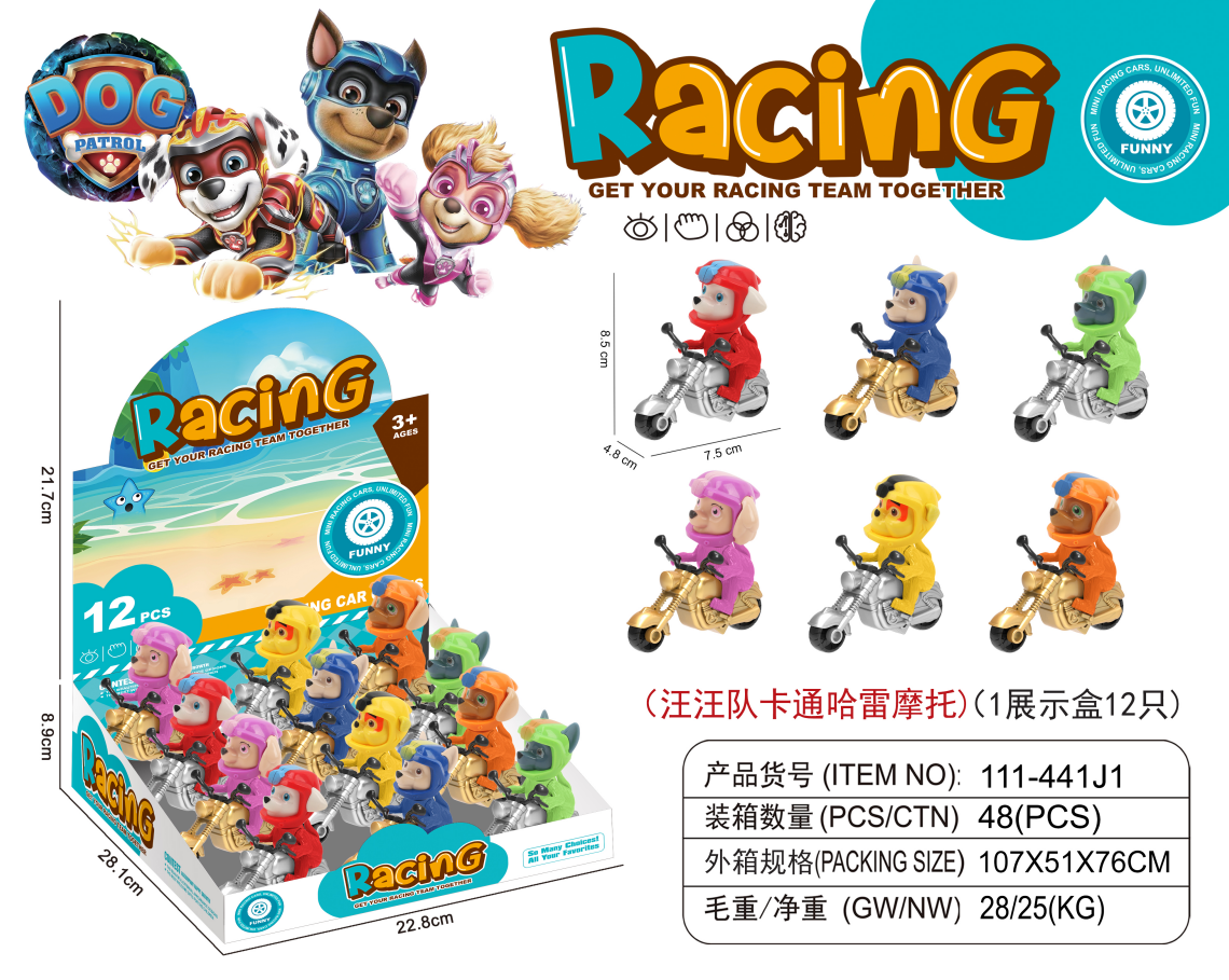 foreign trade children's popular dog three-wheeled pull back car 6 dog warrior motorcycle mixed children's fashion toys 中文版