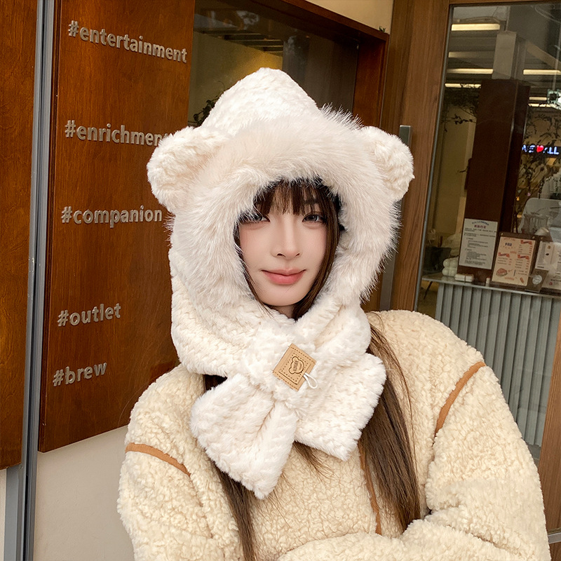 winter cute fashion plush scarf hat one thickened keep warm pure color scarf hat two-piece set
