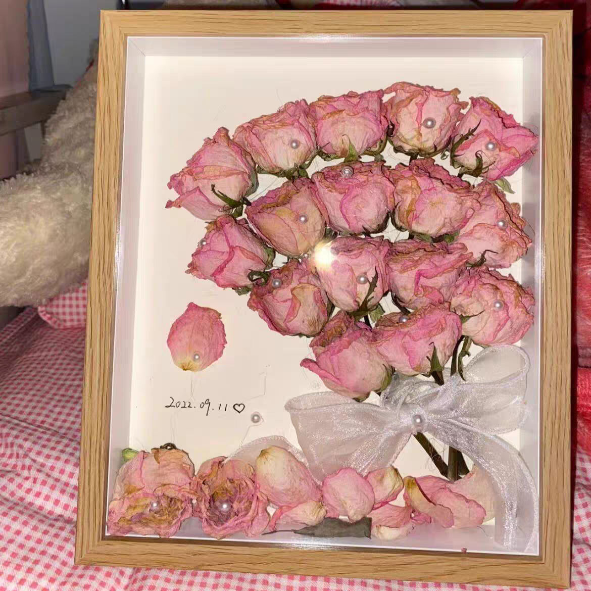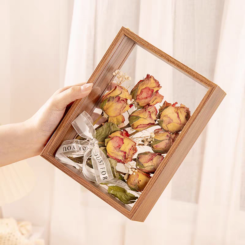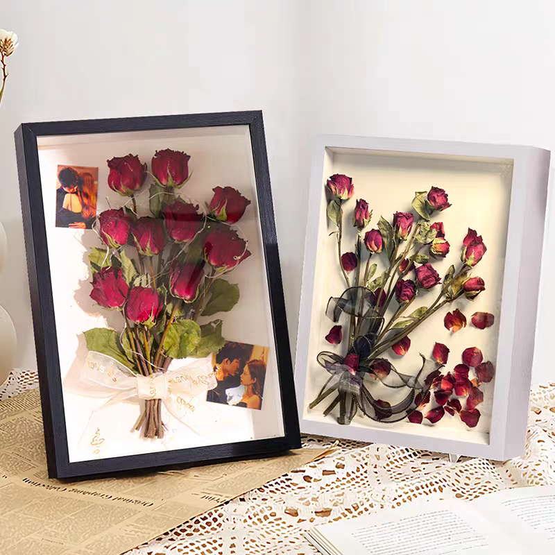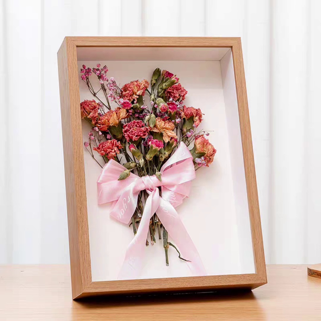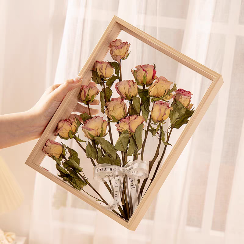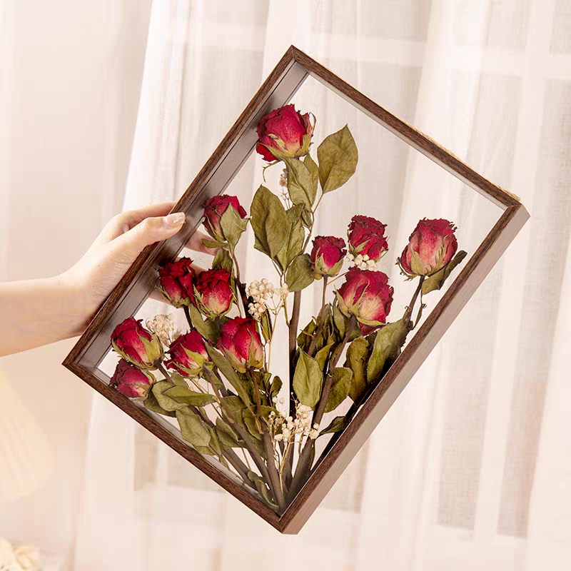 Thick-framed preserved flower picture frames can be custom-made in various sizes. The goods we produce do not contain dried flowers. We can provide wholesale stalls for you to purchase directly, which can save you money on the flowers.
