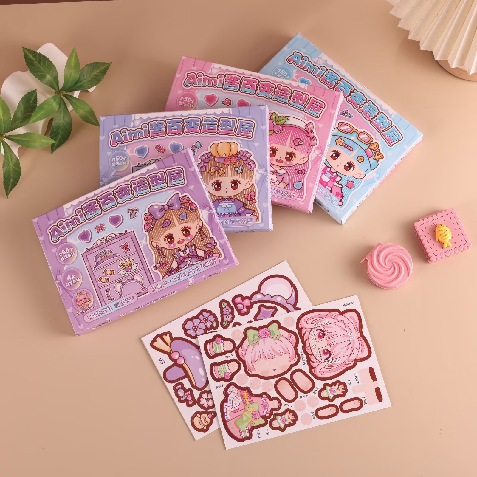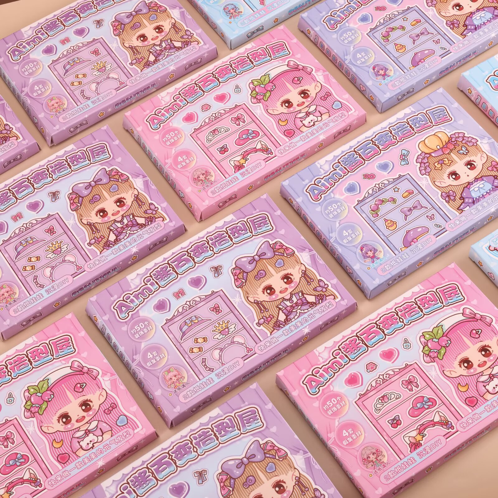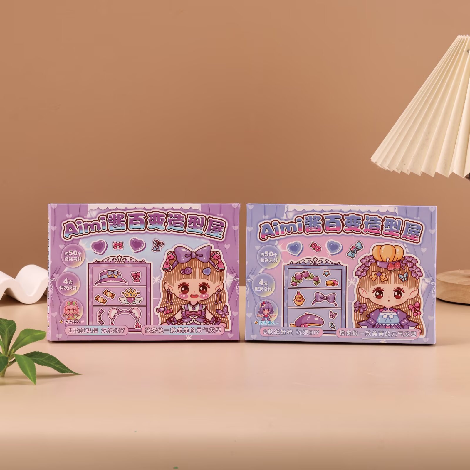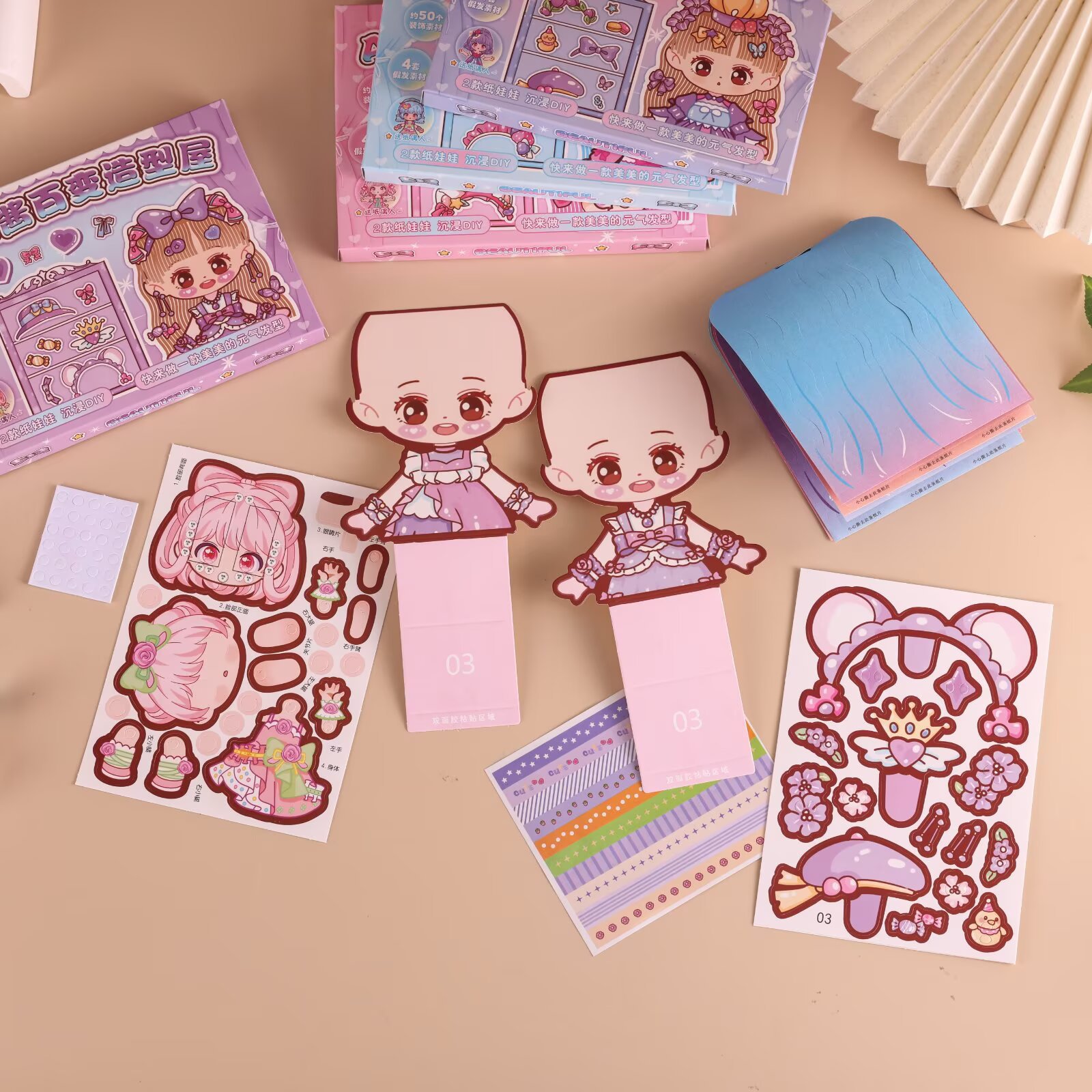 Contains: 2 paper dolls, 4 wig sets, 2 hair decoration stickers, 1 hair band sticker