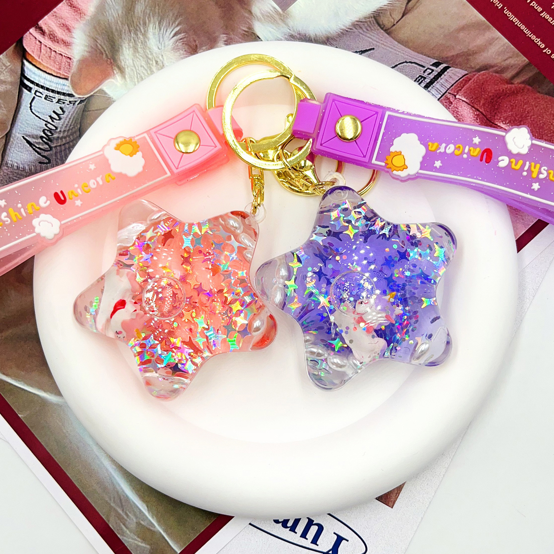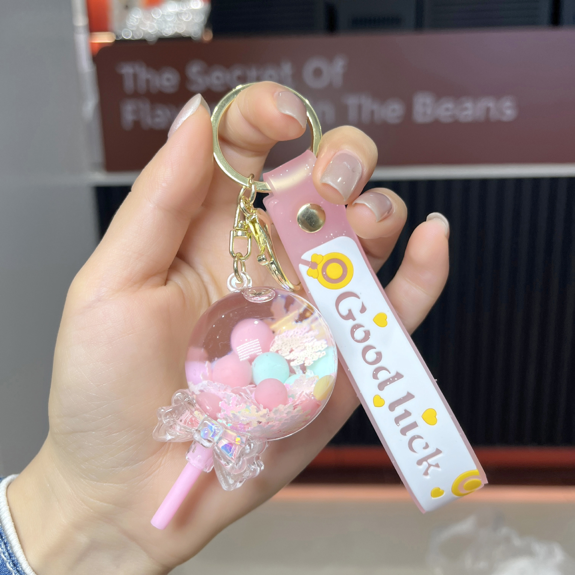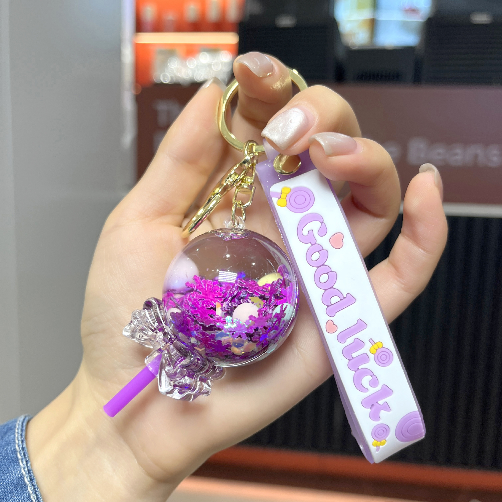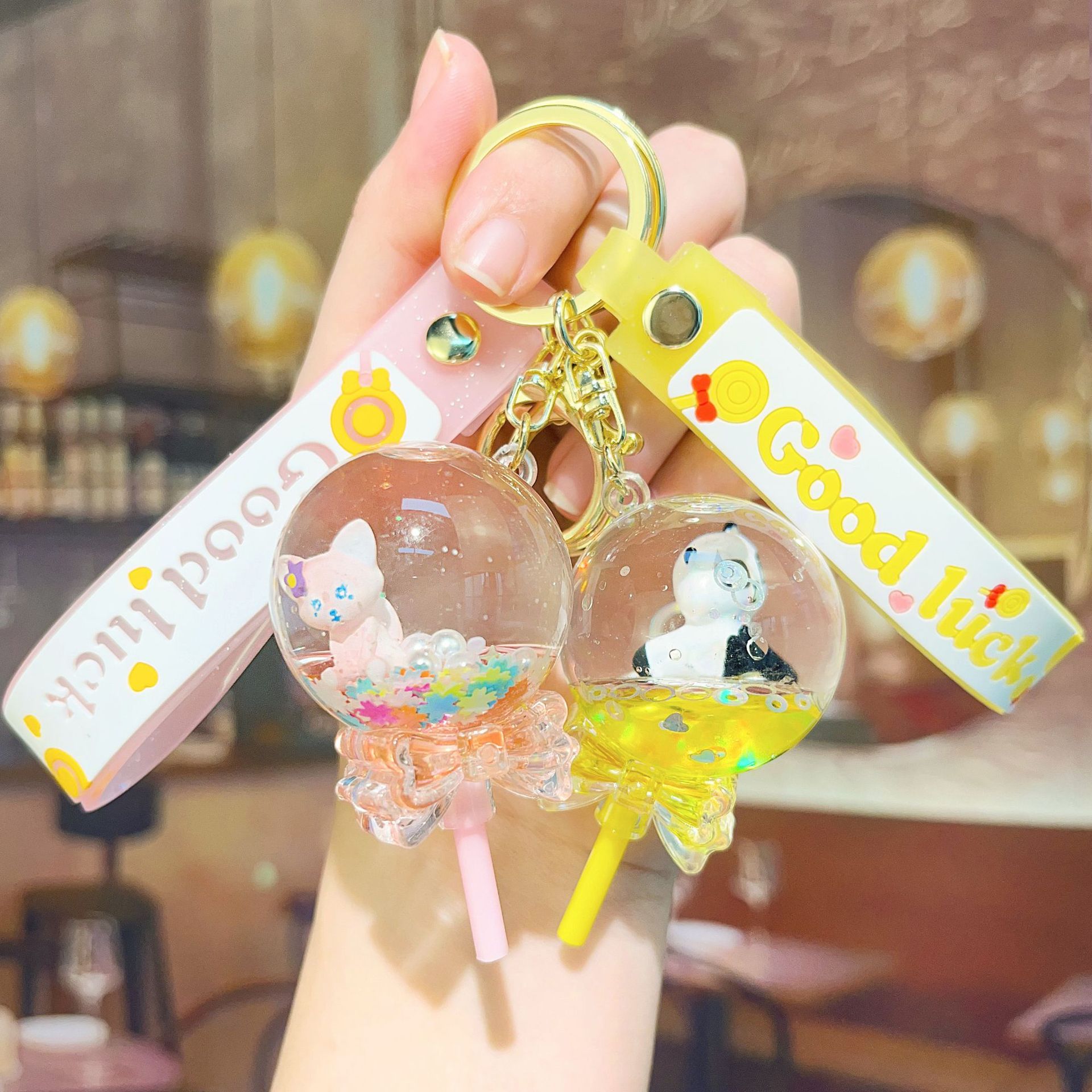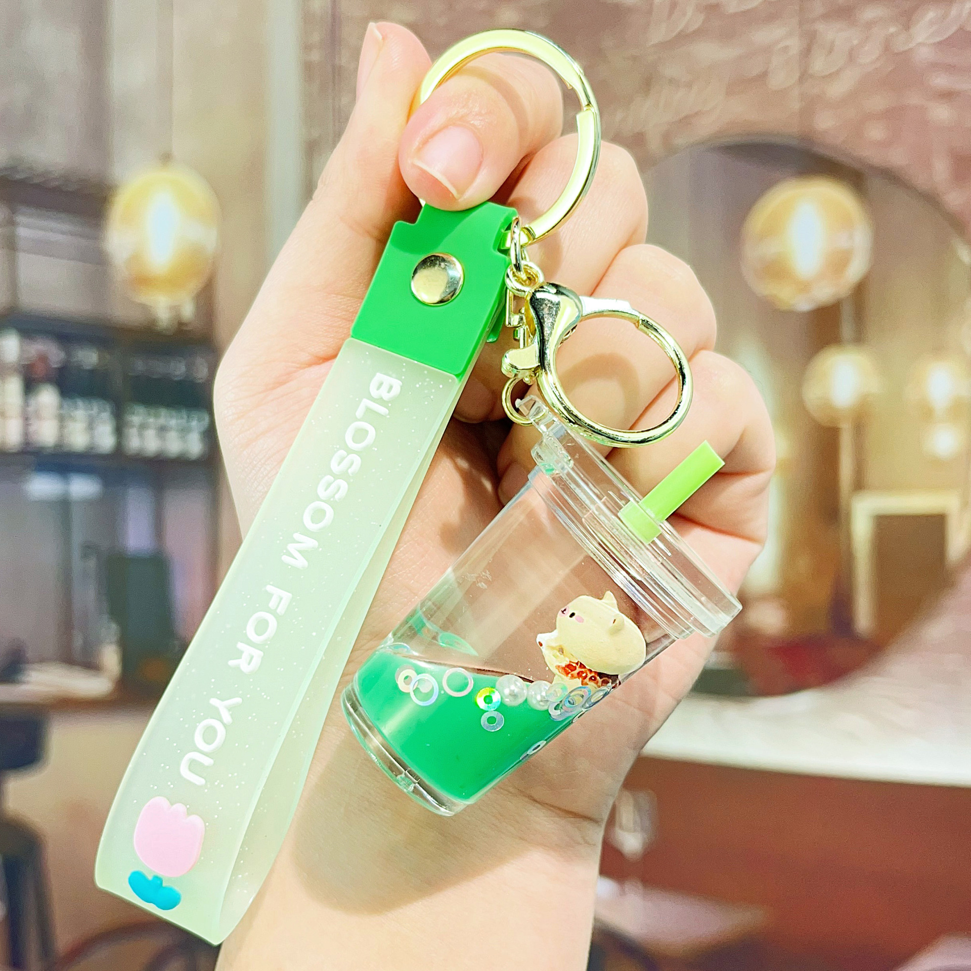 acrylic new creative milky tea cup quicksand bottle oil key chain cute quicksand schoolbag pendant hanging ornament keychain 中文版