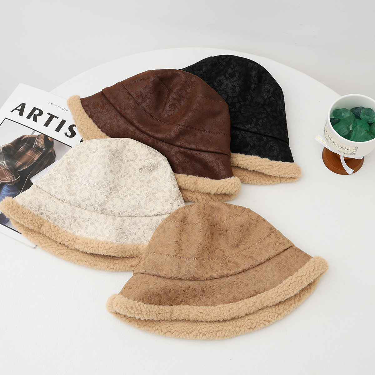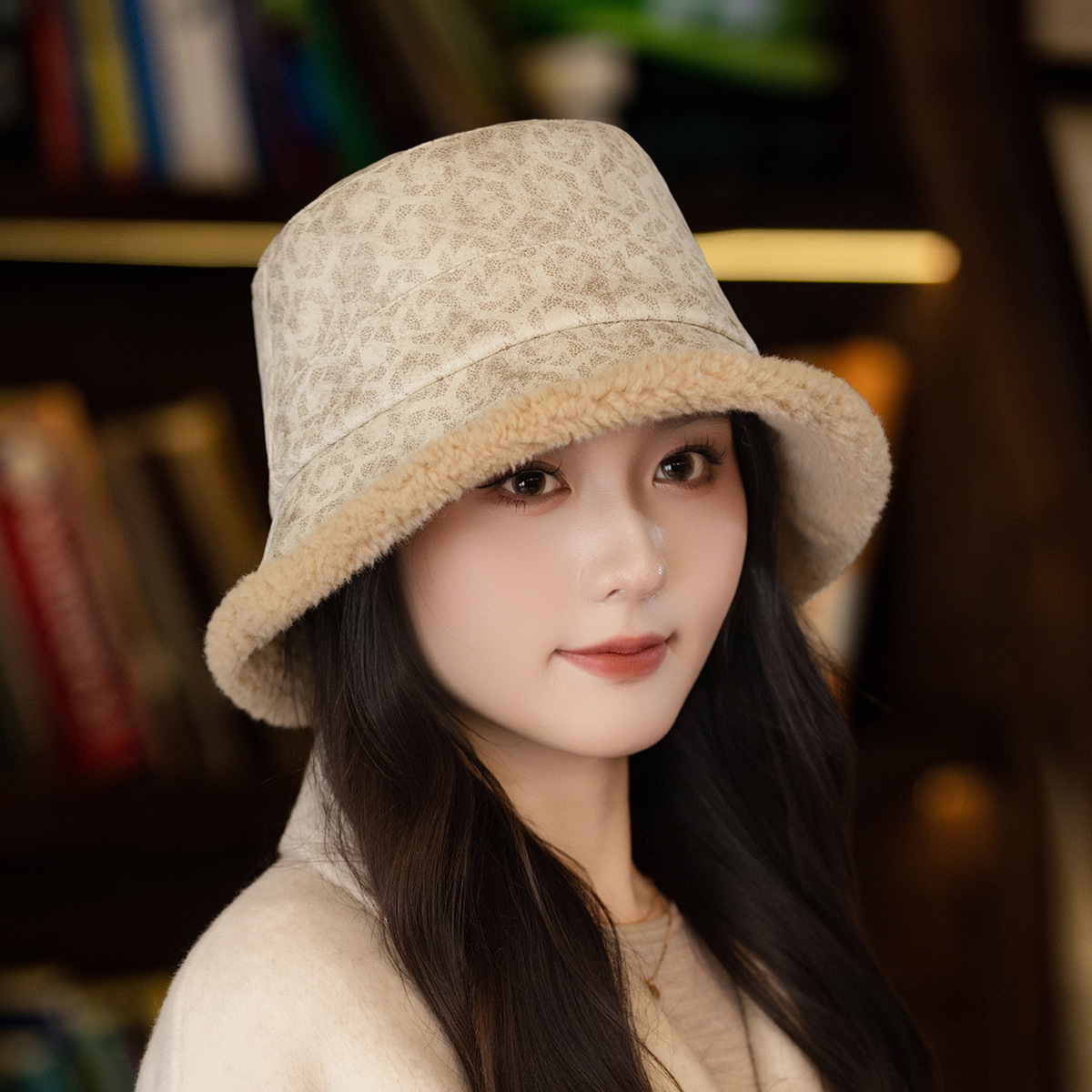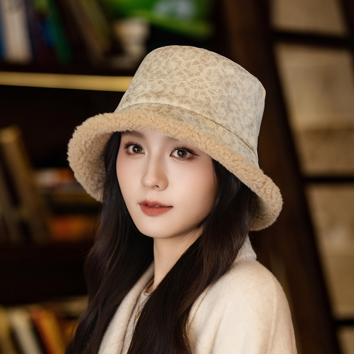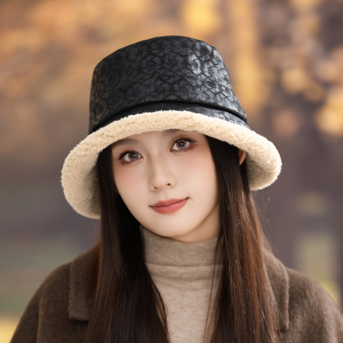 new korean style autumn and winter elegant thickened small leopard print bucket hat women's big head circumference outdoor windproof show face small warm fisherman hat 中文版