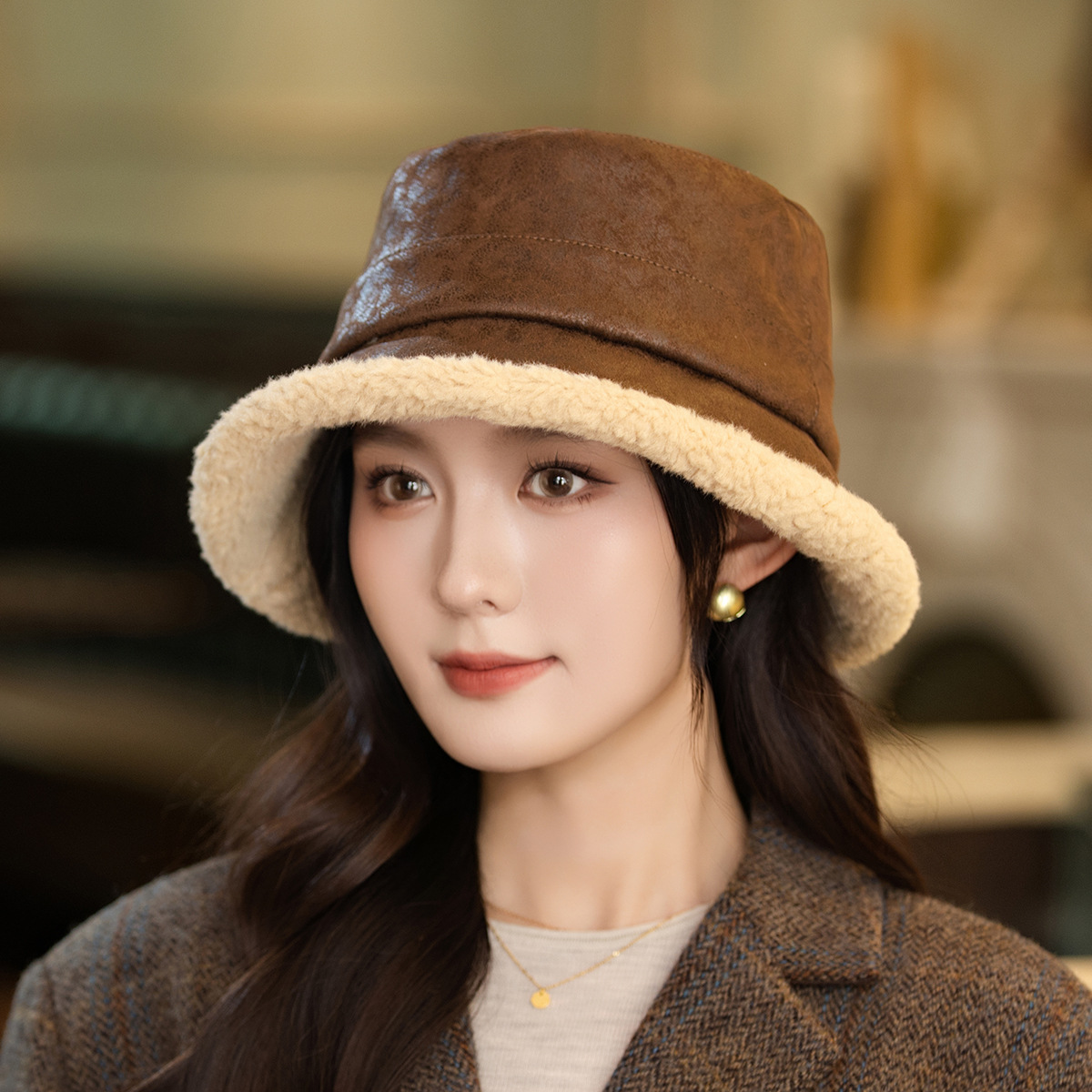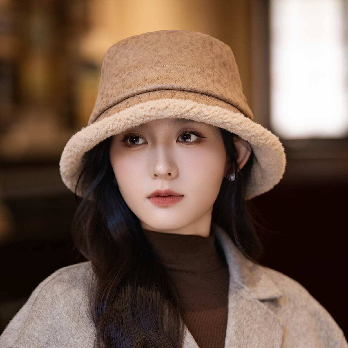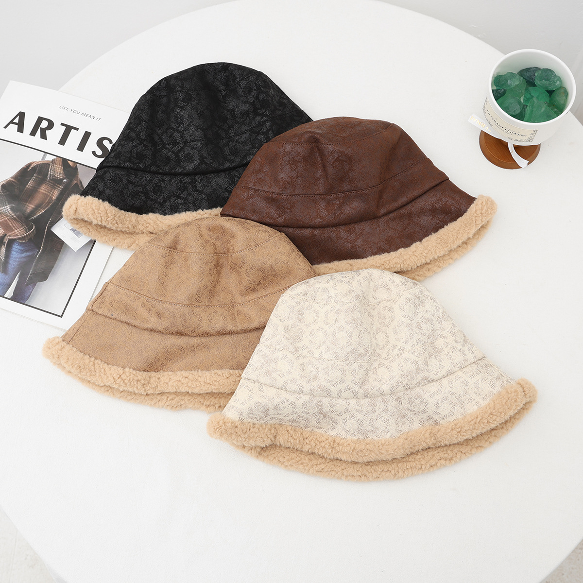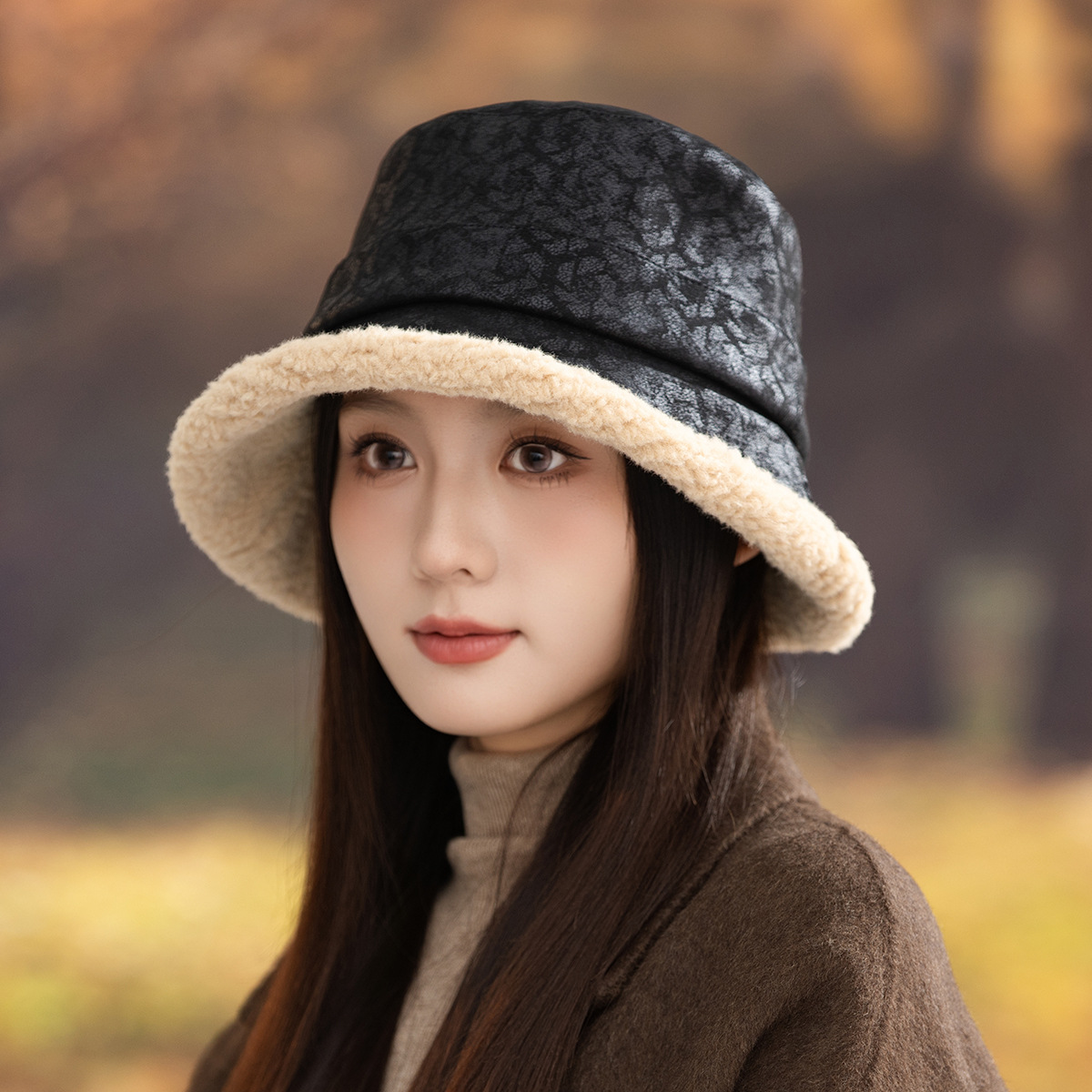 new korean style autumn and winter elegant thickened small leopard print bucket hat women's big head circumference outdoor windproof show face small warm fisherman hat 中文版