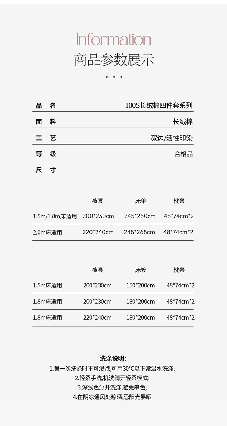 | 1.8 fitted sheet (quilt cover 200*230, fitted sheet 180*200, pillowcase 48*74*2) | CN¥ 420.66 | 999 set available |