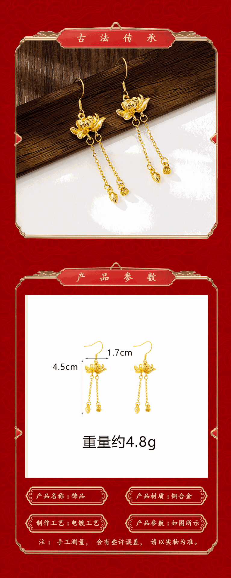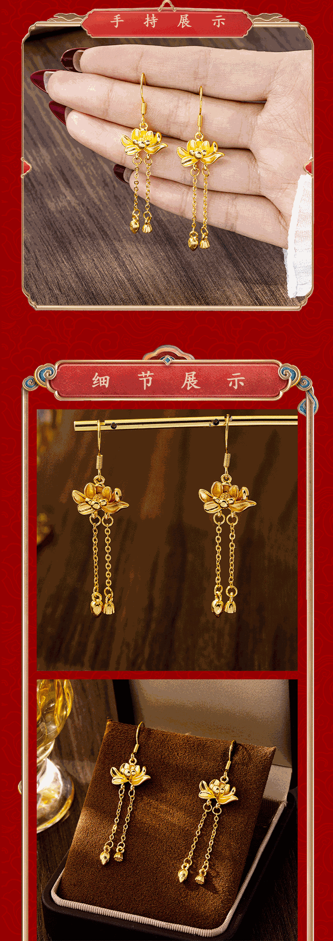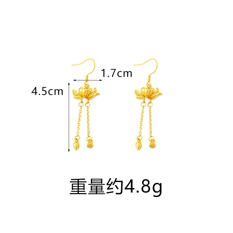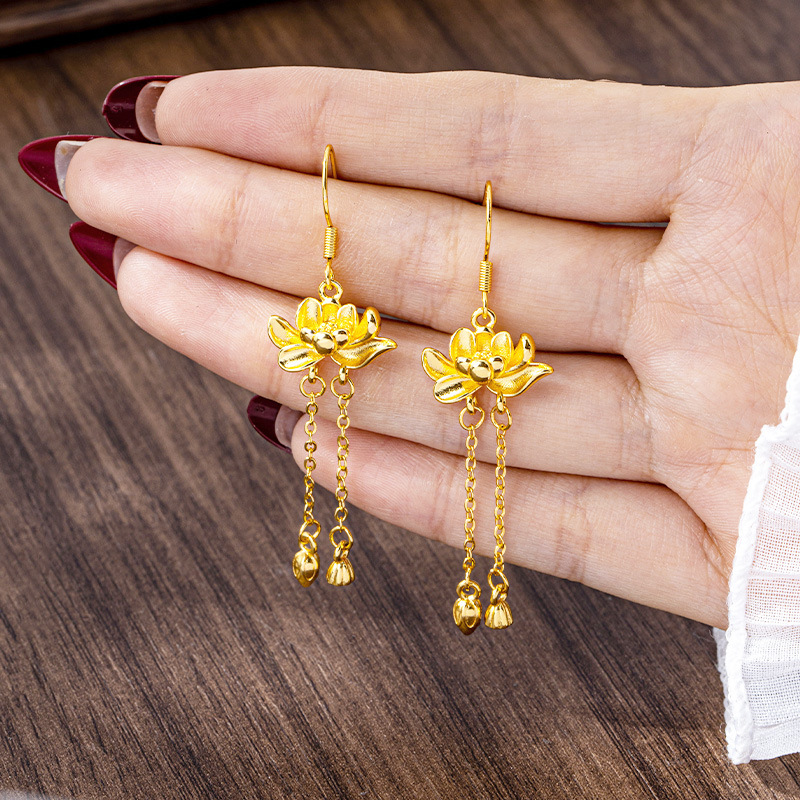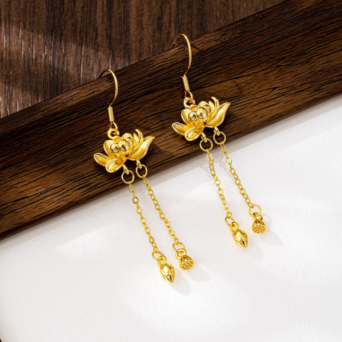 trendy palace style bud tassel ear hook women's ancient style alluvial gold three-dimensional lotus earrings retro no color fading jewelry 中文版
