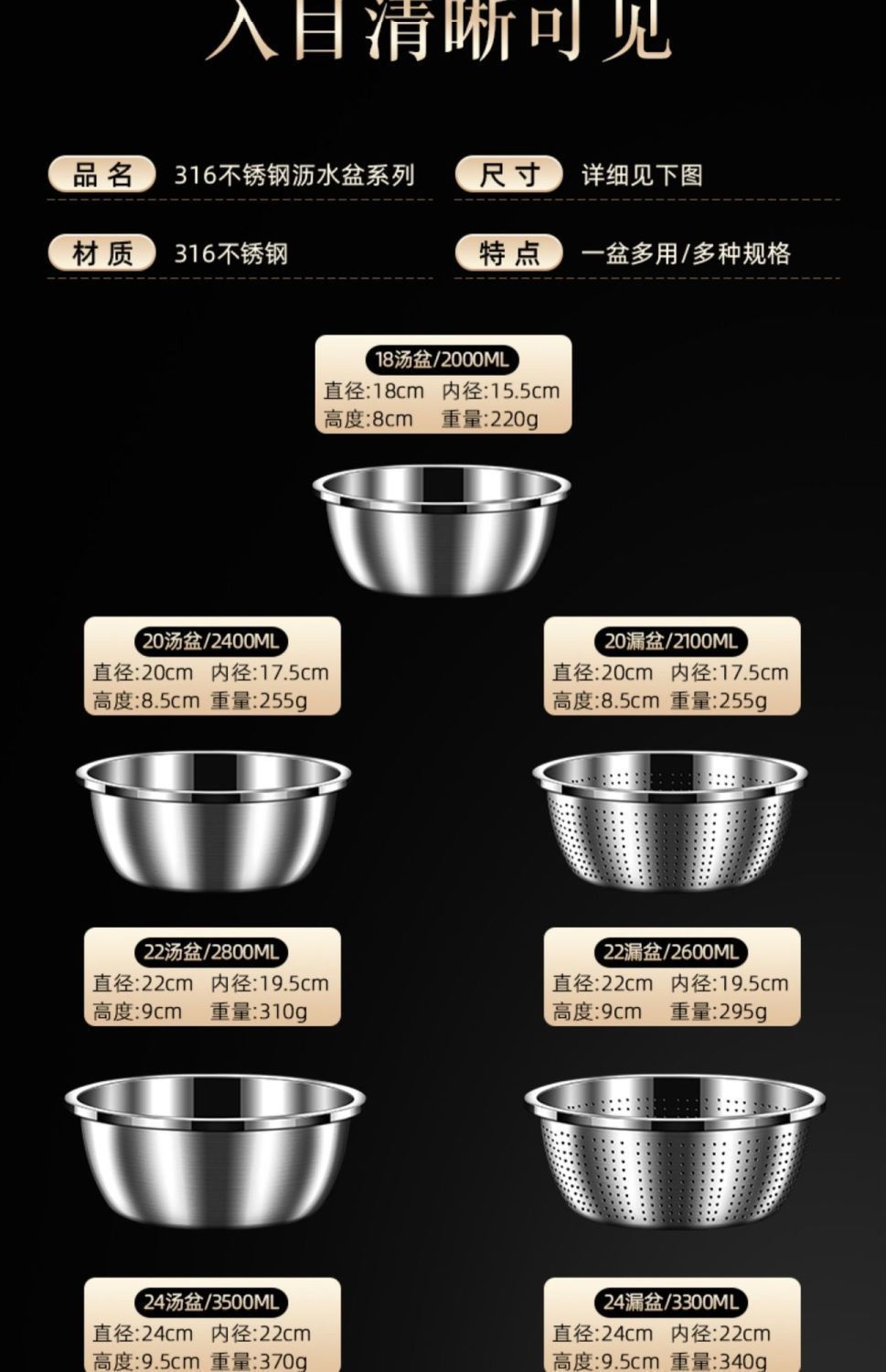 316 grade stainless steel solid basin (strip printing)-[22cm] extra thick deepening ☆