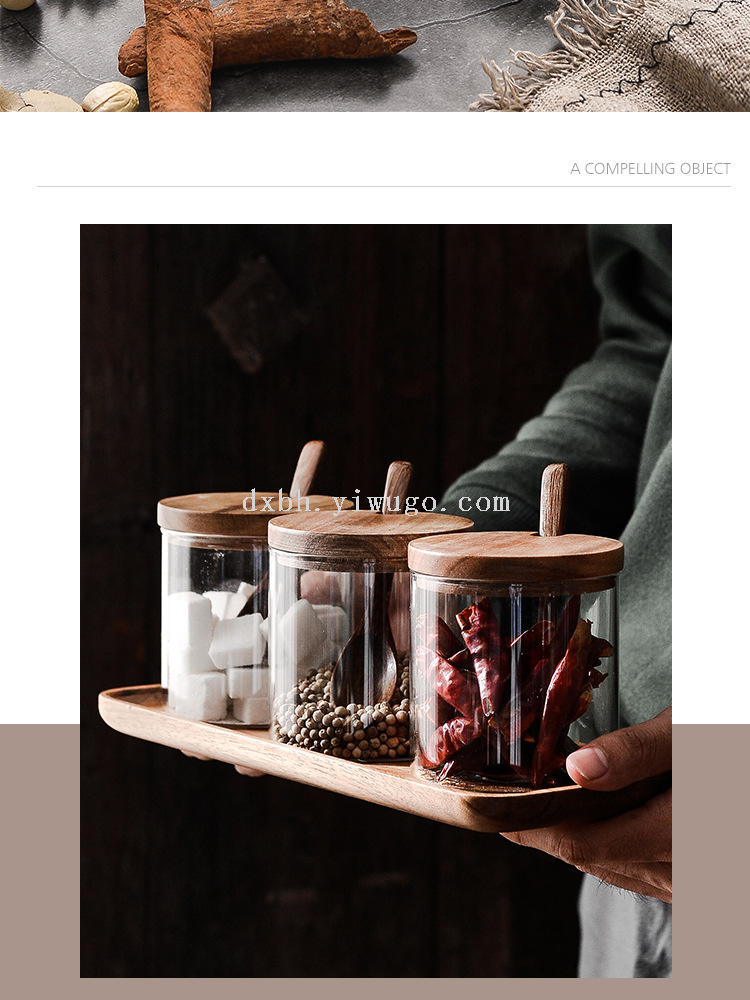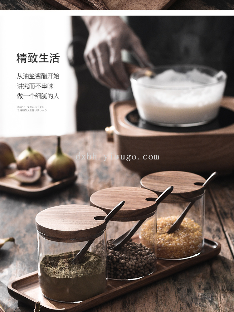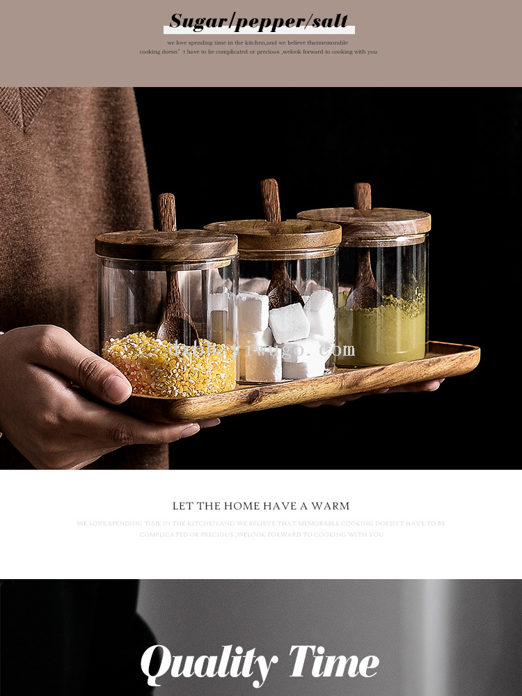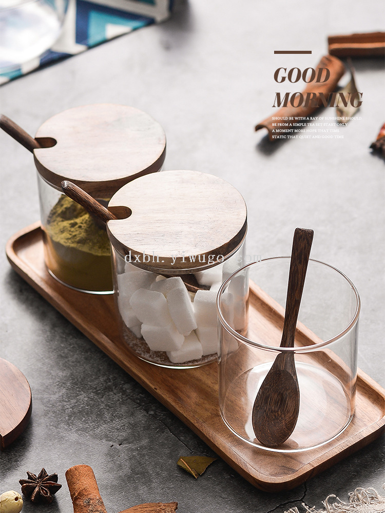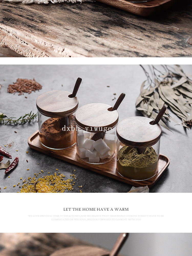 glass seasoning jar three-piece set creative kitchen utensils salt jar sucrier wooden condiment dispenser set