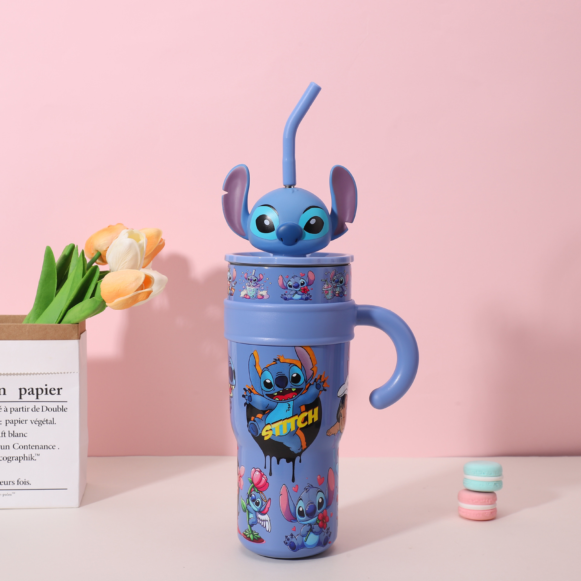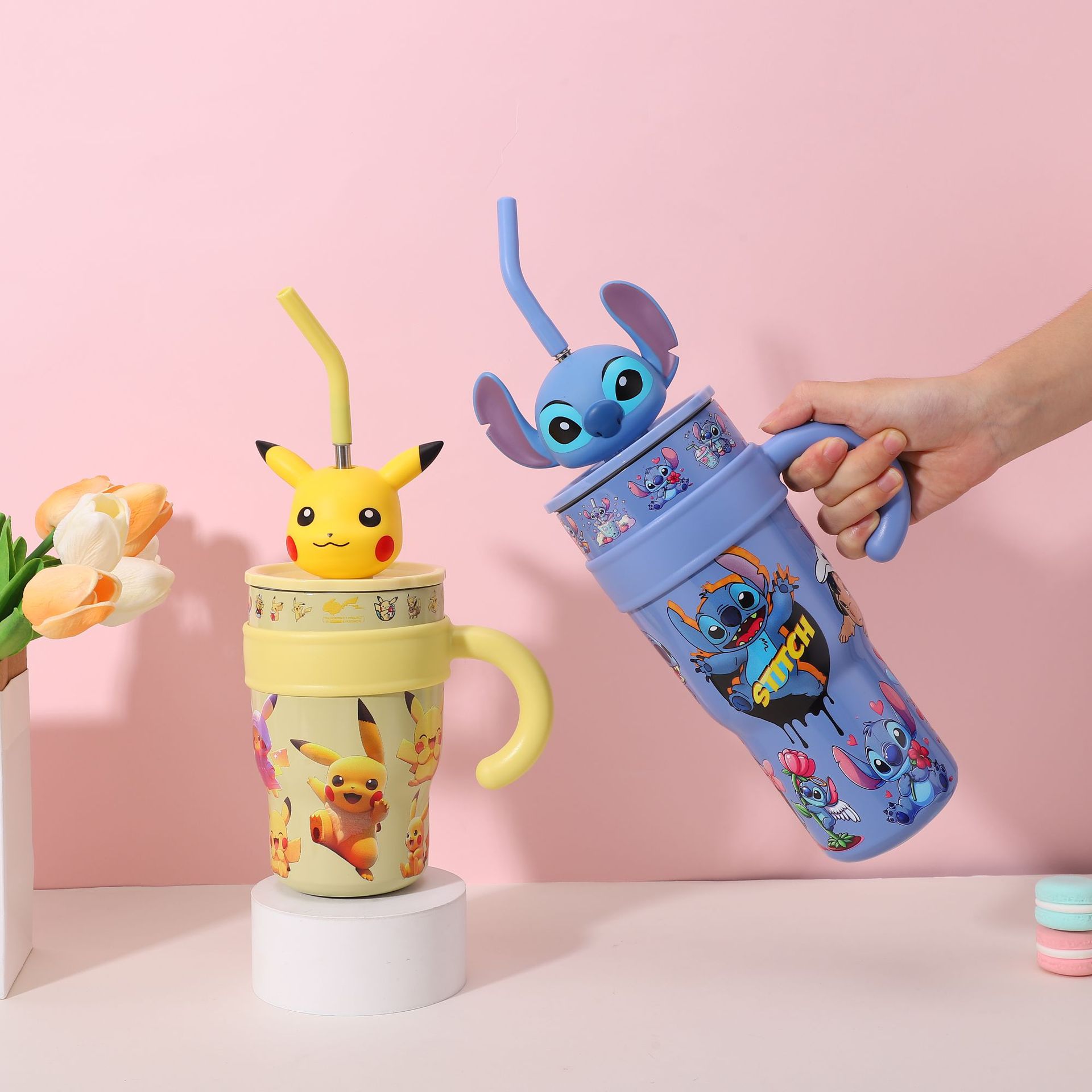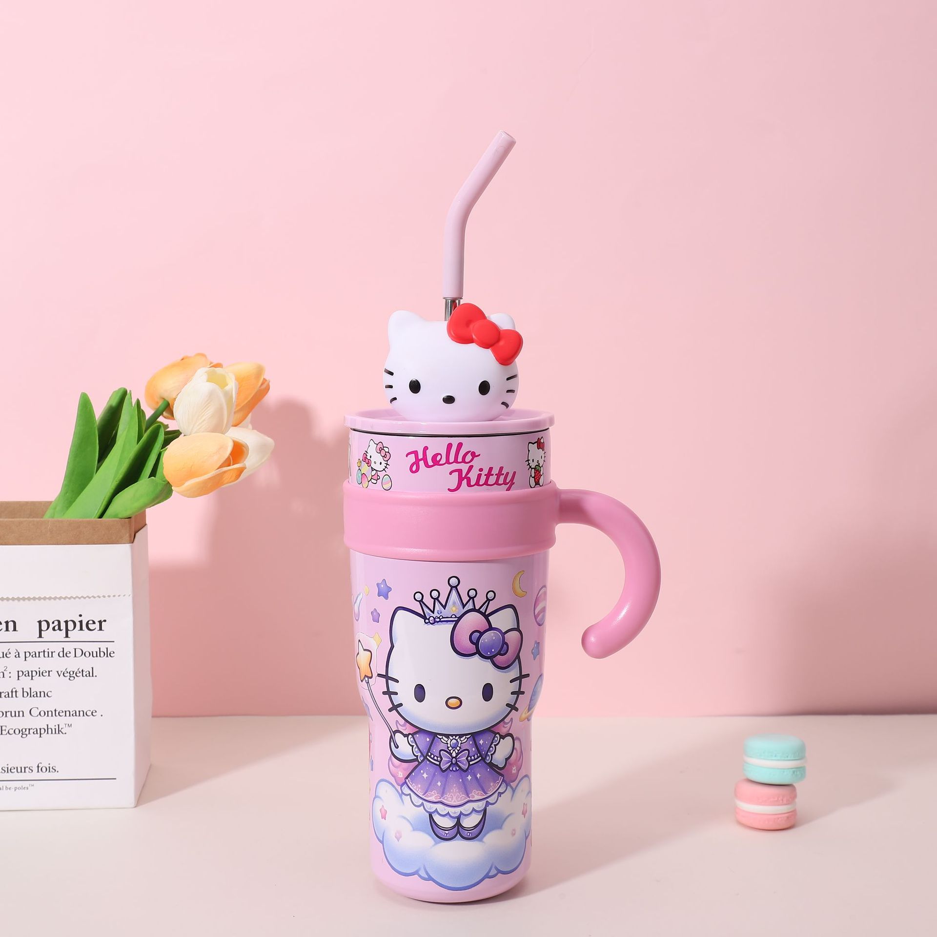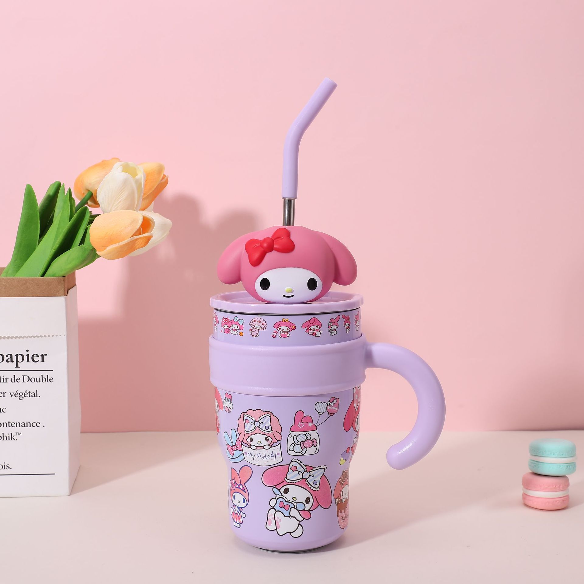 popular good-looking cute stainless steel large ice cup with handle cartoon thermal mug large capacity with straw cup