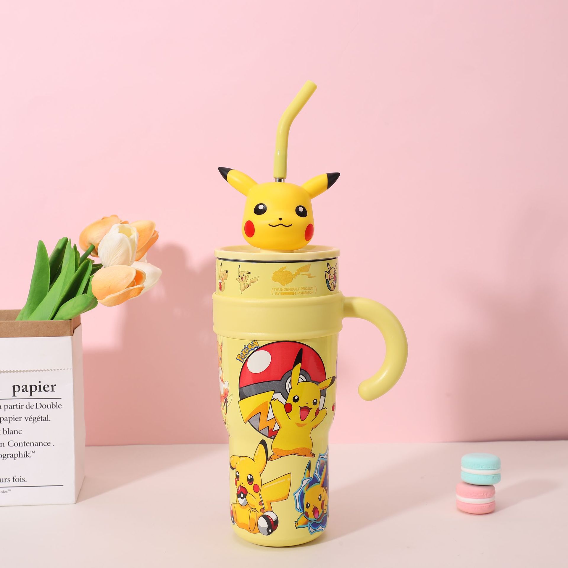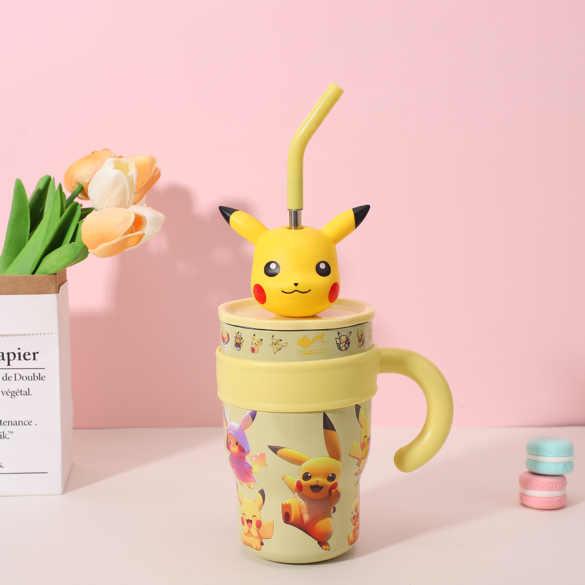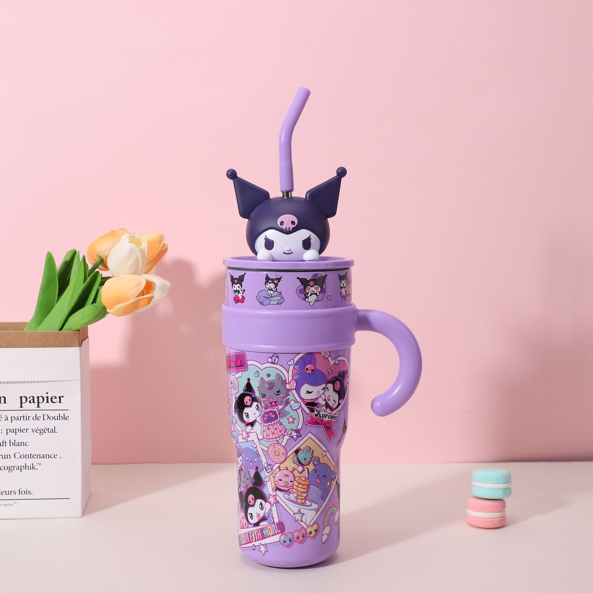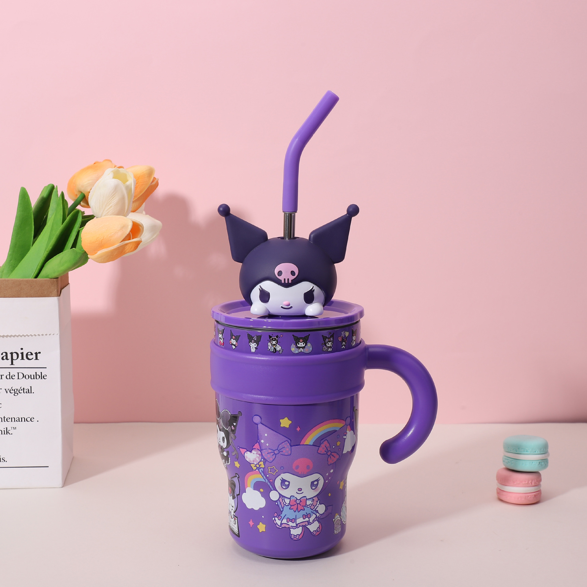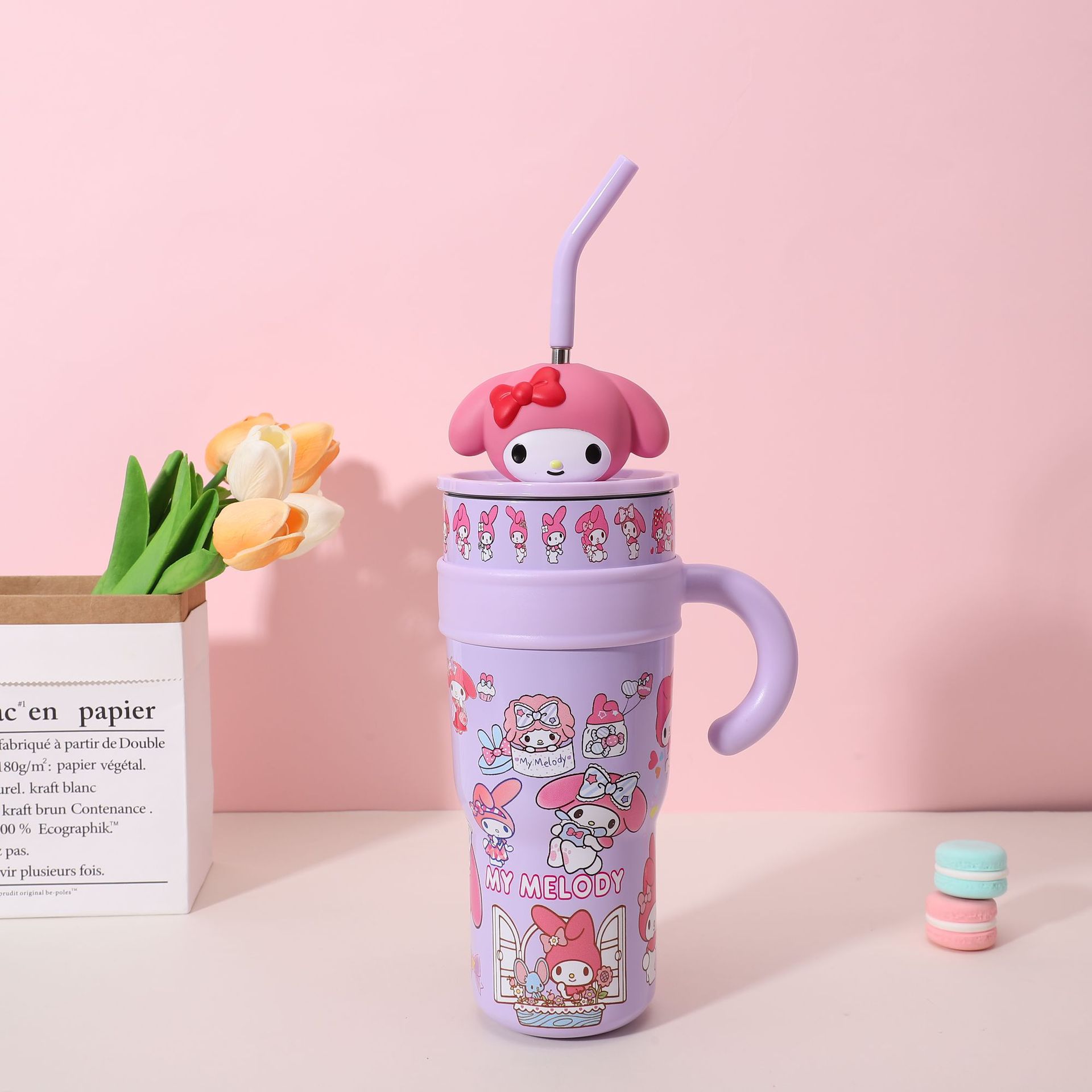 popular good-looking cute stainless steel large ice cup with handle cartoon thermal mug large capacity with straw cup