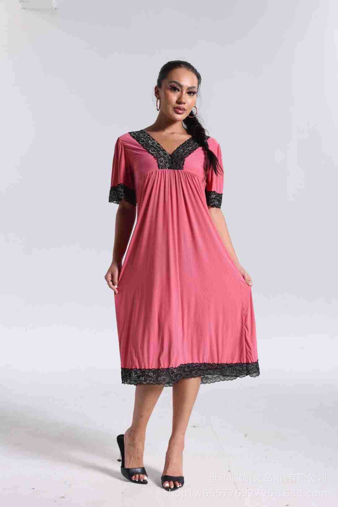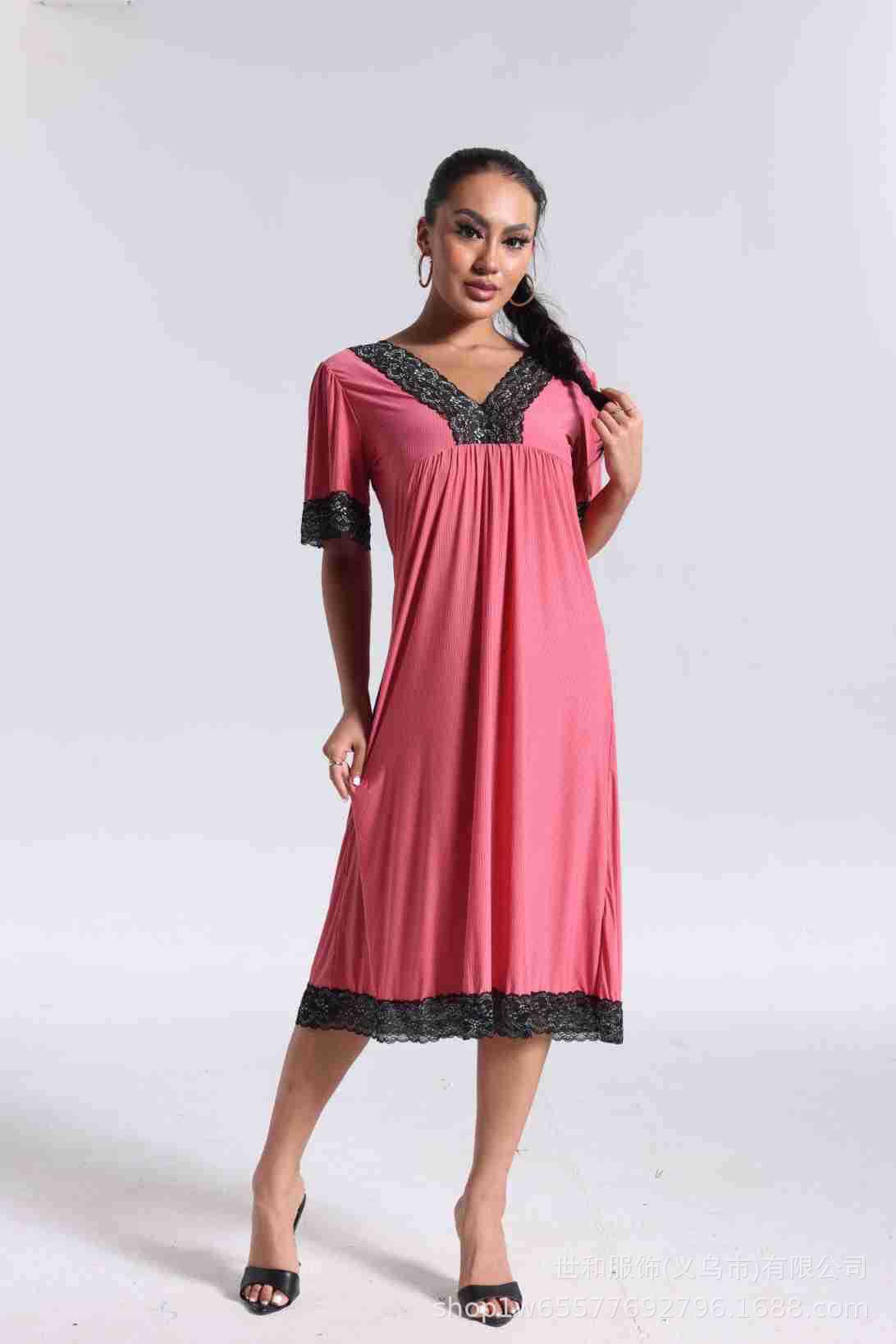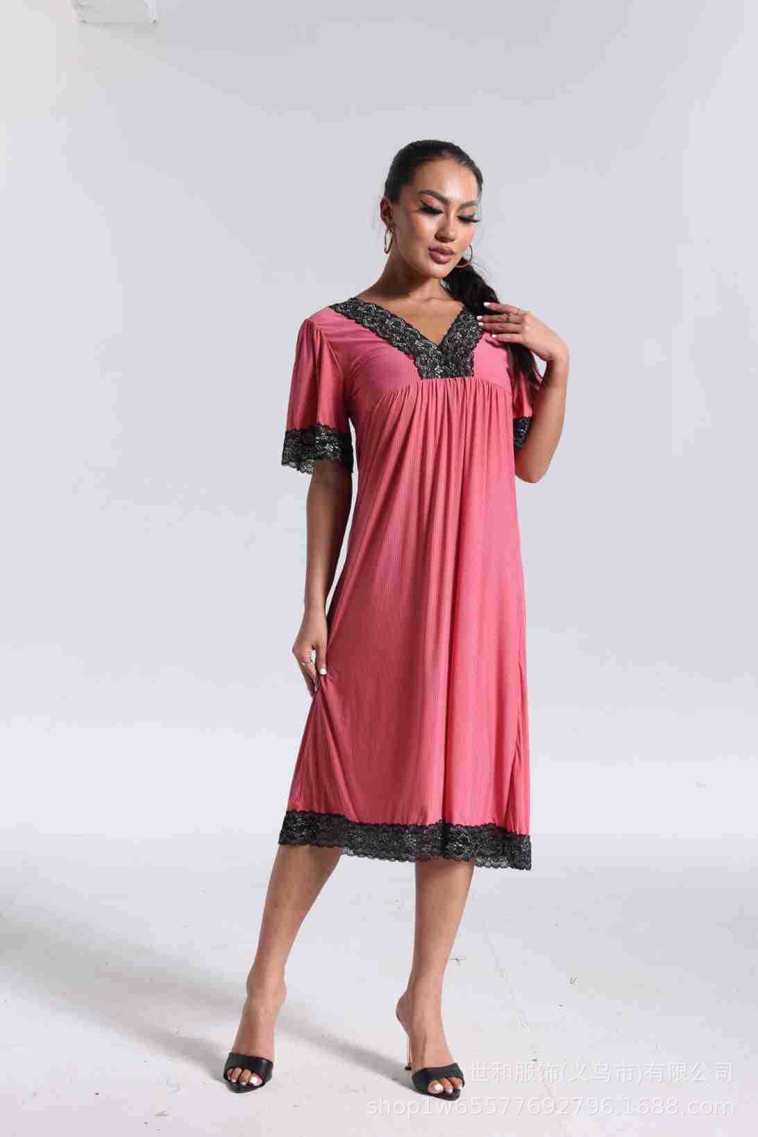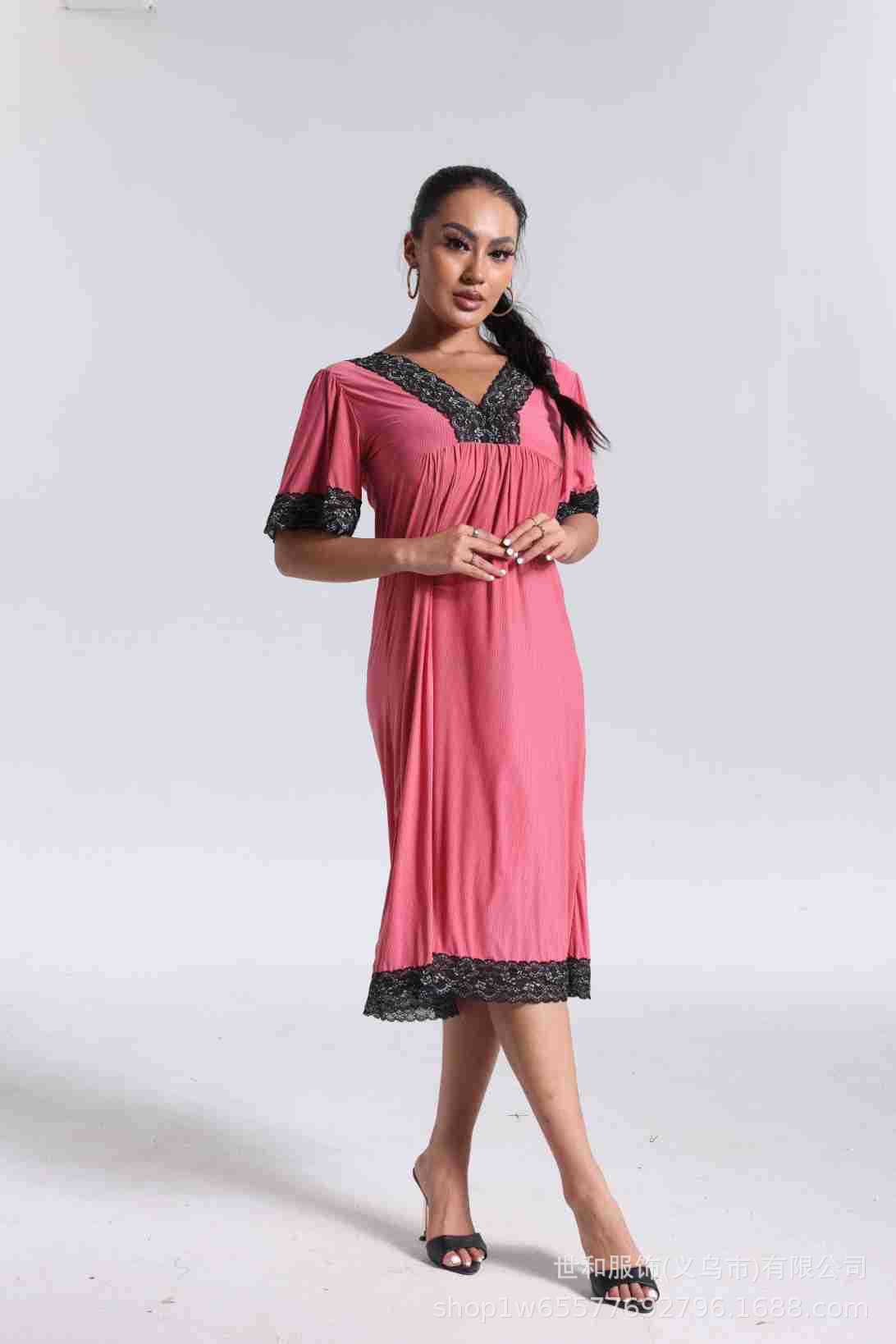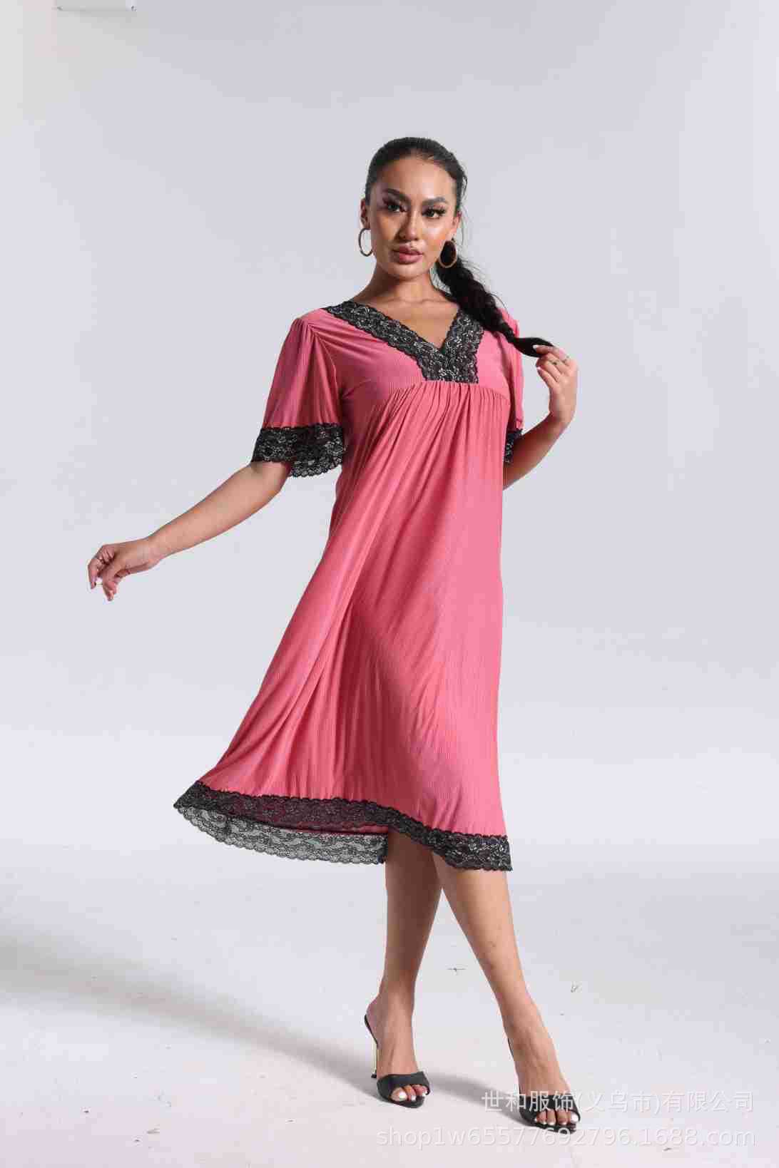 spring and summer new women's pajamas foreign trade women's large size modal stretch long lace nightdress 中文版