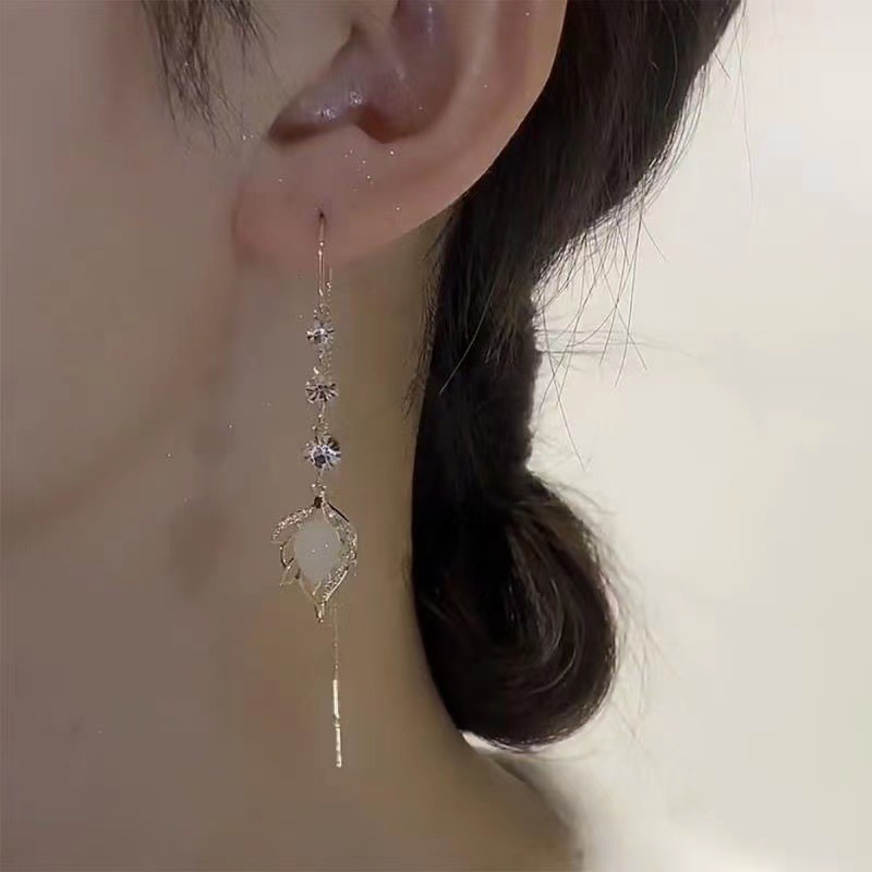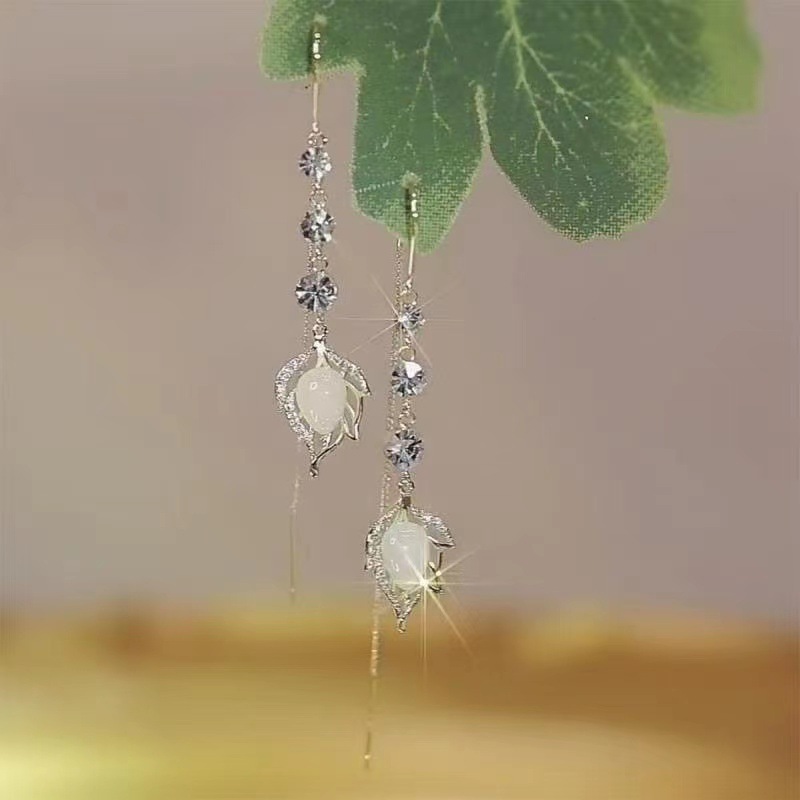 2023 new trendy niche design opal leaves hanging earrings women's long temperamental tassels slim face earrings 中文版
