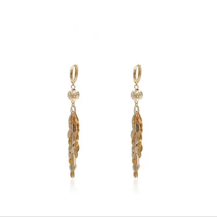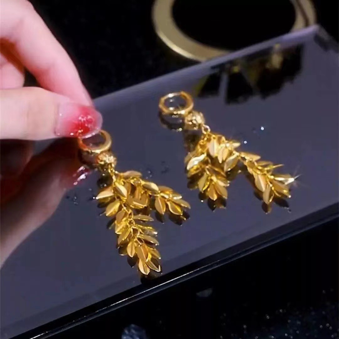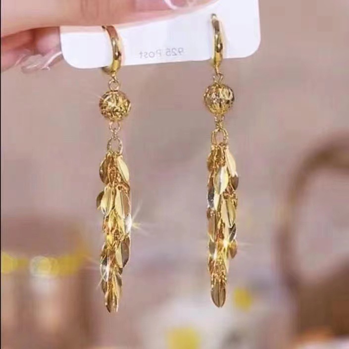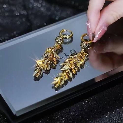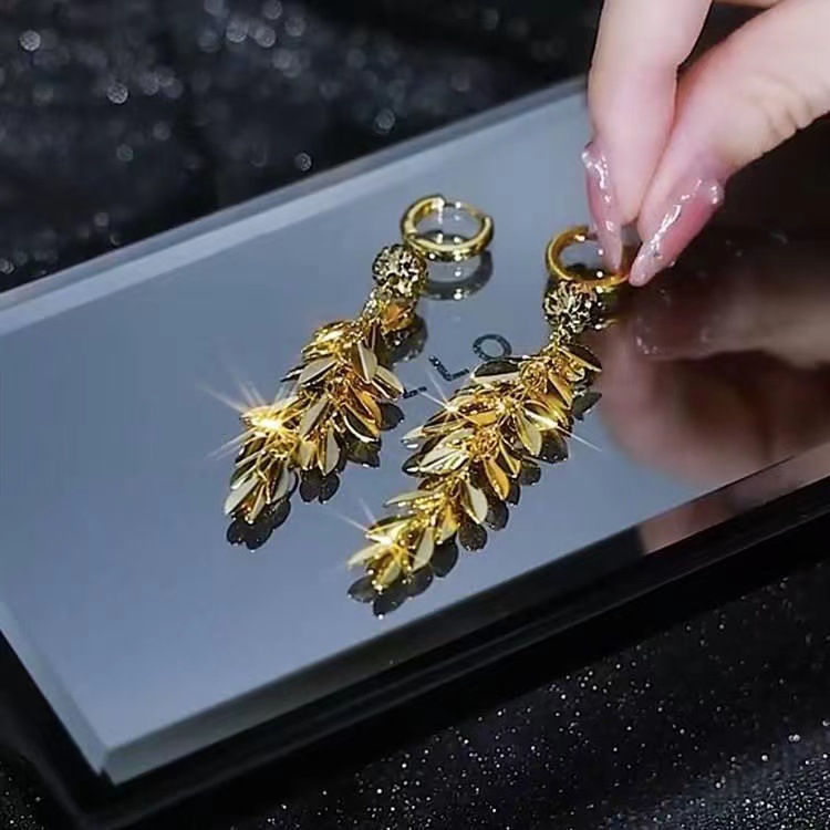 2023 fashionable stylish earrings big ear stud elegant socialite golden leaves long fringe ear button earrings slim women 中文版
