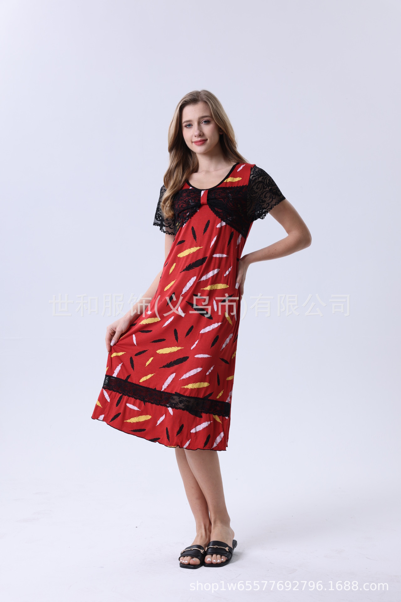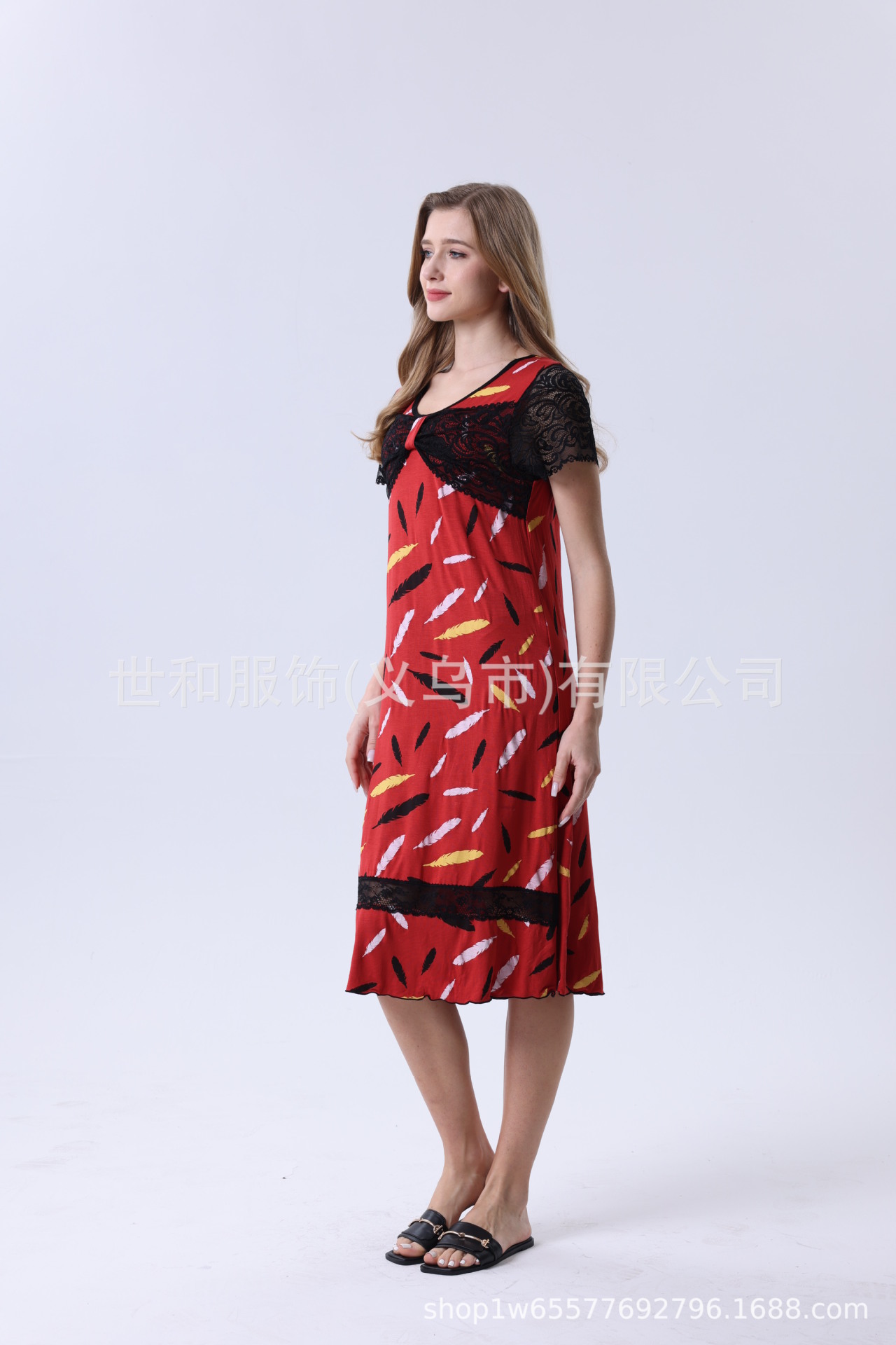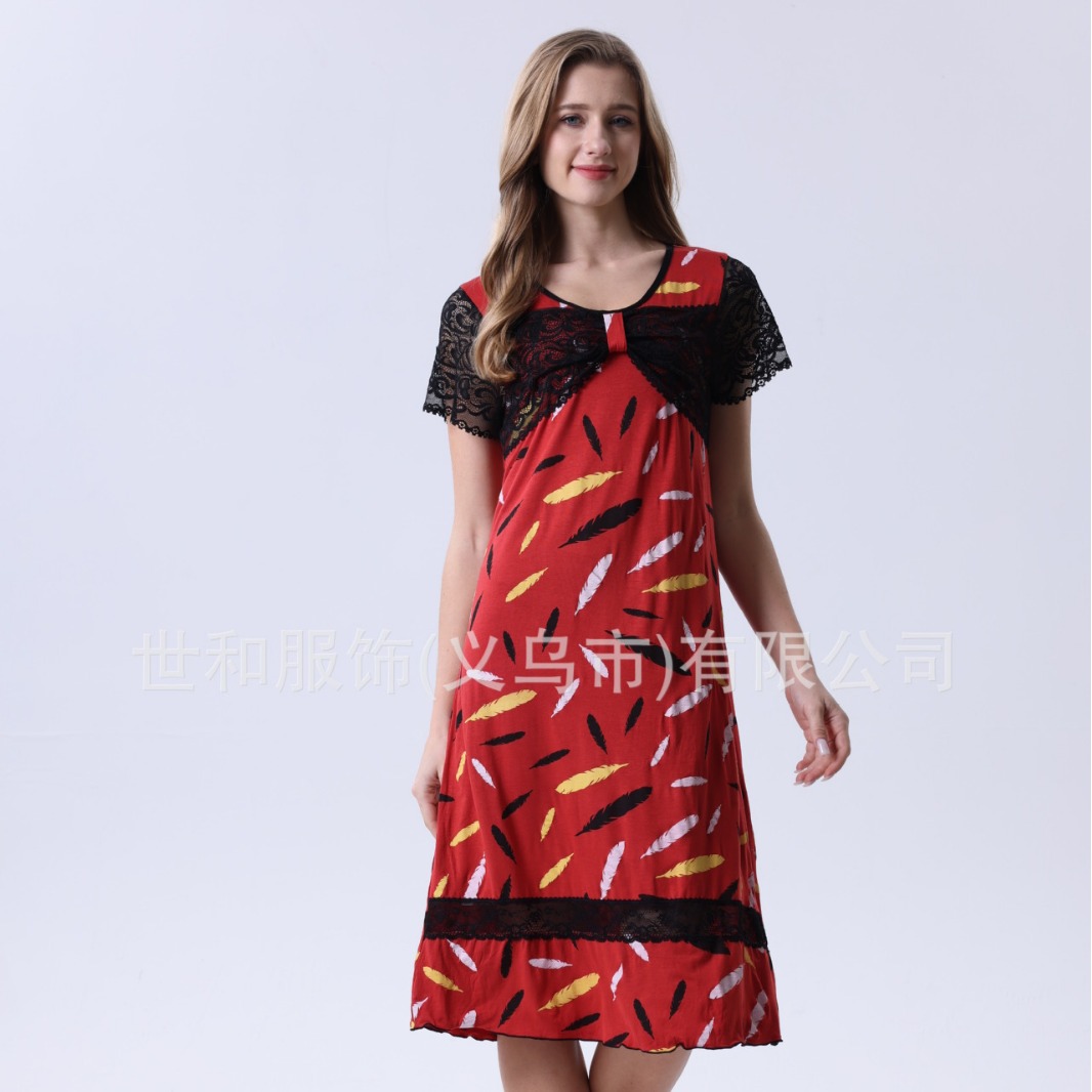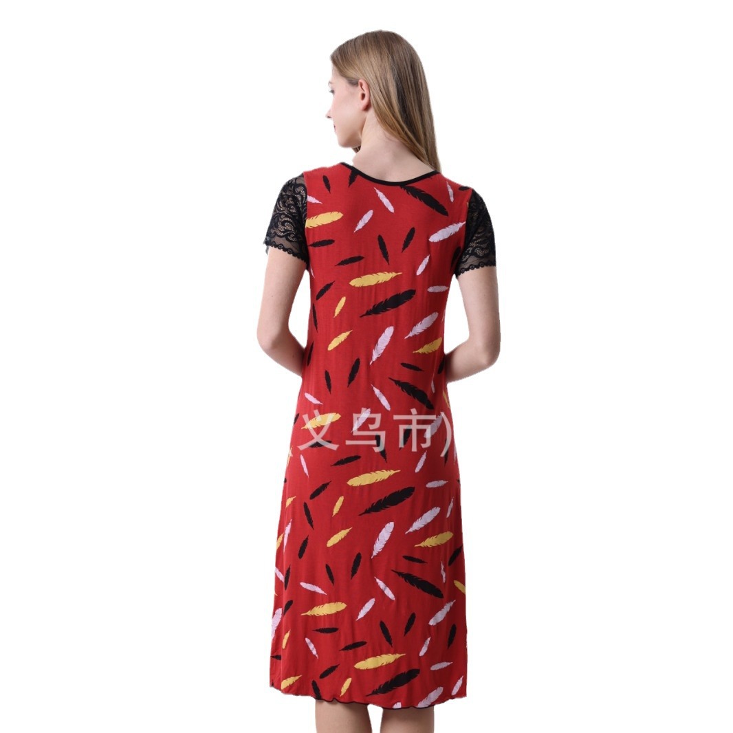 spring and summer new modal rayon women's foreign trade lace stitching short sleeve full printed nightdress 中文版