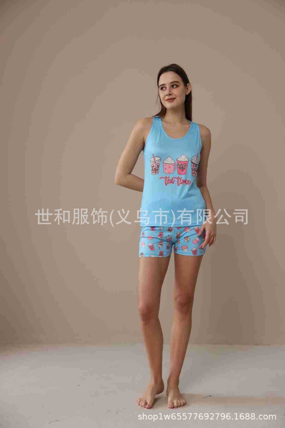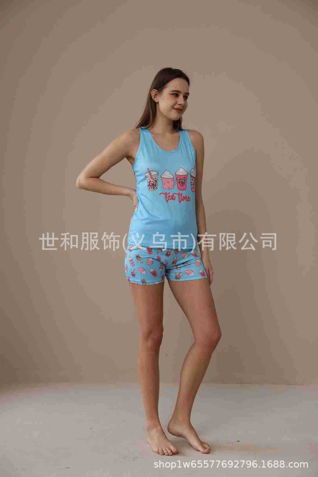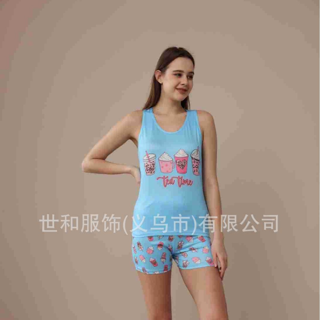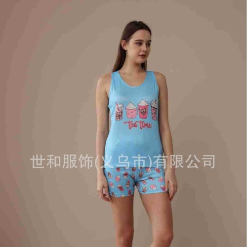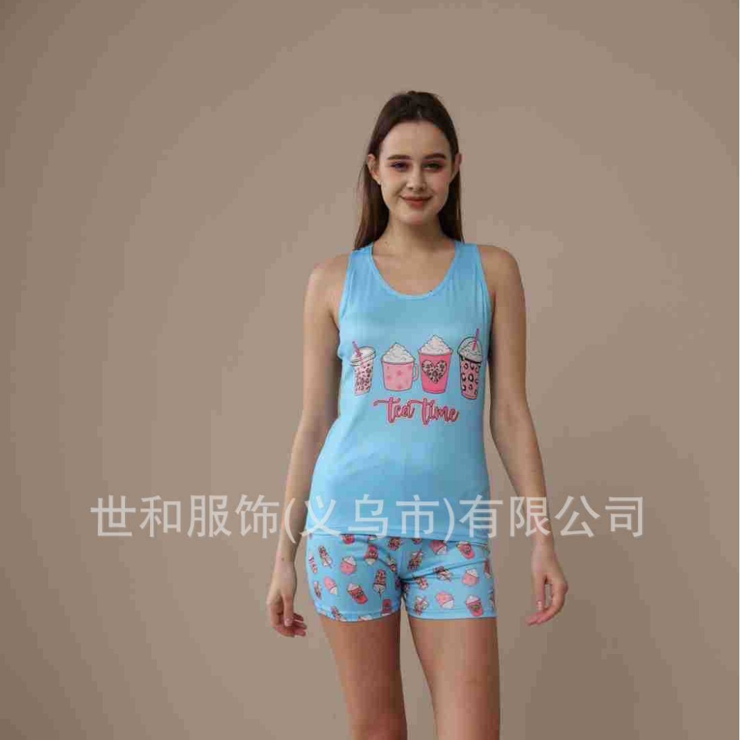 spring and summer new foreign trade women's large size printed vest shorts pajamas suit 中文版