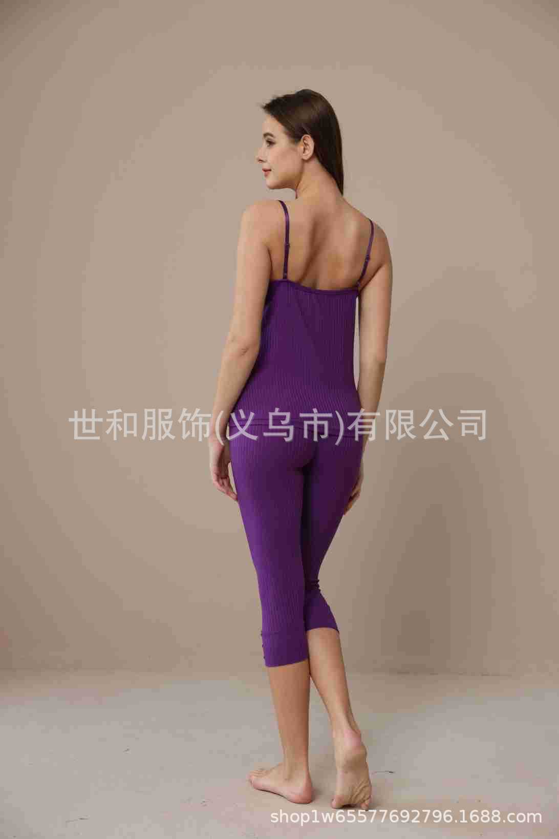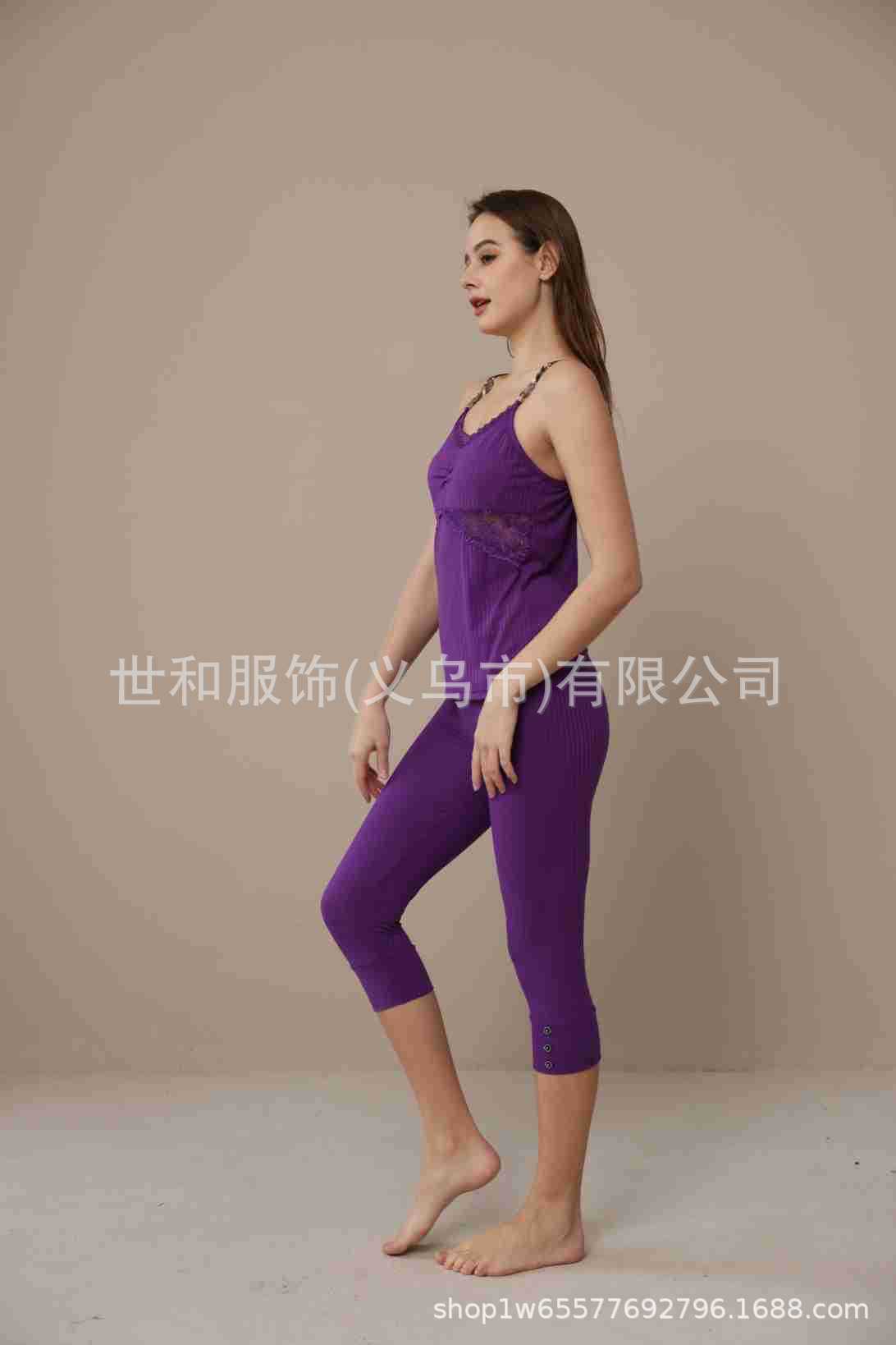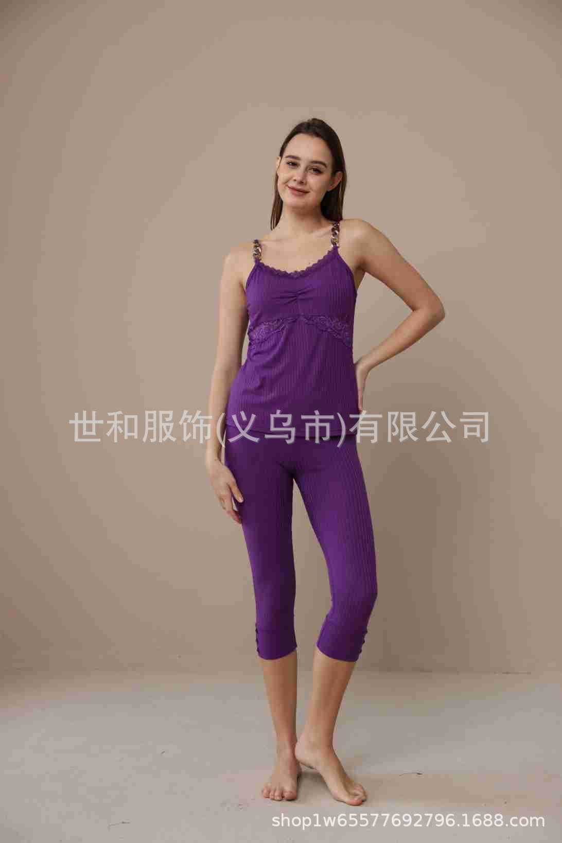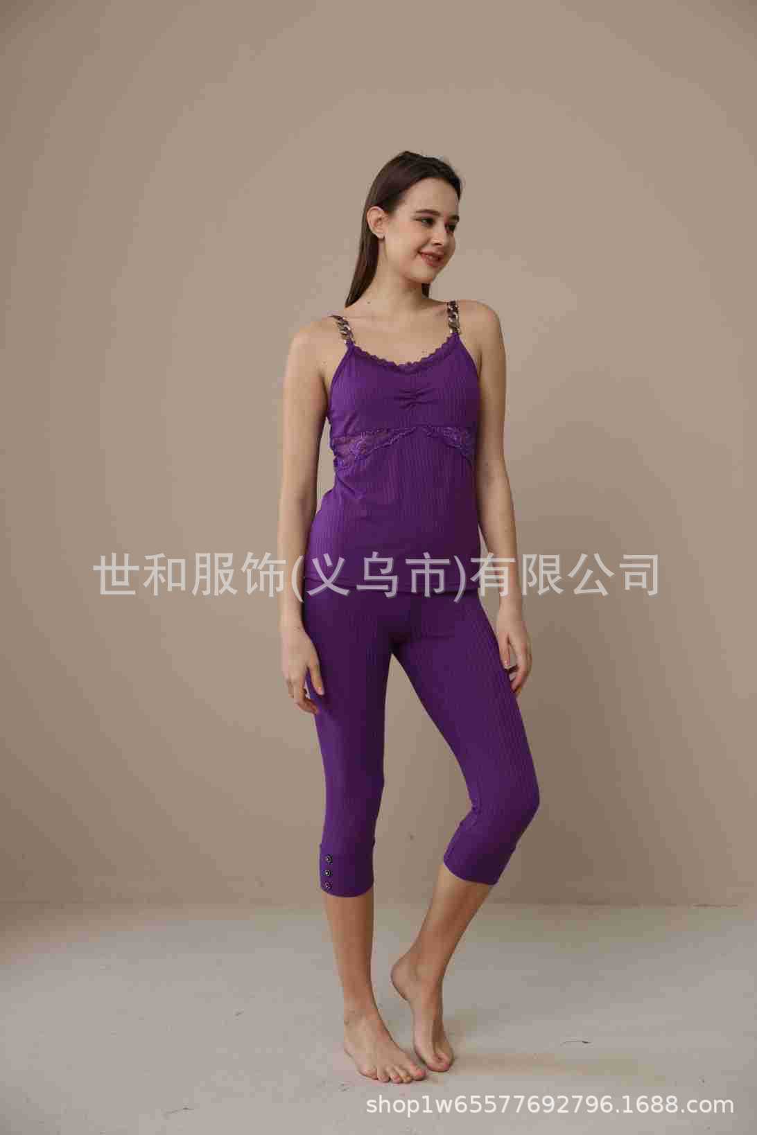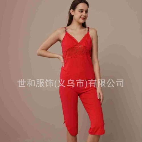 spring and summer new foreign trade women's stretch sunken stripe chain stitching spaghetti-strap strap lace cropped pants two 中文版